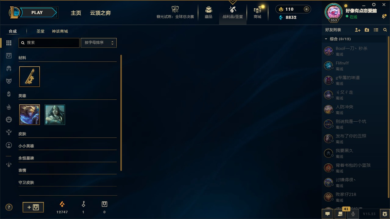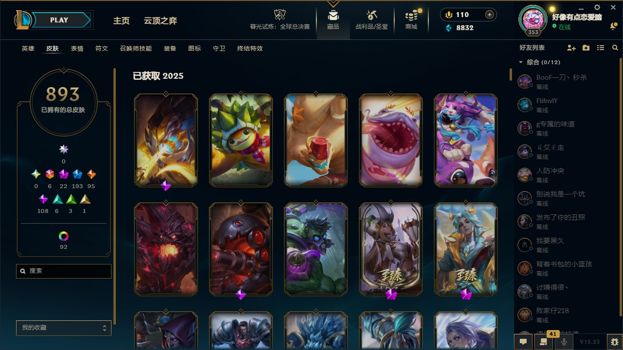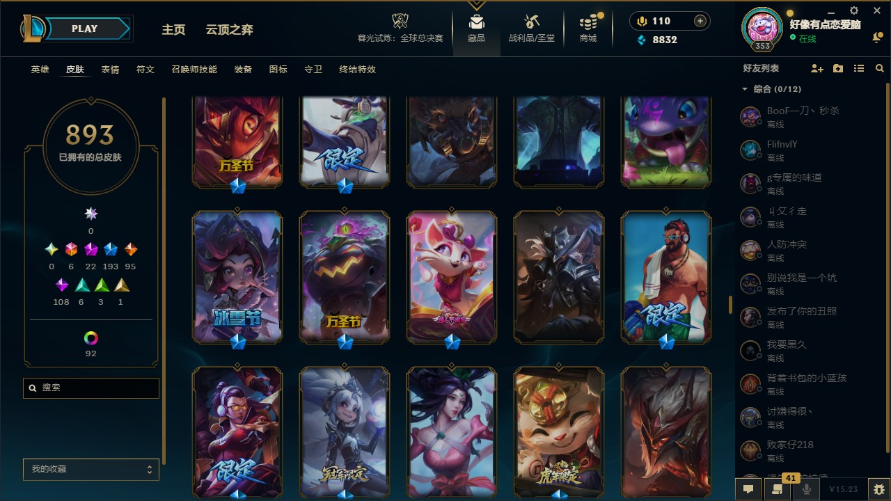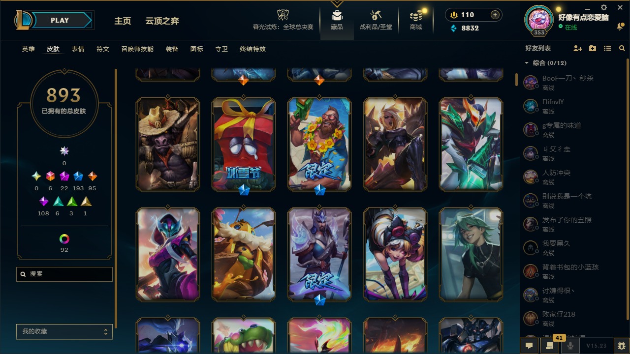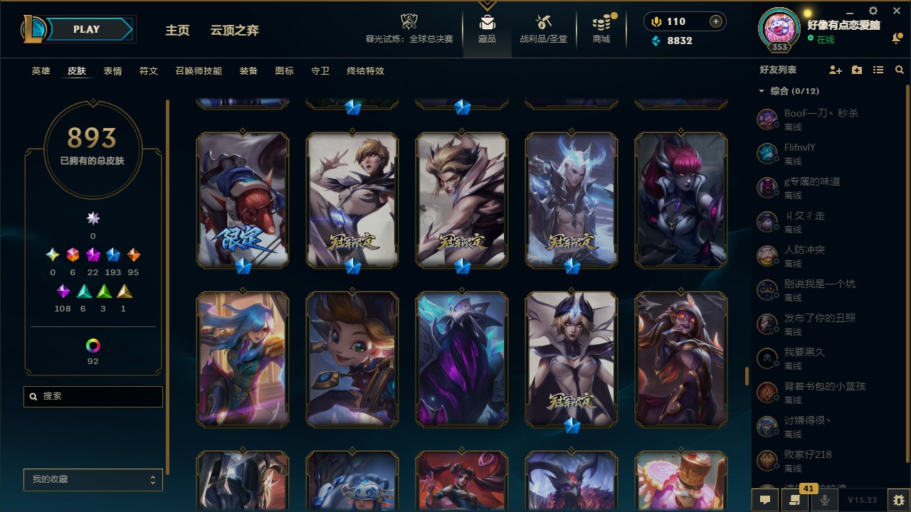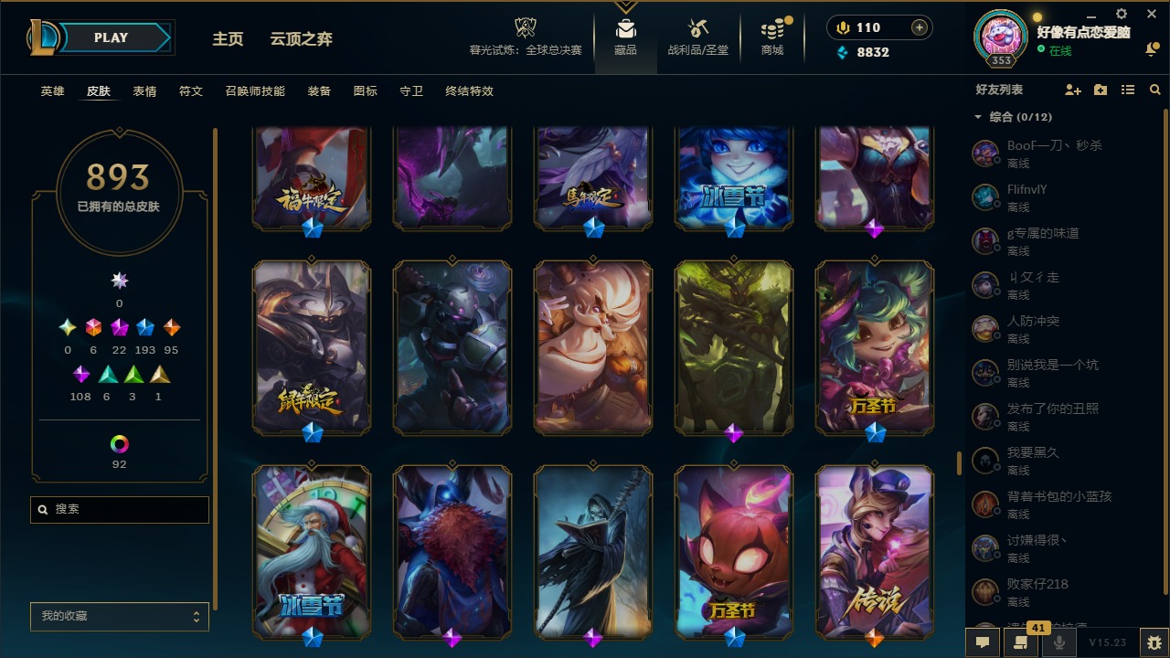 6终极 22神话 193限定 95传说 108史诗 893皮肤 128炫彩 170英雄 可二次 可修改实名 【至臻】:至臻 天龙之子 伊泽瑞尔至臻 心之钢 永恩至臻 墨之影武者 亚索至臻 k/da 卡莎至臻 魅惑女巫 厄运小姐至臻 真实伤害 奇亚娜至臻 真实伤害 赛娜至臻 暗星 墨菲