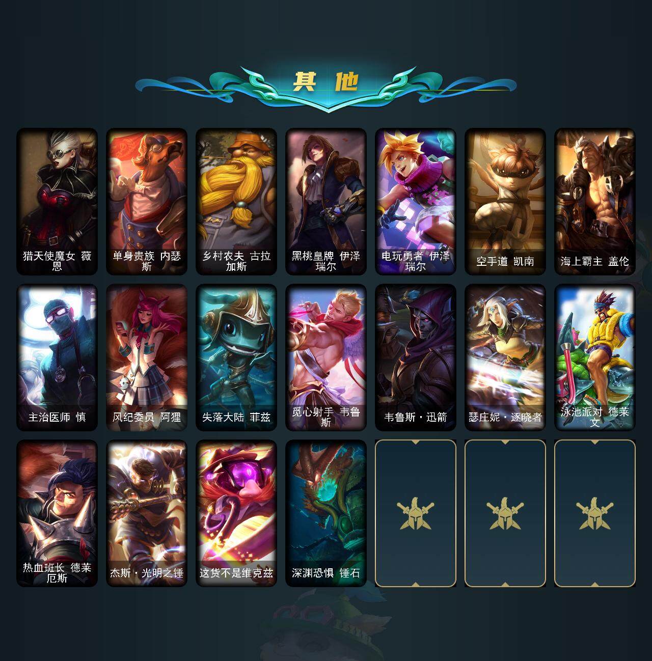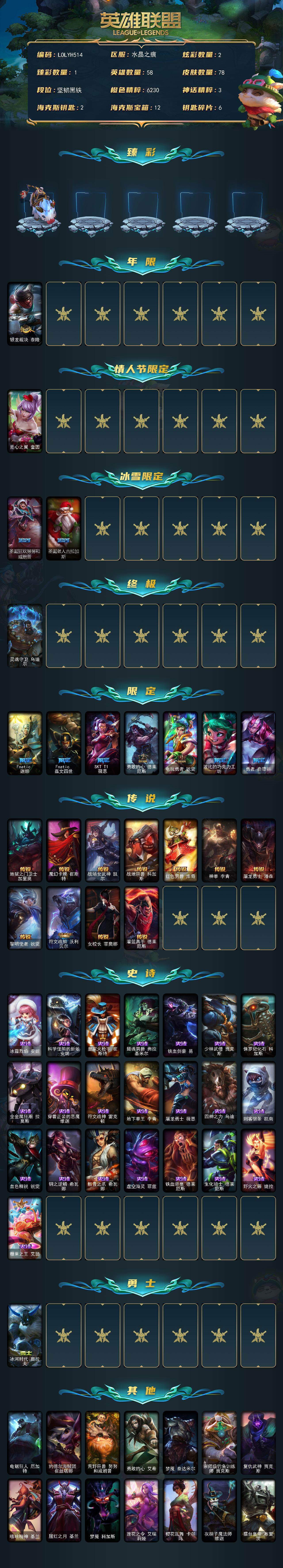 【lolyh514】58英雄/78皮肤/1终极/11限定/1臻彩/2炫彩/11传说/22史诗/未定级/无畏骑士瑟庄妮赤子初心/银龙裁决泰隆/觅心之翼奎因/圣诞狂欢努努和威朗普/圣诞老人古拉加斯/灵魂守卫乌迪尔/fnatic迦娜/fnatic嘉文四世/sktt1薇恩/勇敢的心德莱厄斯/电玩勇者锐雯/波比的巧克力工坊/勇者奈德丽/地狱之门卫士加里奥/魔幻卡牌崔斯特/战场女武神凯尔/战地巨兽科加斯/红色男爵库奇/神拳李青/屠龙勇士潘森/黎明使者锐雯/符文战熊沃利贝尔/女校长菲奥娜/灌篮高手德莱厄斯/冰霜烈焰安妮/科学怪熊的新娘安妮/皇家火呛手崔斯特/摄魂男爵弗拉基米尔/铁血剑豪易/少林武僧贾克斯/侏罗纪化石科加斯/全金属狂潮拉莫斯/穿着正装的恶魔维迦/符文战神雷克顿/地下拳王李青/屠龙勇士薇恩/四神之力乌迪尔/刺客信条凯南/血色精锐锐雯/钢之逆鳞希瓦娜/骸骨之爪希瓦娜/虚空海灵菲兹/铁血帝皇德莱厄斯/生化骑士德莱厄斯/野火之藤婕拉/糖果之王艾翁/冰河时代奥拉夫/电锯狂人厄加特/约德尔海贼团崔丝塔娜/荒野巨兽努努和威朗普/勇敢的心艾希/梦魇泰达米尔/宗师级钓鱼训练师贾克斯/复仇武神贾克斯/嘻哈精神基兰/腥红之月基兰/梦魇科加斯/莲花之令艾瑞莉娅/樱花乱舞卡尔玛/灰胡子魔法师维迦/擂台皇帝布里茨/猎天使魔女薇恩/单身贵族内瑟斯/乡村农夫古拉加斯/黑桃皇牌伊泽瑞尔/电玩勇者伊泽瑞尔/空手道凯南/海上霸主盖伦/主治医师慎/风纪委员阿狸/失落大陆菲兹/觅心射手韦鲁斯/韦鲁斯迅箭/瑟庄妮逐晓者/泳池派对德莱文/热血班长德莱厄斯/杰斯光明之锤/这货不是维克兹/深渊恐惧锤石