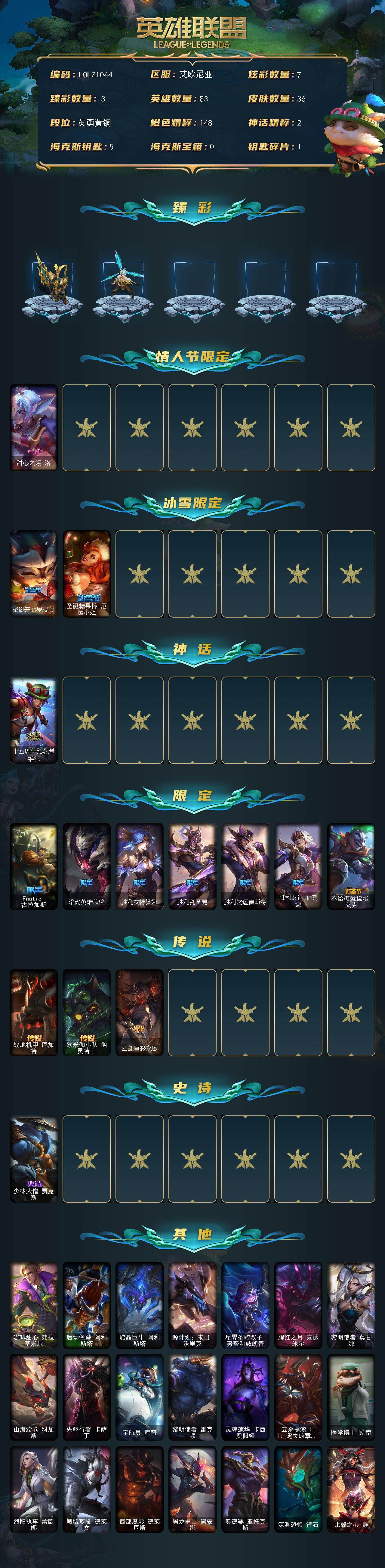 【lolz1044】83英雄/36皮肤/1神话/10限定/3臻彩/7炫彩/3传说/1史诗/青铜/吕布奉先炫金战神/冰霜之刃艾瑞莉娅炫金/幽梦玫瑰辛德拉纯洁花蕾/甜心之翎洛/圣诞开心鬼提莫/圣诞糖果棒女呛/十五周年纪念希维尔/s1fnc酒桶/暗裔英雄盖伦/胜利女神娑娜/胜利剑圣易/胜利之运崔斯特/胜利女神菲奥娜/不给糖就捣蛋艾克/战地机甲厄加特/欧米伽小队幽灵特工/西部魔影永恩/少林武僧贾克斯/