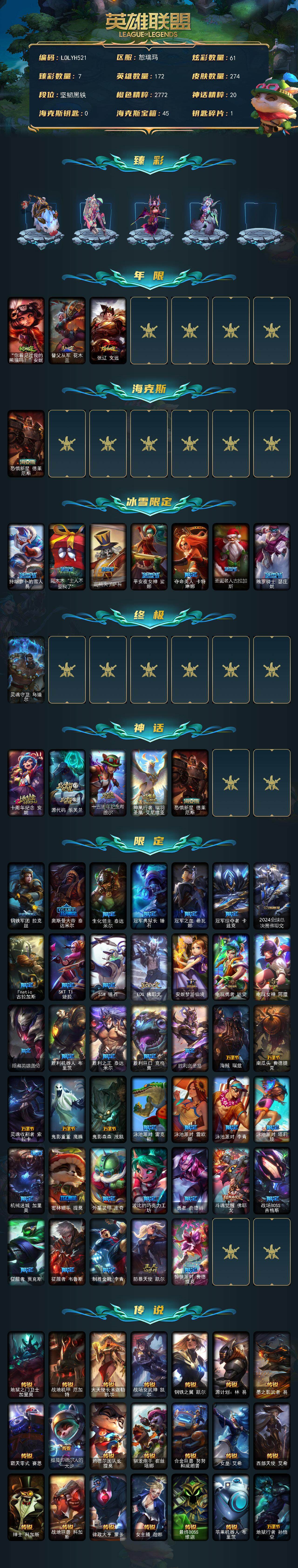 【lolyh521】172英雄/274皮肤/1终极/5神话/50限定/7臻彩/61炫彩/34传说/60史诗/未定级/无畏骑士瑟庄妮赤子初心/幻灵战斗猫金克丝梦幻强袭/星之吞噬者莫甘娜热情之末/咖啡甜心格温酒醉樱桃/魔女阿卡丽虚荣/净雪之月莫甘娜冬虹/这货不是银狐库奇/你看见过我的熊猫吗安妮/替父从军花木兰/张辽文远/恐惧新星德莱厄斯/持胡萝卜的雪人易/阿木木“主人不要我了”/胡桃夹子萨科/平安夜女神娑娜/夺命美人卡特琳娜/圣诞老人古拉加斯/魄罗骑士瑟庄妮/灵魂守卫乌迪尔/十周年纪念安妮/源代码乐芙兰/十五周年纪念希维尔/神凰行者瑞羽圣凰艾尼维亚/钢铁军团拉克丝/奥斯曼大帝泰达米尔/生化领主泰达米尔/冠军典狱长锤石/冠军之血希瓦娜/冠军掠夺者卡兹克/2024全球总决赛佛耶戈/fnatic古拉加斯/sktt1婕拉/ssw锤石/edg佛耶戈/安妮梦游仙境/电玩勇者锐雯/电玩女神阿狸/暗裔英雄盖伦/胜利机器人布里茨/胜利之王泰达米尔/胜利巨口克格莫/胜利剑圣易/海贼瑞兹/南瓜头费德提克/灵魂收割者索拉卡/鬼影重重魔腾/鬼影森森茂凯/泳池派对雷克顿/泳池派对蕾欧娜/泳池派对李青/泳池派对塔莉垭/机械迷城加里奥/密林猎手提莫/外星装甲库奇/波比的巧克力工坊/勇者奈德丽/斗魂觉醒佛耶戈/战场boss吉格斯/征服者贾克斯/征服者韦鲁斯/制胜金靴李青/防暴天使凯尔/惊悚派对费德提克/地狱之门卫士加里奥/战地机甲厄加特/大天使长米迦勒凯尔/战场女武神凯尔/钢铁之翼凯尔/源计划林易/墨之影武者易/霸天零式赛恩/提莫约德尔人的一大步/约德尔国队长提莫/驯龙炮手崔丝塔娜/合金巨兽努努和威朗普/女皇艾希/西部天使艾希/绅士科加斯/战地巨兽科加斯/律政大亨蒙多/女主播迦娜/最终boss维迦/苹果机器人布里茨/地狱行者孙悟空/丧尸布兰德/神拳李青/神龙尊者圣龙李青/炼狱魔犬内瑟斯/神王盖伦/月蚀骑士蕾欧娜/女校长菲奥娜/霸天异形卡兹克/灌篮高手德莱厄斯/神王德莱厄斯/星之守护者卡莎/西部魔影卢锡安/天煞劫/翼骑统领赵信/屠龙勇士赵信/铁血剑豪易/战争机器赛恩/钢铁之心希维尔/圣洁化身索拉卡/源代码索拉卡/炼金狂士辛吉德/死神卡尔萨斯/卡尔萨斯祸害之光/贵族血统萨科/飞越疯人院萨科/穿着正装的恶魔维迦/绝代智将斯维因/抵抗军天使凯特琳/霸天巨兽墨菲特/蓝焰梦魔魔腾/暗星嘉文四世/v字仇杀者布兰德/防弹武僧李青/至高之拳李青/地下拳王李青/苍穹之光薇恩/法老王朝内瑟斯/四神之力乌迪尔/血色之锤波比/星之守护者波比/飞车暴走族古拉加斯/钢铁意志潘森/大夏武士潘森/银色之牙阿卡丽/铁血女忍阿卡丽/铁甲雄心盖伦/深海怪鱼克格莫/腥红之月鬼武者慎/白色死神韦鲁斯/夜鸦菲奥娜/驯龙女巫璐璐/暗星卡兹克/铁血帝皇德莱厄斯/暗黑女武神黛安娜/腥红之月黛安娜/野火之藤婕拉/萌侦探喵尔摩斯/源计划风亚索/腥红之月亚索/战地机甲维克兹/猛虎布隆/西部牛仔烬/五星大厨塔姆/职业杀手卢锡安/冲击之刃劫/源计划阴劫/爵士克烈/源计划自由艾克/霓虹杀拳蔚/炼狱魔女蔚/霸天剑魔亚托克斯/腥红之月锤石/暮星之羽霞/霹雳游侠弗拉基米尔/拆弹专家黑默丁格/冰河时代奥拉夫/创意工坊黑默丁格/屠龙勇士奥拉夫/幽蓝梦魇加里奥/赌侠崔斯特/皇家守卫赵信/深渊巨蟹厄加特/电锯狂人厄加特/波江星神弗拉基米尔/幽魂费德提克/钢铁审判官凯尔/玉剑传说无极/金牛座阿利斯塔/斗牛士阿利斯塔/宗师级法师训练师瑞兹/武仙座海格力斯赛恩/森林女神索拉卡/荒野巨兽努努和威朗普/脏兮兮努努和威朗普/西部牛仔厄运小姐/复仇武神贾克斯/玉剑传说苍鸾/遗迹守护者基兰/科学狂人辛吉德/假面女皇伊芙琳/北风冻原图奇/黑金诱惑图奇/绝影神偷图奇/自由女神卡尔萨斯/重甲猎鹰艾尼维亚/恐怖之源萨科/缪斯女神娑娜/虚空前世卡萨丁/幽灵船长普朗克/海牛骑手库奇/樱花乱舞卡尔玛/奥德赛卡尔玛/绿水晶光辉塔里克/紫水晶意志塔里克/冰壶选手维迦/垃圾场特朗德尔/巡逻警官特朗德尔/创世之神特朗德尔/净雪之月凯特琳/战场boss布里茨/暮色呛骑布里茨/珊瑚礁墨菲特/红牌退场卡特琳娜/闭月之颜貂蝉/古神魔腾/猛龙雷克顿/黯晶巨鳄雷克顿/银河魔装机神伊莉丝/黑色玫瑰假面舞会伊莉丝/黑夜使者李青/摩登骇客薇恩/战地机甲内瑟斯/法国女仆奈德丽/狮子星神奈德丽/灵之菊奈德丽/龙神之力乌迪尔/宇航员波比/乡村农夫古拉加斯/品酒大师古拉加斯/古拉加斯碎桶者/失落的世界伊泽瑞尔/地狱火莫德凯撒/五杀摇滚吉他手莫德凯撒/五杀摇滚贝斯手约里克/苍穹之光约里克/五杀摇滚iii遗失的章节约里克/刺身之拳阿卡丽/银色闪电凯南/超级英雄凯南/海上霸主盖伦/暗影王子玛尔扎哈/血色精锐泰隆/光明哨兵锐雯/毛毛虫克格莫/未来战士慎/符文生物泽拉斯/战地法师泽拉斯/失落大陆菲兹/北地风暴沃利贝尔/怒熊沃利贝尔/觅心射手韦鲁斯/地狱火韦鲁斯/失落大陆诺提勒斯/地底迷城诺提勒斯/光明骑士诺提勒斯/少校吉格斯/邪恶女巫璐璐/德莱德莱德莱文/破败军团德莱文/刃执事德莱文/幽魂骑士赫卡里姆/车骑之力赫卡里姆/热血班长德莱厄斯/战斗学院杰斯/双城之战杰斯/方块王后辛德拉/泳池派对扎克/香浓芝士扎克/这货不是维克兹/糖果大战布隆/双城之战金克丝/福牛守护者佛耶戈/五杀摇滚之噪音佛耶戈/国王佛耶戈/腥红之月劫/铁拳执事蔚/源计划裁决蔚/奥德赛亚托克斯/源代