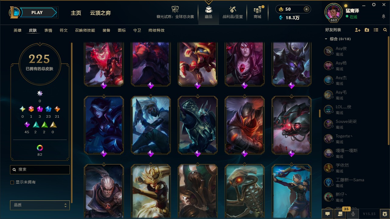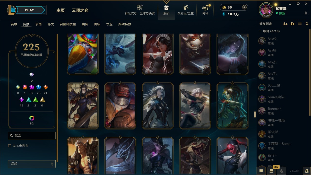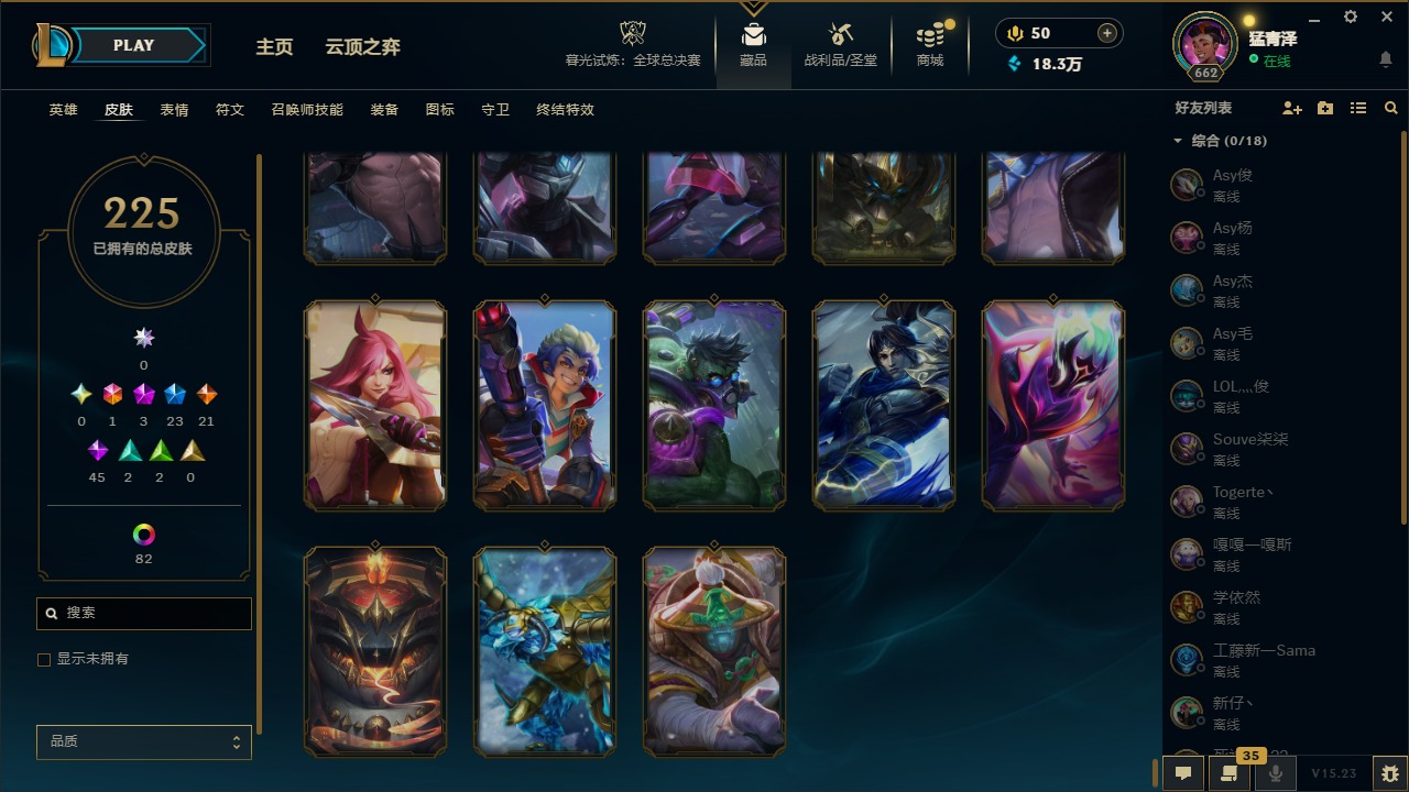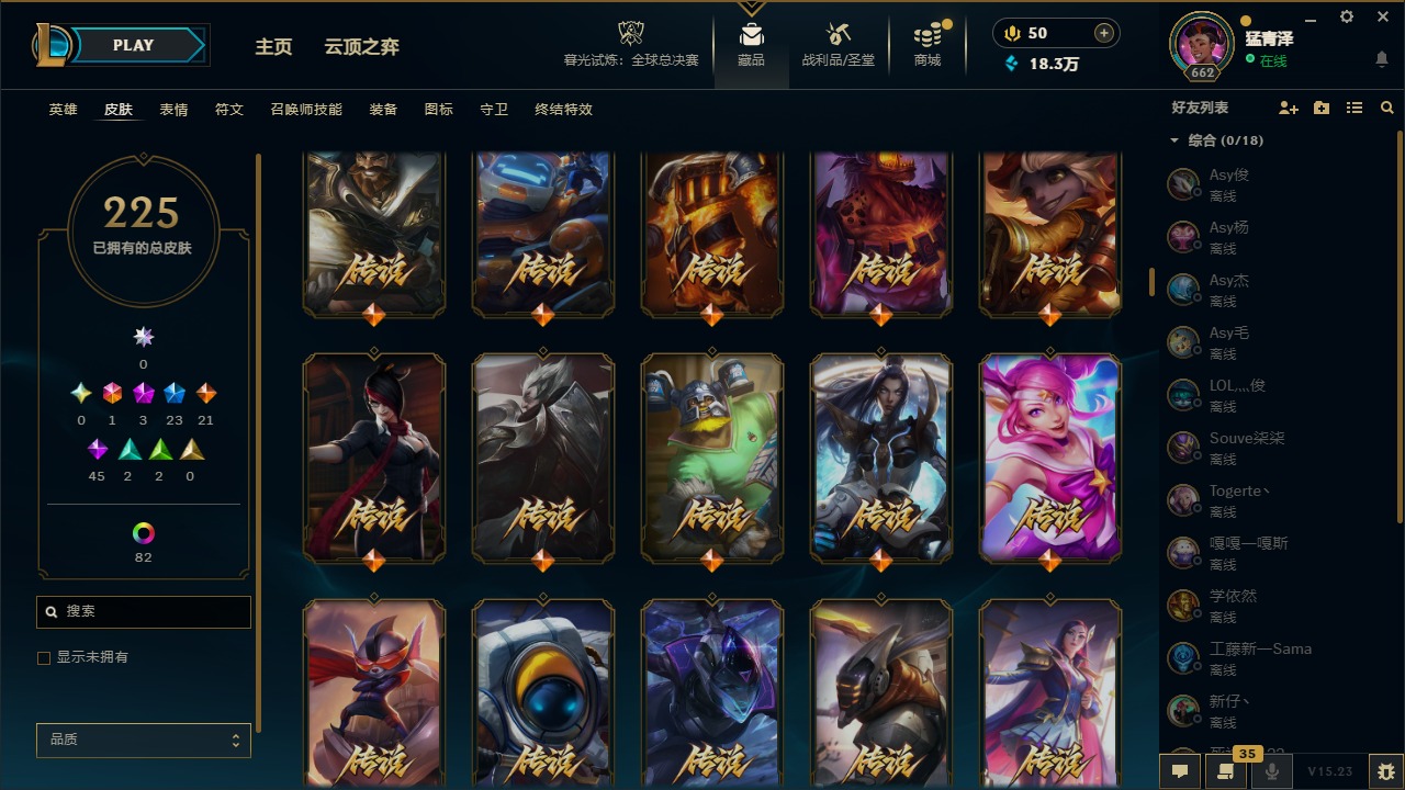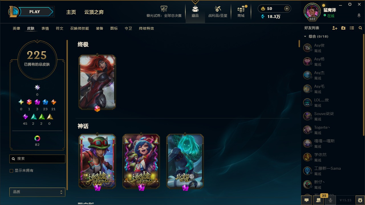 1终极 3神话 23限定 21传说 45史诗 225皮肤 92炫彩 149英雄 可二次 可修改实名 【赛季限定皮】:胜利女神-菲奥娜胜利之运 崔斯特胜利剑圣 易胜利女神 娑娜胜利巨口 克格莫胜利之王 泰达米尔 【冠军限定系列】:s3 skt t1 劫s8 ig 艾瑞莉娅 【冰雪节限定】