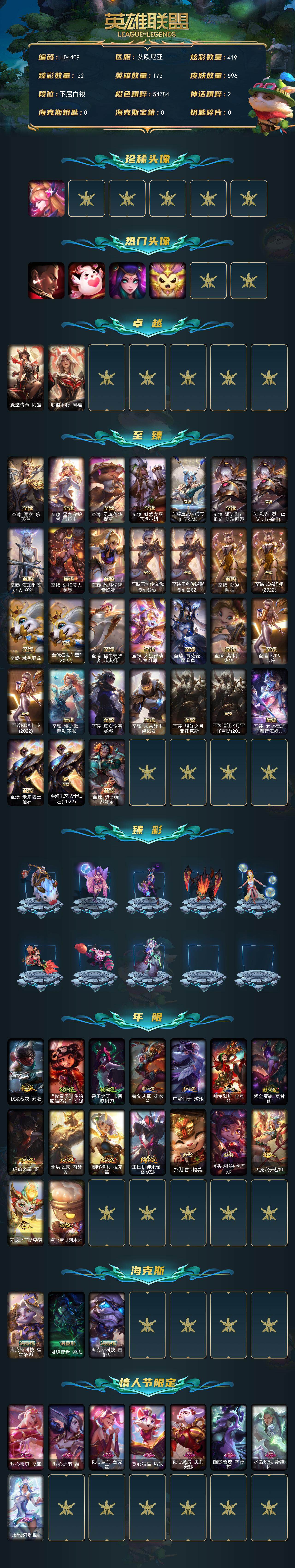 【ld4409】172英雄/596皮肤/5终极/41神话/109限定/22臻彩/419炫彩/74传说/86史诗/白银/星守阿狸头像/觅心游侠卢锡安头像/爱情鸽头像/玉剑传说寒潭夭夭头像/星守索拉卡头像/殿堂传奇 阿狸/联盟不朽 阿狸/至臻魔女乐芙兰/至臻星之守护者索拉卡/至臻 灵魂莲华 提莫/至臻魅惑女巫厄运小姐/至臻 玉剑传说 琴仙子/至臻 源计划:正义 艾瑞莉娅/至臻 源计划:正义 艾瑞莉