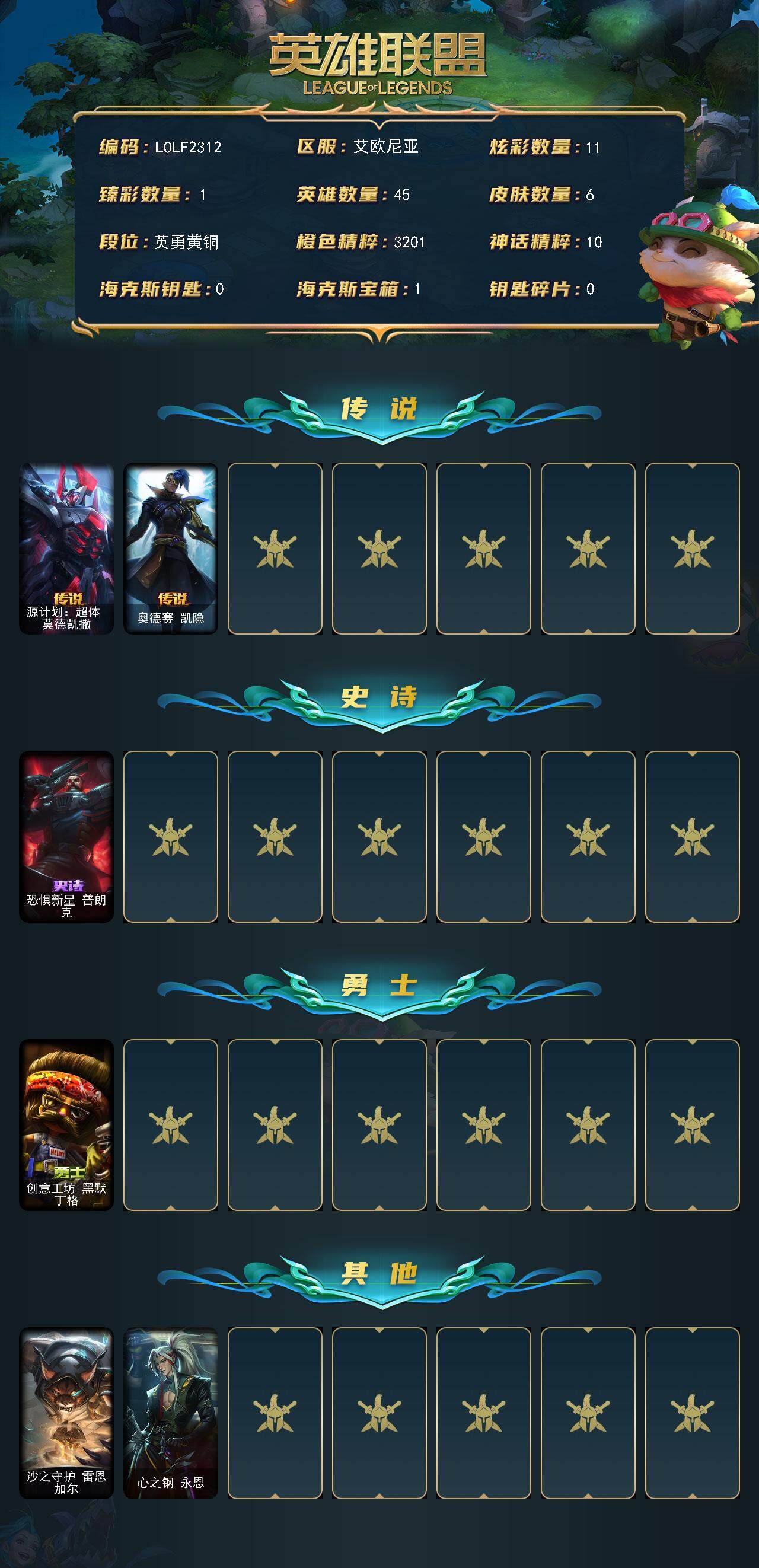【lolf2312】45英雄/6皮肤/1臻彩/11炫彩/2传说/1史诗/青铜/幽梦玫瑰伊莉丝浪漫花蕾/源计划超体莫德凯撒/奥德赛凯隐/恐惧新星普朗克/创意工坊黑默丁格/沙之守护雷恩加尔/心之钢永恩