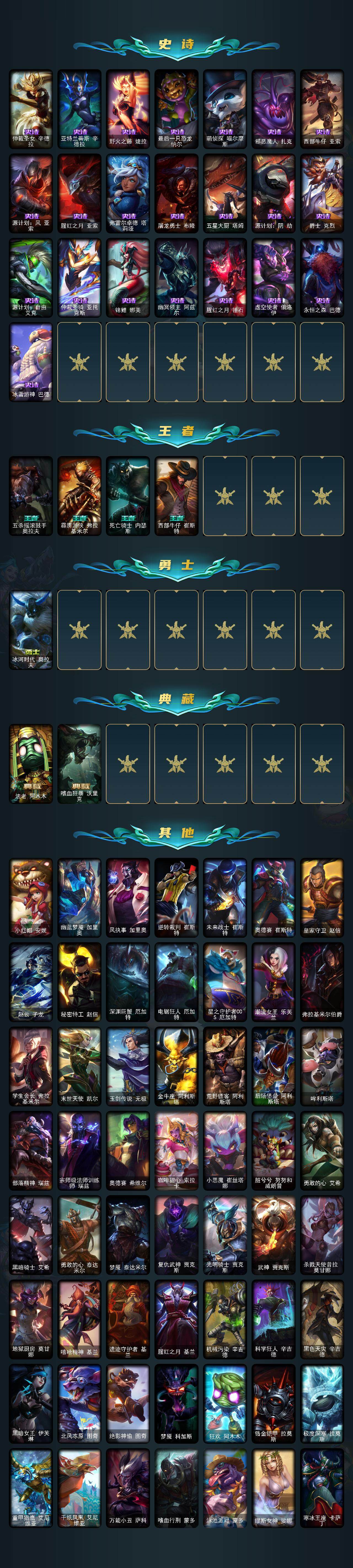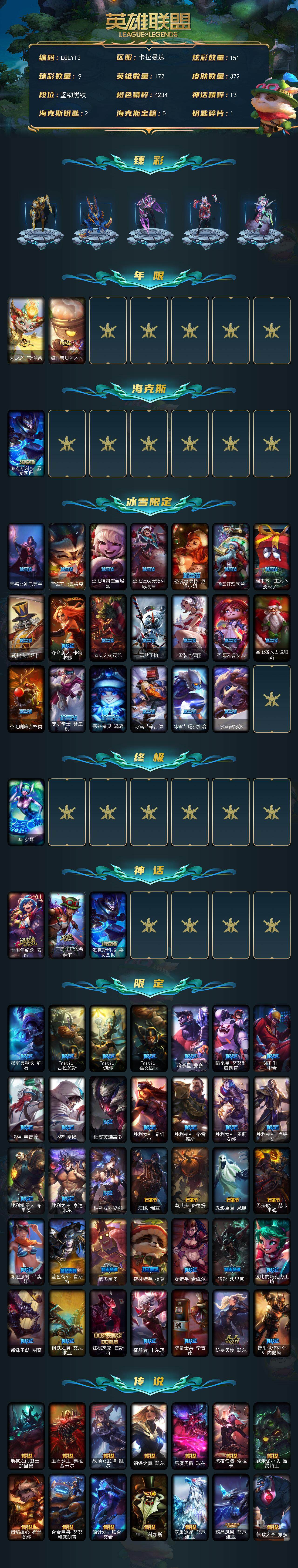 【lolyt3】172英雄/372皮肤/1终极/3神话/57限定/9臻彩/151炫彩/41传说/99史诗/未定级账号等级:846/天龙之子卡莎飞龙乘云/冠军之隐劫凯旋圣装/霸天异形卡兹克掠空魅影/天煞劫恒星游历者/星之守护者卡莎热情之光/春晖神女艾希玉露金风/魔女阿卡丽虚荣/净雪之月莫甘娜冬虹/霸天异形卡兹克丛林灾厄/天龙之子斯莫德/点心宝贝阿木木/海克斯科技嘉文四世/幸福女神乐芙兰/圣诞开心鬼提莫/圣诞精灵崔丝塔娜/圣诞狂欢努努和威朗普/圣诞糖果棒厄运小姐/圣诞狂欢基兰/阿木木“主人不要我了”/胡桃夹子萨科/夺命美人卡特琳娜/喜庆之树茂凯/雪默丁格/雪装奈德丽/圣诞玩偶波比/圣诞老人古拉加斯/圣诞驯鹿克格莫/魄罗骑士瑟庄妮/寒冬精灵璐璐/冰雪节辛吉德/冰雪节玛尔扎哈/冰雪兽纳尔/dj娑娜/十周年纪念安妮/十五周年纪念希维尔/冠军典狱长锤石/fnatic古拉加斯/fnatic迦娜/fnatic嘉文四世/暗杀星蒙多/暗杀星努努和威朗普/sktt1李青/ssw辛吉德/ssw泰隆/暗裔英雄盖伦/胜利女神希维尔/胜利呛神格雷福斯/胜利女神奥莉安娜/胜利呛神卢锡安/胜利机器人布里茨/胜利之王泰达米尔/胜利女神娑娜/海贼瑞兹/南瓜头费德提克/鬼影重重魔腾/无头骑士赫卡里姆/泳池派对菲奥娜/蓝色忧郁崔斯特/蒙多蒙多/密林猎手提莫/女猎手希维尔/暗影沃里克/波比的巧克力工坊/都铎王朝图奇/钢铁之翼艾尼维亚/红桃杰克崔斯特/征服者卡尔玛/防暴士兵辛吉德/防暴天使凯尔/警用试作体k9内瑟斯/地狱之门卫士加里奥/血石领主弗拉基米尔/战场女武神凯尔/钢铁之翼凯尔/恶魔男爵瑞兹/黑夜使者索拉卡/欧米伽小队幽灵特工/烈焰雄心崔丝塔娜/合金巨兽努努和威朗普/源计划联合艾希/绅士科加斯/双重冰晶艾尼维亚/黯晶凤凰艾尼维亚/律政大亨蒙多/电玩女神娑娜/灵能特工娑娜/女主播迦娜/红色男爵库奇/女警狙击凯特琳/陆地王者4wd布里茨/苹果机器人布里茨/冰川巨兽墨菲特/丧尸布兰德/神龙尊者圣龙李青/源计划净化薇恩/星之守护者阿卡丽/死亡骑士盖伦/黎明使者锐雯/星之守护者拉克丝/黯黑魔龙希瓦娜/冰霜亚龙希瓦娜/焰尾妖狐阿狸/偶像歌手阿狸/宇航员诺提勒斯/女校长菲奥娜/金牌主播德莱文/霸天异形卡兹克/灌篮高手德莱厄斯/蔷薇绅士杰斯/西部天使赛娜/西部魔影卢锡安/安伯斯与提妮/科学怪熊的新娘安妮/腥红之月崔斯特/铁钩船长费德提克/圣光审判凯尔/侍魂易/地狱火阿利斯塔/战争机器赛恩/战场公主希维尔/钢铁之心希维尔/月光女神阿忒弥斯索拉卡/圣洁化身索拉卡/兔宝宝提莫/熊猫提莫/狼外婆沃里克/火牙狼人沃里克/荒野豺狼沃里克/法国皇室厄运小姐/黑帮狂花厄运小姐/国王泰达米尔/百夫长贾克斯/少林武僧贾克斯/黑色荆棘莫甘娜/死神卡尔萨斯/殇之机器人阿木木/武动巅峰萨科/掠星魔刃卡萨丁/特种部队普朗克/恐惧新星普朗克/血石诅咒塔里克/穿着正装的恶魔维迦/抵抗军天使凯特琳/铁血狙击手凯特琳/黑曜石守护者墨菲特/霸天巨兽墨菲特/蓝焰梦魔魔腾/符文战神雷克顿/死亡绽放伊莉丝/腥红之月伊莉丝/灵骨工匠奥莉安娜/三昧真火孙悟空/v字仇杀者布兰德/灵魂烈焰布兰德/至高之拳李青/深海妖姬卡西奥佩娅/铁血猎手奈德丽/四神之力乌迪尔/军神战甲波比/血色之锤波比/大夏武士潘森/冰川勇者伊泽瑞尔/死亡领主莫德凯撒/铁血女忍阿卡丽/刺客信条凯南/钢铁烈阳蕾欧娜/至高君王玛尔扎哈/兔女郎锐雯/帝王斑蝶克格莫/腥红之月鬼武者慎/奥术光辉拉克丝/星际迷航拉克丝/黑帮教父格雷福斯/银河魔装机神菲兹/铁血猎人雷恩加尔/皇家守卫菲奥娜/夜鸦菲奥娜/源计划火菲奥娜/奥术大师吉格斯/驯龙女巫璐璐/绞肉机刽子手德莱文/死亡绽放卡兹克/生化骑士德莱厄斯/全金属狂潮杰斯/天启骑士杰斯/无限烈焰黛安娜/血羽凤凰奎因/勇敢的心奎因/仲裁圣女辛德拉/亚特兰蒂斯辛德拉/野火之藤婕拉/最后一只恐龙纳尔/萌侦探喵尔摩斯/邪恶魔人扎克/西部牛仔亚索/源计划风亚索/腥红之月亚索/弗雷尔卓德塔莉垭/屠龙勇士布隆/五星大厨塔姆/源计划阴劫/爵士克烈/源计划自由艾克/仲裁圣骑亚托克斯/锦鲤娜美/幽冥领主阿兹尔/腥红之月锤石/虚空使者俄洛伊/永恒之森巴德/冰雪游神巴德/五杀摇滚鼓手奥拉夫/霹雳游侠弗拉基米尔/死亡骑士内瑟斯/西部牛仔崔斯特/冰河时代奥拉夫/法老阿木木/嗜血狂暴沃里克/小红帽安妮/幽蓝梦魇加里奥/风执事加里奥/逆转裁判崔斯特/未来战士崔斯特/奥德赛崔斯特/皇家守卫赵信/赵云子龙/秘密特工赵信/深渊巨蟹厄加特/电锯狂人厄加特/星之守护者cos厄加特/潮流女王乐芙兰/弗拉基米尔伯爵/学生会长弗拉基米尔/末世天使凯尔/玉剑传说无极/金牛座阿利斯塔/荒野镖客阿利斯塔/后场堡垒阿利斯塔/哞利斯塔/部落精神瑞兹/宗师级法师训练师瑞兹/奥德赛希维尔/咖啡甜心索拉卡/小恶魔崔丝塔娜/脏兮兮努努和威朗普/勇敢的心艾希/黑暗骑士艾希/勇敢的心泰达米尔/梦魇泰达米尔/复仇武神贾克斯/光明骑士贾克斯/武神贾克斯/杀戮天使昔拉莫甘娜/地狱厨房莫甘娜/嘻哈精神基兰/遗迹守护者基兰/腥红之月基兰/机械污染辛吉德/科学狂人辛吉德/黑色天灾辛吉德/黑暗女王伊芙琳/北风冻原图奇/绝影神偷图奇/梦魇科加斯/狂欢阿木木/铬金铠甲拉莫斯/极度深寒拉莫斯/重甲猎鹰艾尼维亚/千纸凤凰艾尼维亚/万能小丑萨科/嗜血行刑蒙多/泳池派对蒙多/缪斯女神