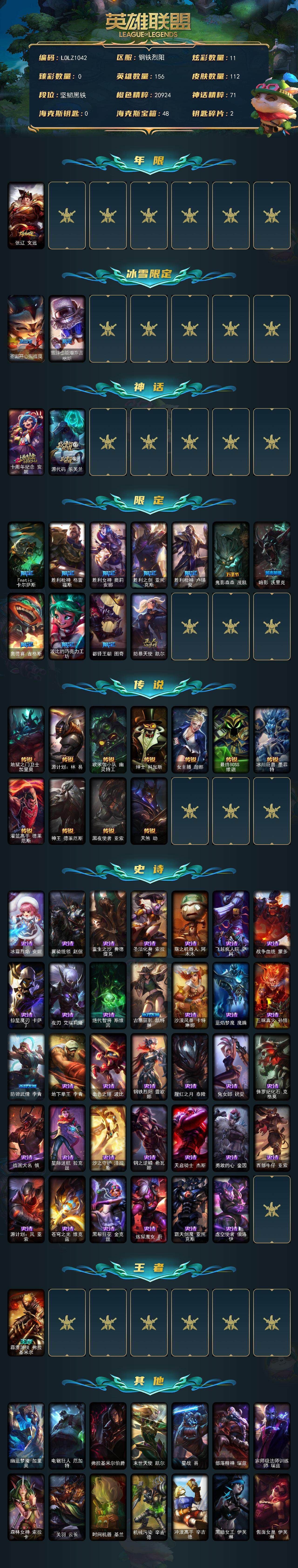 156英雄-112皮肤-【lolz1042】156英雄/112皮肤/2神话/14限定/11炫彩/11传说/34史诗/未定级账号等级:271/鸡年盖伦/圣诞开心鬼提莫/雪球也能爆炸!吉格斯/十周年纪念安妮/源代码 乐芙兰/s1fnc死歌/胜利呛神格雷福斯/胜利女神奥利安娜/胜利之剑剑魔/胜利呛神卢锡安/鬼影森森茂凯/暗影沃里克/奥德赛吉格斯/波比的巧克力工坊/都铎王朝老鼠/防暴天使凯尔/地狱之门卫士加里奥/源计划剑圣/