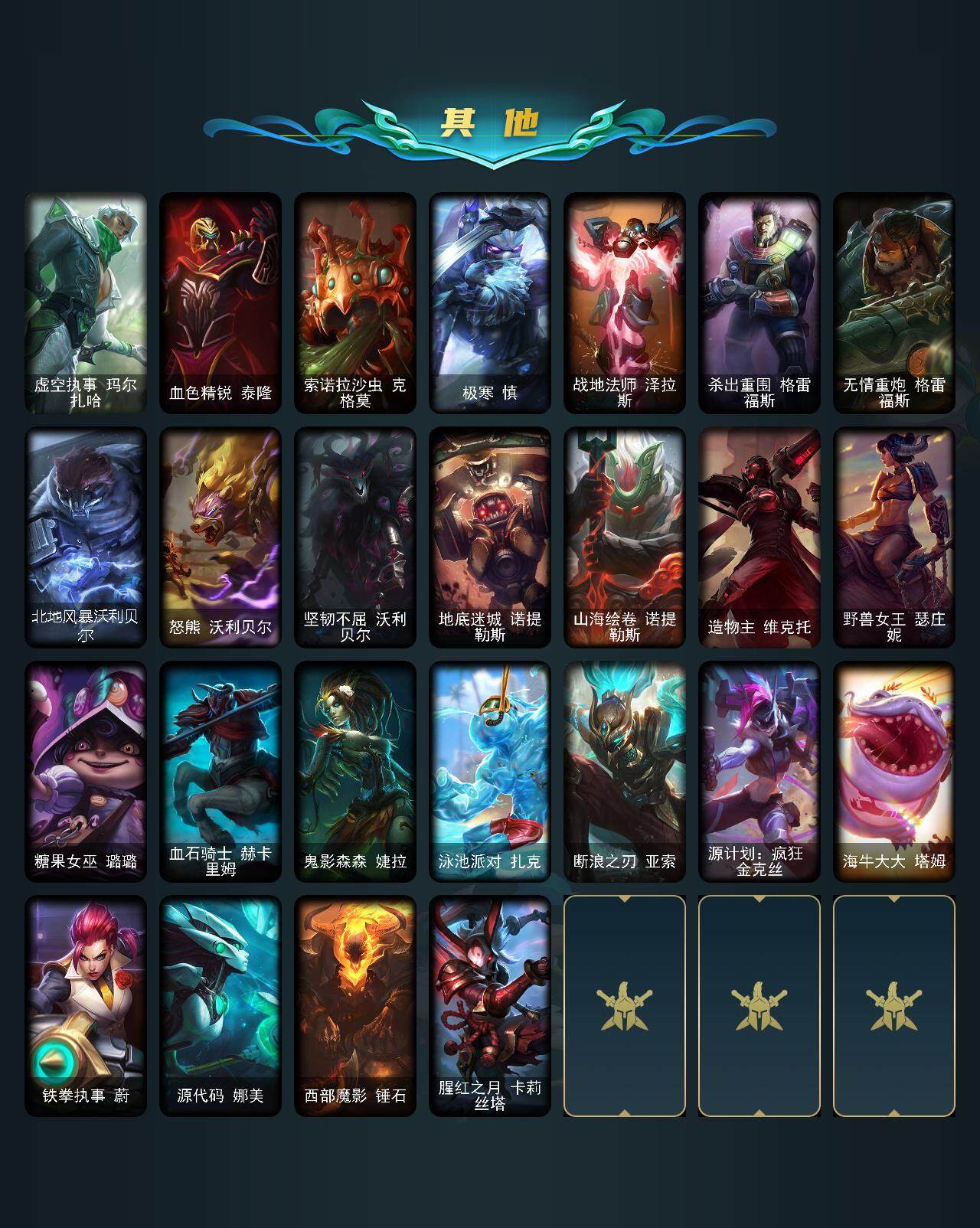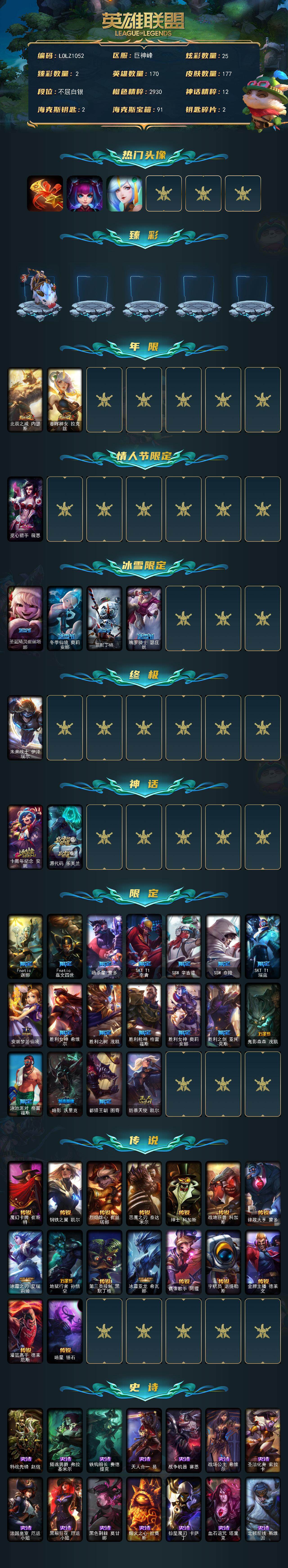 170英雄-177皮肤-【lolz1052】170英雄/177皮肤/1终极/2神话/25限定/2臻彩/25炫彩/16传说/44史诗/白银/卡特琳娜的匕首头像/银河魔装机神安妮头像/春晖神女头像/无畏骑士瑟庄妮赤子初心/魔女阿卡丽虚荣/狗年内瑟斯/狗年春晖神女拉克丝/觅心猎手薇恩/圣诞精灵崔丝塔娜/冬季仙境奥莉安娜/雪默丁格/魄罗骑士瑟庄妮/未来战士伊泽瑞尔/十周年纪念安妮/源代码 乐芙兰/s1fnc迦娜/s1fnc嘉