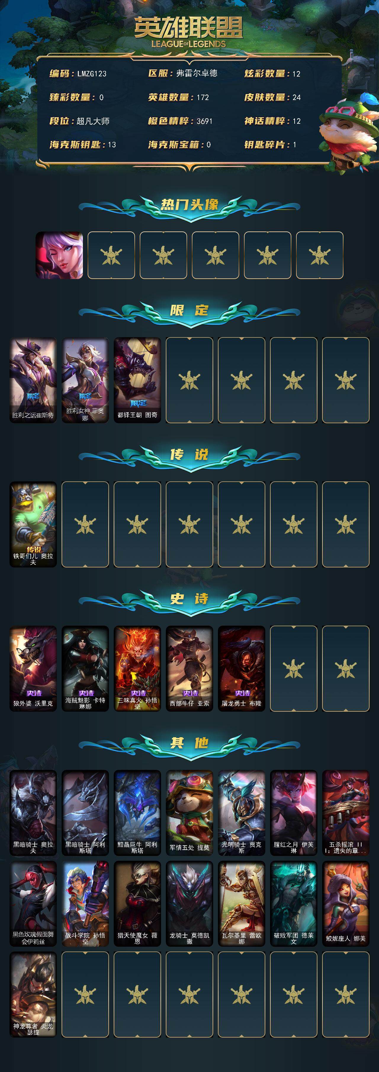 【lmzg123】172英雄/24皮肤/3限定/12炫彩/1传说/5史诗/大师/觅心之翼奎因头像/胜利之运崔斯特/胜利女神菲奥娜/都铎王朝图奇/铁哥们儿奥拉夫/狼外婆沃里克/海贼魅影卡特琳娜/三昧真火孙悟空/西部牛仔亚索/屠龙勇士布隆/黑暗骑士奥拉夫/黑暗骑士阿利斯塔/黯晶巨牛阿利斯塔/军情五处提莫/光明骑士贾克斯/腥红之月伊芙琳/五杀摇滚iii遗失的章节娑娜/黑色玫瑰假面舞会伊莉丝/战斗学院孙悟空/猎天使魔女薇恩/龙骑士莫德凯撒/瓦尔基里蕾欧娜/破败军团德莱文/鲛妮座人娜美/神龙尊者炎龙瑟提
