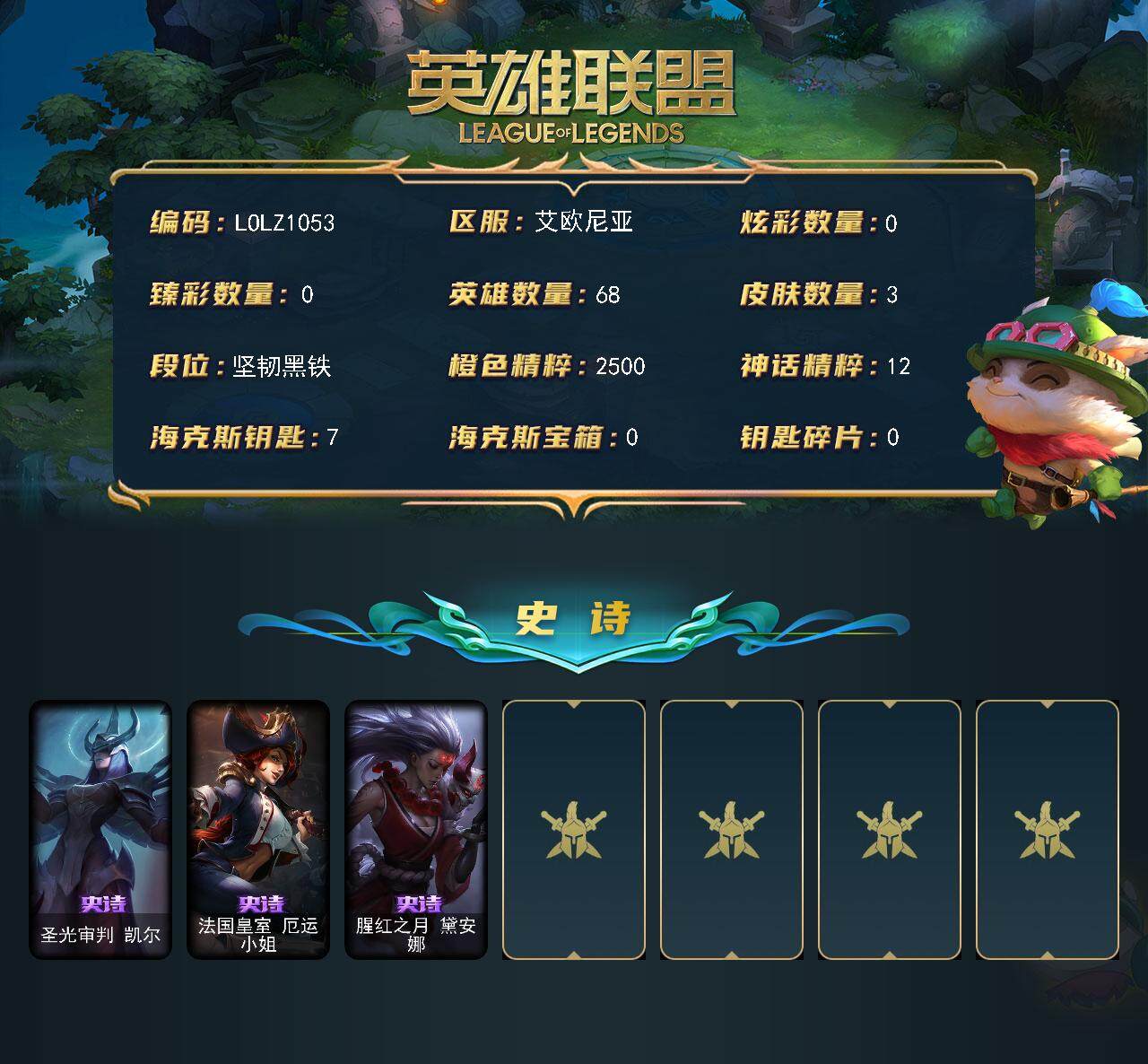 【lolz1053】68英雄/3皮肤/3史诗/黑铁账号等级:40/圣光审判凯尔/法国皇室厄运小姐/腥红之月黛安娜