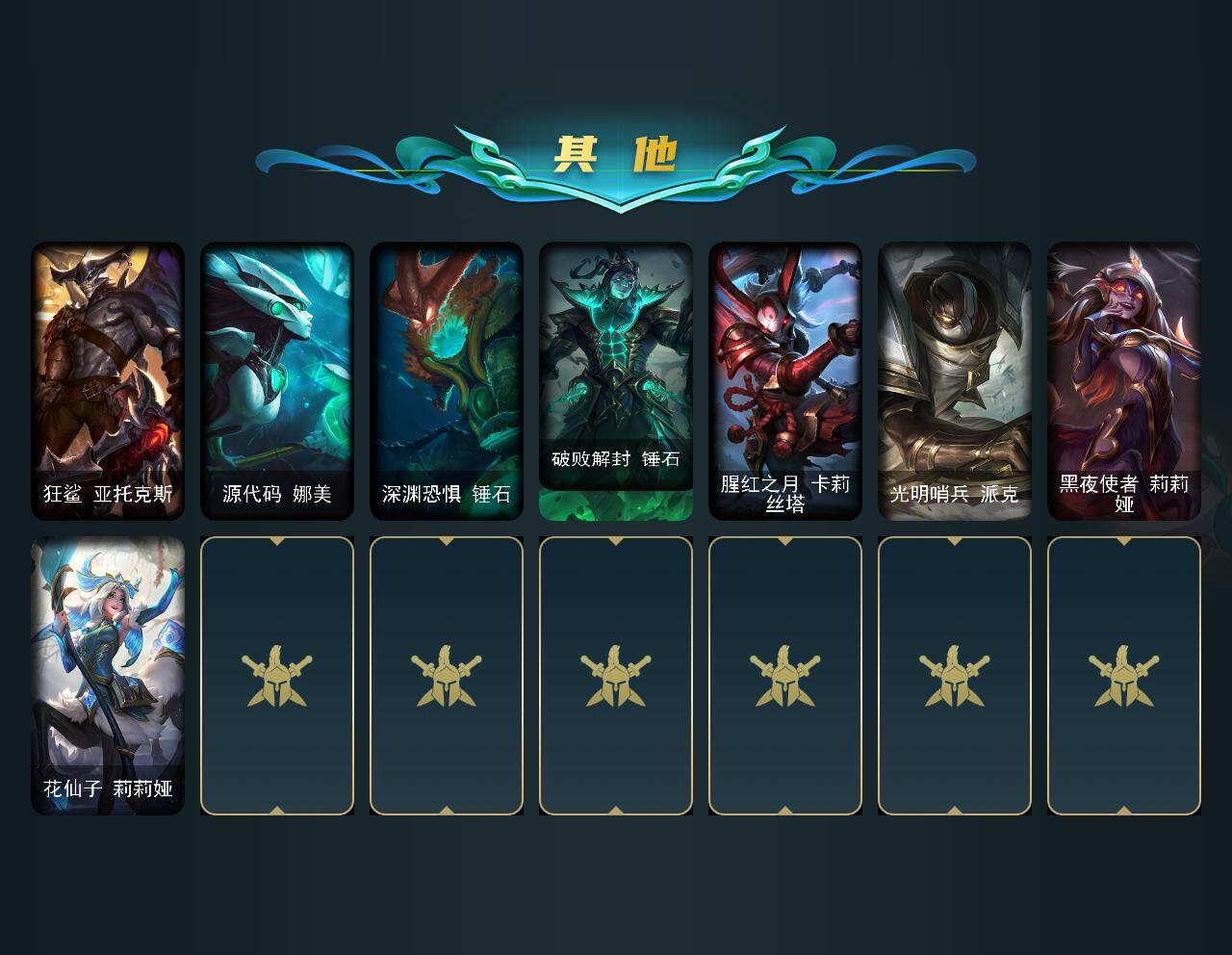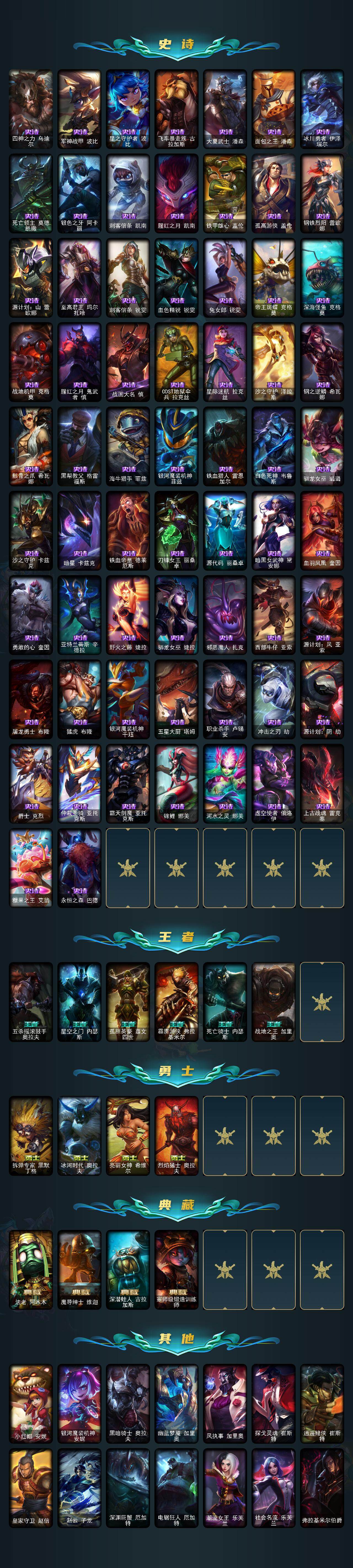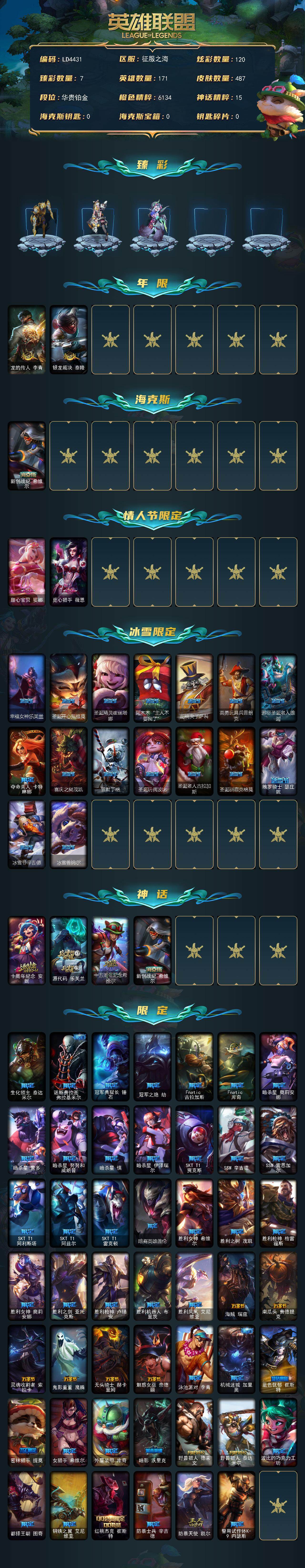 【ld4431】171英雄/487皮肤/4神话/68限定/7臻彩/120炫彩/40传说/128史诗/铂金/天龙之子卡莎飞龙乘云/墨之影武者亚索金墨耀影/冠军之隐劫凯旋圣装/战斗学院卡特琳娜盛典礼服/咖啡甜心金克丝核桃巴菲/魔女阿卡丽虚荣/净雪之月莫甘娜冬虹/龙的传人李青/银龙裁决泰隆/新创战纪希维尔/甜心宝贝娑娜/觅心猎手薇恩/幸福女神乐芙兰/圣诞开心鬼提莫/圣诞精灵崔丝塔娜/阿木木“主人不要我了”/胡桃夹子萨科/英勇玩具兵普朗克/邪恶圣诞老人维迦/夺命美人卡特琳娜/喜庆之树茂凯/雪默丁格/圣诞玩偶波比/圣诞老人古拉加斯/圣诞驯鹿克格莫/魄罗骑士瑟庄妮/冰雪节辛吉德/冰雪兽纳尔/十周年纪念安妮/源代码乐芙兰/十五周年纪念希维尔/生化领主泰达米尔/诺斯费拉图弗拉基米尔/冠军典狱长锤石/冠军之隐劫/fnatic古拉加斯/fnatic库奇/暗杀星奥莉安娜/暗杀星蒙多/暗杀星努努和威朗普/暗杀星慎/暗杀星伊泽瑞尔/sktt1贾克斯/ssw辛吉德/ssw雷恩加尔/sktt1阿利斯塔/sktt1阿兹尔/sktt1雷克顿/暗裔英雄盖伦/胜利女神希维尔/胜利之树茂凯/胜利呛神格雷福斯/胜利女神奥莉安娜/胜利之剑亚托克斯/胜利呛神卢锡安/胜利机器人布里茨/胜利凤凰艾尼维亚/海贼瑞兹/南瓜头费德提克/灵魂收割者索拉卡/鬼影重重魔腾/无头骑士赫卡里姆/魅惑女巫奈德丽/泳池派对李青/机械迷城加里奥/蓝色忧郁崔斯特/密林猎手提莫/女猎手希维尔/外星装甲库奇/暗影沃里克/野兽猎人德莱文/野兽猎人泰达米尔/波比的巧克力工坊/都铎王朝图奇/钢铁之翼艾尼维亚/红桃杰克崔斯特/防暴士兵辛吉德/防暴天使凯尔/警用试作体k9内瑟斯/地狱之门卫士加里奥/战地机甲厄加特/大天使长米迦勒凯尔/战场女武神凯尔/源计划林易/黑夜使者索拉卡/烈焰雄心崔丝塔娜/合金巨兽努努和威朗普/女皇艾希/源计划联合艾希/战地巨兽科加斯/律政大亨蒙多/电玩女神娑娜/冰霜之刃艾瑞莉娅/女主播迦娜/红色男爵库奇/女警狙击凯特琳/未来战士凯特琳/苹果机器人布里茨/冰川巨兽墨菲特/上古战魂魔腾/地狱行者孙悟空/丧尸布兰德/神拳李青/神龙尊者圣龙李青/银河魔装机神兰博/第三类接触黑默丁格/腥红之月鬼武姬阿卡丽/死亡骑士盖伦/钢铁军团盖伦/星之守护者拉克丝/枯萎之壤泽拉斯/黯黑魔龙希瓦娜/焰尾妖狐阿狸/苍穹之光韦鲁斯/女校长菲奥娜/金牌主播德莱文/灌篮高手德莱厄斯/星之守护者金克丝/暗星锤石/科学怪熊的新娘安妮/皇家火呛手崔斯特/腥红之月崔斯特/特战先锋赵信/绞肉机角斗士赵信/屠龙勇士赵信/摄魂男爵弗拉基米尔/铁钩船长费德提克/重生之沙费德提克/圣光审判凯尔/侍魂易/地狱火阿利斯塔/战争机器赛恩/战场公主希维尔/钢铁之心希维尔/月光女神阿忒弥斯索拉卡/源代码索拉卡/熊猫提莫/荒野豺狼沃里克/法国皇室厄运小姐/女船长厄运小姐/紫晶射手艾希/国王泰达米尔/百夫长贾克斯/刀锋女王莫甘娜/黑色荆棘莫甘娜/炼金狂士辛吉德/死神卡尔萨斯/卡尔萨斯祸害之光/小小骑士阿木木/殇之机器人阿木木/熔火之心拉莫斯/全金属狂潮拉莫斯/贵族血统萨科/飞越疯人院萨科/战争血统蒙多/掠星魔刃卡萨丁/夜行义贼艾瑞莉娅/海克斯科技迦娜/寒冰女皇迦娜/星之守护者迦娜/特种部队普朗克/血石诅咒塔里克/穿着正装的恶魔维迦/北领前线斯维因/抵抗军天使凯特琳/古墓丽影凯特琳/铁血狙击手凯特琳/黑曜石守护者墨菲特/前线指挥官卡特琳娜/蓝焰梦魔魔腾/符文战神雷克顿/龙骑统帅嘉文四世/凯旋英雄嘉文四世/死亡绽放伊莉丝/灵骨工匠奥莉安娜/v字仇杀者布兰德/至高之拳李青/屠龙勇士薇恩/苍穹之光薇恩/深海妖姬卡西奥佩娅/法老王朝内瑟斯/铁血猎手奈德丽/四神之力乌迪尔/军神战甲波比/星之守护者波比/飞车暴走族古拉加斯/大夏武士潘森/面包之王潘森/冰川勇者伊泽瑞尔/死亡领主莫德凯撒/银色之牙阿卡丽/刺客信条凯南/腥红之月凯南/铁甲雄心盖伦/孤高游侠盖伦/钢铁烈阳蕾欧娜/源计划山蕾欧娜/至高君王玛尔扎哈/刺客信条锐雯/血色精锐锐雯/兔女郎锐雯/帝王斑蝶克格莫/深海怪鱼克格莫/战地机甲克格莫/腥红之月鬼武者慎/战国大名慎/odst地狱伞兵拉克丝/星际迷航拉克丝/沙之守护泽拉斯/钢之逆鳞希瓦娜/骸骨之爪希瓦娜/黑帮教父格雷福斯/海牛猎手菲兹/银河魔装机神菲兹/铁血猎人雷恩加尔/白色死神韦鲁斯/驯龙女巫璐璐/沙之守护卡兹克/暗星卡兹克/铁血帝皇德莱厄斯/刀锋女王丽桑卓/源代码丽桑卓/暗黑女武神黛安娜/血羽凤凰奎因/勇敢的心奎因/亚特兰蒂斯辛德拉/野火之藤婕拉/驯龙女巫婕拉/邪恶魔人扎克/西部牛仔亚索/源计划风亚索/屠龙勇士布隆/猛虎布隆/银河魔装机神千珏/五星大厨塔姆/职业杀手卢锡安/冲击之刃劫/源计划阴劫/爵士克烈/仲裁圣骑亚托克斯/霸天剑魔亚托克斯/锦鲤娜美/河水之灵娜美/虚空使者俄洛伊/上古战魂雷克塞/糖果之王艾翁/永恒之森巴德/五杀摇滚鼓手奥拉夫/星空之门内瑟斯/孤胆英豪嘉文四世/霹雳游侠弗拉基米尔/死亡骑士内瑟斯/战地之王加里奥/拆弹专家黑默丁格/冰河时代奥拉夫/亮丽女神希维尔/烈焰猛士奥拉夫/法老阿木木/魔导绅士维迦/深潜蛙人古拉加斯/宗师级锻造训练师/小红帽安妮/银河魔装机神安妮/黑暗骑士奥拉夫/幽蓝梦魇加里奥/风执事加里奥/探戈灵魂崔斯特/赌侠崔斯特/皇家守卫赵信/赵云子龙/深渊巨蟹厄加特/电锯狂人厄加特/潮流女