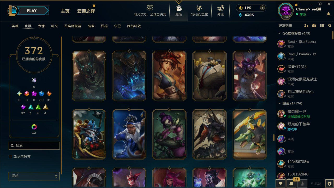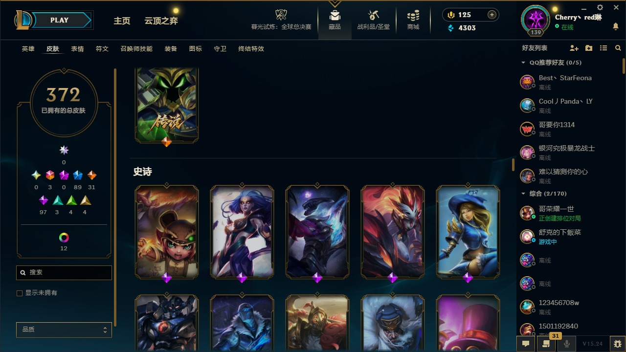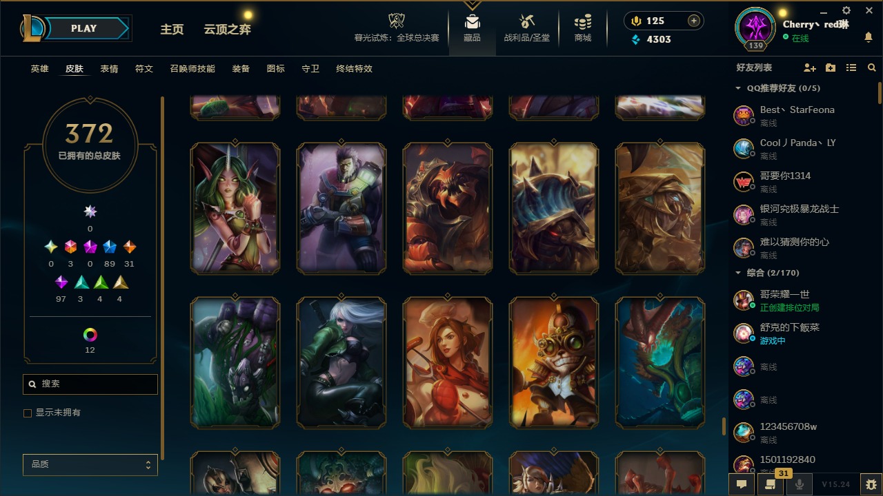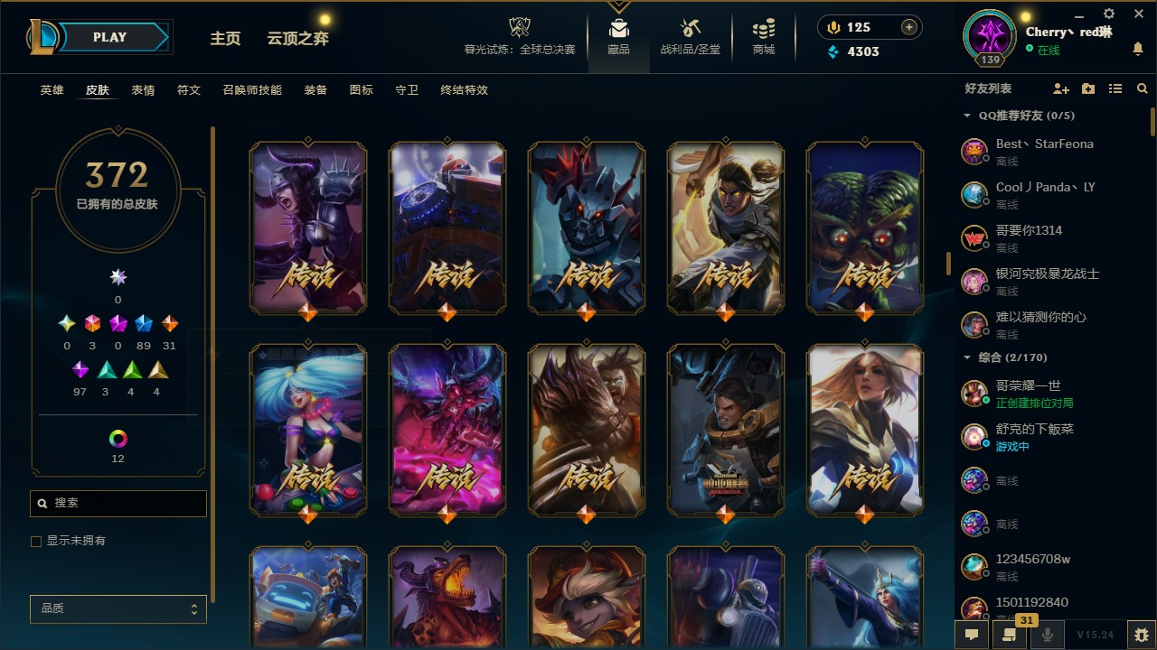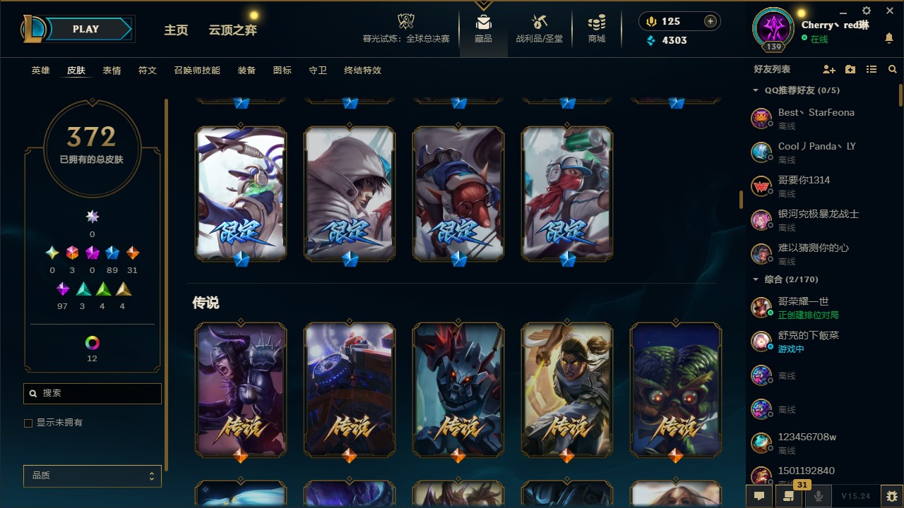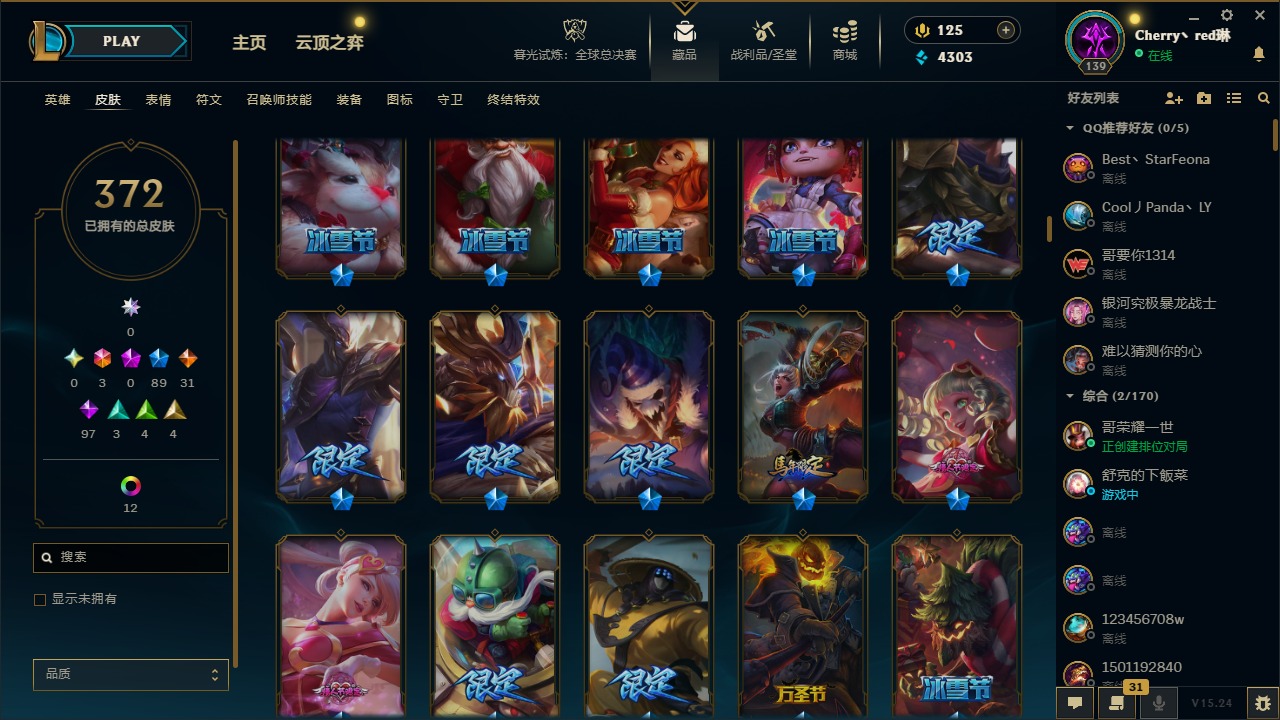 [14364687]3终极 89限定 31传说 97史诗 372皮肤 17炫彩 132英雄 可二次 可修改实名 【情人节限定】:觅心猎手 薇恩觅心魔灵 奥利安娜觅心女王 艾希觅心之翼 奎因甜心宝贝 安妮甜心宝贝 娑娜 【赛季限定皮】:胜利之树 茂凯胜利呛神 格雷福斯胜利之剑 亚托克斯