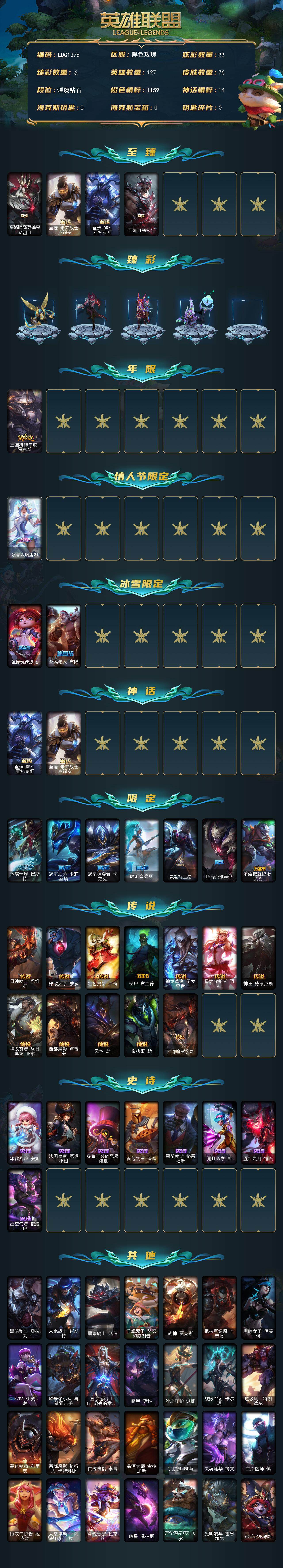 【ldc1376】127英雄/76皮肤/4神话/11限定/6臻彩/22炫彩/12传说/8史诗/钻石账号等级:108/至臻暗裔英雄嘉文四世/至臻未来战士卢锡安/至臻drx亚托克斯/至臻t1塞拉斯/冠军掠夺者卡兹克凯旋圣装/西部魔影卢锡安贝利尔之怠/星之守护者霞烈羽/最终boss维迦里大魔王/春晖神女艾希玉露金风/花仙子崔丝塔娜蓝闪/王国机神白虎贾克斯/水晶玫瑰迦娜/圣诞玩偶波比/圣诞老人布隆/地底世界崔斯特/冠军之矛卡莉丝塔/冠军掠夺者卡兹克/dwg奈德丽/灵能特工易/暗裔英雄盖伦/不给糖就捣蛋艾克/日蚀骑士希维尔/律政大亨蒙多/红色男爵库奇/丧尸布兰德/神龙尊者圣龙李青/星之守护者阿狸/神王德莱厄斯/神龙尊者昼日真龙亚索/西部魔影卢锡安/天煞劫/影执事劫/西部魔影永恩/冰霜烈焰安妮/法国皇室厄运小姐/穿着正装的恶魔维迦/面包之王潘森/黑帮教父格雷福斯/霓虹杀拳蔚/腥红之月锤石/虚空使者俄洛伊/黑暗骑士奥拉夫/未来战士崔斯特/黑暗骑士赵信/千纸双子努努和威朗普/武神贾克斯/抵抗军绿魔辛吉德/黑暗女王伊芙琳/kda伊芙琳/欧米伽小队毒针狙击手/五杀摇滚iii遗失的章节卡尔萨斯/暗星萨科/沙之守护迦娜/破败军团卡尔玛/垃圾场特朗德尔/暮色呛骑布里茨/西部魔影执行人卡特琳娜/传统僧侣李青/品酒大师古拉加斯/宇航员凯南/灵魂莲华锐雯/主治医师慎/睡衣守护者拉克丝/太空律动闪耀灯球拉克丝/斗魂觉醒拉克丝/暗星泽拉斯/莲华温泉沃利贝尔/光明哨兵雷恩加尔/愚乐之巫璐璐/西部魔影赫卡里姆/屠龙勇士黛安娜/灵之菊纳尔/国王佛耶戈/灵能特工劫/灵能特工蔚/古神艾翁/永恒之森霞/窃魂修罗塞拉斯/战斗学院永恩/莲华温泉瑟提/幻灵战斗兔阿萝拉