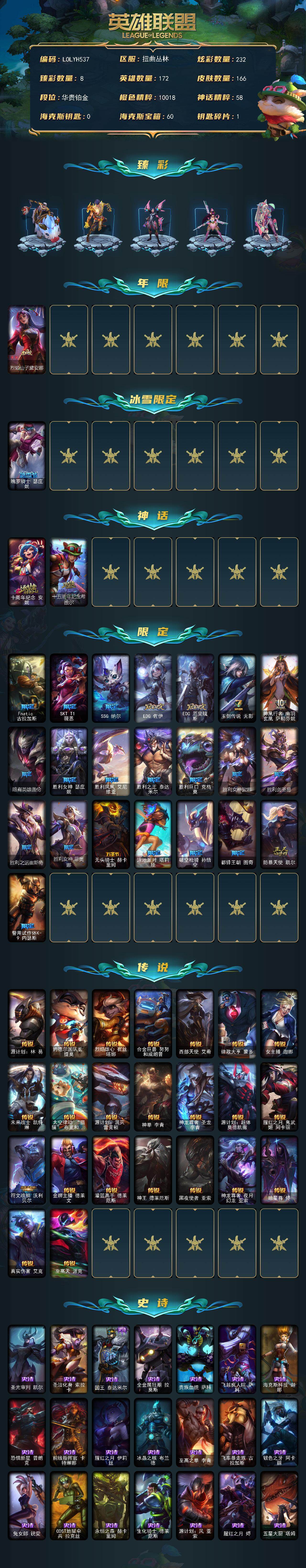 【lolyh537】172英雄/166皮肤/2神话/24限定/8臻彩/232炫彩/23传说/25史诗/铂金账号等级:553/无畏骑士瑟庄妮赤子初心/神龙尊者圣龙李青龙腾云起/弹幕天使卡莎炽天使勇敢/玉剑传说舞剑仙承影/幻灵战斗猫金克丝梦幻强袭/星之守护者阿卡丽热情之光/魔女阿卡丽虚荣/墨之影武者永恩灵墨刻影/烈焰仙子黛安娜/魄罗骑士瑟庄妮/十周年纪念安妮/十五周年纪念希维尔/fnatic古拉加斯/sktt1薇恩/ssg纳尔/edg佐伊/edg厄斐琉斯/玉剑传说无影/神凰行者幽羽玄凰萨勒芬妮/暗裔英雄盖伦/胜利女神瑟庄妮/胜利凤凰艾尼维亚/胜利之王泰达米尔/胜利巨口克格莫/胜利女神娑娜/胜利剑圣易/胜利之运崔斯特/胜利女神菲奥娜/无头骑士赫卡里姆/泳池派对塔莉垭/破空呛骑孙悟空/都铎王朝图奇/防暴天使凯尔/警用试作体k9内瑟斯/源计划林易/约德尔国队长提莫/烈焰雄心崔丝塔娜/合金巨兽努努和威朗普/西部天使艾希/律政大亨蒙多/女主播迦娜/未来战士凯特琳/太空律动猫猫布里和里茨/源计划泯灭雷克顿/神拳李青/神龙尊者圣龙李青/源计划超体莫德凯撒/腥红之月鬼武姬阿卡丽/符文战熊沃利贝尔/金牌主播德莱文/灌篮高手德莱厄斯/神王德莱厄斯/黑夜使者亚索/神龙尊者夜月幻龙亚索/暗星尊烬/真实伤害艾克/至高天派克/圣光审判凯尔/圣洁化身索拉卡/国王泰达米尔/全金属狂潮拉莫斯/贵族血统萨科/飞越疯人院萨科/海克斯科技迦娜/恐惧新星普朗克/前线指挥官卡特琳娜/腥红之月伊莉丝/冰晶之核布兰德/至高之拳李青/飞车暴走族古拉加斯/银色之牙阿卡丽/兔女郎锐雯/odst地狱伞兵拉克丝/永恒之森赫卡里姆/生化骑士德莱厄斯/源计划风亚索/腥红之月烬/五星大厨塔姆/源计划雷卢锡安/源计划自由艾克/虚空使者俄洛伊/上古战魂雷克塞/星空之门内瑟斯/冰河时代奥拉夫/亮丽女神希维尔/钢铁终结者赛恩/咖啡甜心安妮/地狱火加里奥/龙族卫士加里奥/深渊巨蟹厄加特/幽魂费德提克/荒野镖客阿利斯塔/黑暗骑士阿利斯塔/黯晶巨牛阿利斯塔/部落精神瑞兹/奥德赛希维尔/源计划末日沃里克/西部牛仔厄运小姐/魔女艾希/复仇武神贾克斯/玉剑传说苍鸾/黎明使者莫甘娜/抵抗军绿魔辛吉德/五杀摇滚主唱卡尔萨斯/山海绘卷科加斯/小丑工作坊萨科/泳池派对蒙多/暴风女神迦娜/电玩上校库奇/破败军团卡尔玛/灰胡子魔法师维迦/绿野仙踪维迦/小怪兽训练师维迦/戴一个表布里茨/战场boss布里茨/绿茵门神茂凯/鳄霸雷克顿/黑夜使者嘉文四世/黑色玫瑰假面舞会伊莉丝/黑夜使者李青/荒漠之咬卡西奥佩娅/银河魔装机神奈德丽/这货不是乌迪尔/万人敌潘森/睡衣守护者伊泽瑞尔/灵能特工伊泽瑞尔/喵里克/宇航员凯南/魔灵玛尔扎哈/荣誉使者玛尔扎哈/玉剑传说武剑仙/灵魂莲华锐雯/毛毛虫克格莫/小蜜蜂克格莫/极寒慎/荣誉使者慎/战斗学院拉克丝/战地法师泽拉斯/暗星泽拉斯/高丽风情阿狸/kda阿狸/青花瓷格雷福斯/夜魔水晶韦鲁斯/全金属狂潮维克托/太空律动节奏幻师璐璐/人马星神赫卡里姆/春晖海神卡兹克/抵抗军雷神杰斯/巅峰之星杰斯/青花瓷丽桑卓/黑夜使者凯隐/鬼影森森婕拉/银河魔装机神纳尔/奥德赛亚索/荣誉使者阿克尚/秩序之舌塔姆/福牛守护者佛耶戈/五杀摇滚之噪音佛耶戈/源计划魅灵赛娜/未来战士艾克/鲛妮座人娜美/永恒之森阿兹尔/灵能特工莎弥拉/太空律动音浪狂舞莎弥拉/西部魔影锤石/宇航员艾翁/比翼之心洛/弗雷尔卓德塞拉斯/灵魂莲华厄斐琉斯/女帝芮尔/光明哨兵派克/战斗学院永恩/太空律动百万调音格温/魔域梦魇烈娜塔