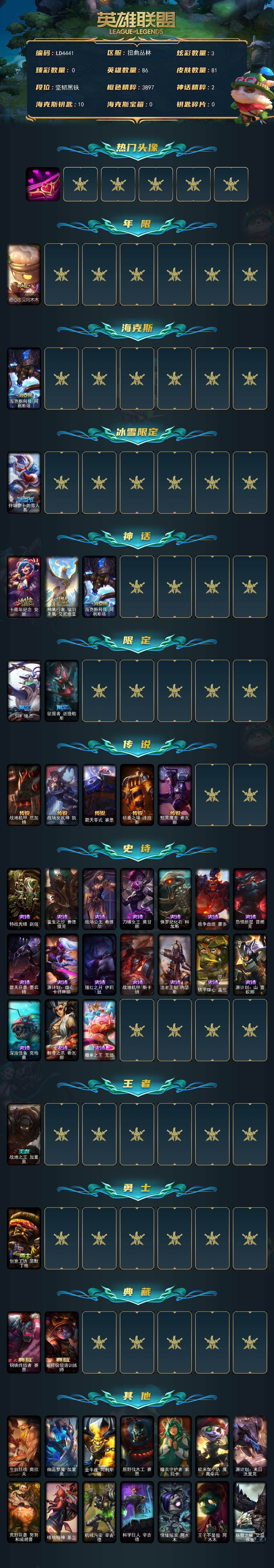 【ld4441】86英雄/81皮肤/3神话/4限定/3炫彩/5传说/17史诗/未定级账号等级:94/爱情之歌头像/点心宝贝阿木木/海克斯科技阿利斯塔/持胡萝卜的雪人易/十周年纪念安妮/神凰行者瑞羽圣凰艾尼维亚/ssw锤石/征服者诺提勒斯/战地机甲厄加特/战场女武神凯尔/霸天零式赛恩/枯萎之壤泽拉斯/黯黑魔龙希瓦娜/特战先锋赵信/重生之沙费德提克/战场公主希维尔/刀锋女王莫甘娜/侏罗纪化石科加斯/战争血统蒙多/恐惧新星普朗克/霸天巨兽墨菲特/源计划雄心卡特琳娜/腥红之月伊莉丝/战地机甲斯卡纳/法老王朝内瑟斯/铁甲雄心盖伦/源计划山蕾欧娜/深海怪鱼克格莫/骸骨之爪希瓦娜/糖果之王艾翁/战地之王加里奥/创意工坊黑默丁格/钢铁终结者赛恩/宗师级锻造训练师/牛扒狂战奥拉夫/幽蓝梦魇加里奥/金牛座阿利斯塔/原野伐木工赛恩/睡衣守护者索拉卡/欧米伽小队魔鬼伞兵/源计划末日沃里克/荒野巨兽努努和威朗普/嘻哈精神基兰/机械污染辛吉德/科学狂人辛吉德/情绪摇滚阿木木/王子不是我阿木木/联盟之喙艾尼维亚/重甲猎鹰艾尼维亚/硬汉蒙多/寒冰王座卡萨丁/深海一号卡萨丁/日冕女神卡尔玛/垃圾场特朗德尔/暮色呛骑布里茨/蛇发女妖卡西奥佩娅/沙暴巨蝎斯卡纳/龙骑士莫德凯撒/梅花国王莫德凯撒/足球宝贝阿卡丽/源计划暗影阿卡丽/空手道凯南/医学博士凯南/小蜜蜂玛尔扎哈/极寒慎/符文生物泽拉斯/失落大陆菲兹/警长沃利贝尔/神龙尊者均衡之龙沃利贝尔/造物主维克托/少校吉格斯/方块王后辛德拉/kda卡莎/电玩女神卡莎/银河魔装机神纳尔/战场boss亚索/这货不是维克兹/源代码娜美/巴德吟游诗人/永恒之森霞/雷霆领主奥恩/灵能特工派克
