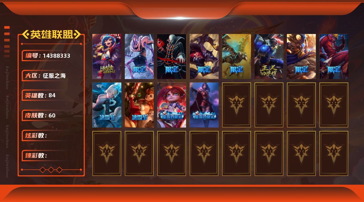 [14388333]可二次【店主推荐捡漏号!可直接换绑】未定级段位-84英雄-60皮肤-0炫彩-0终极-1神话-11限定-3传说-18史诗 【冰雪限定】:幸福女神乐芙兰,圣诞糖果棒厄运小姐,冬季仙境奥莉安娜,圣诞玩偶波比 【神话皮肤】:十周年纪念安妮 【限定皮肤】:诺斯费拉图弗拉基米尔,sktt1李青,胜利之树茂凯,糖果使徒费德提克,都铎王朝图奇,钢铁之翼艾尼维亚,防暴天使凯尔 【传说皮肤】:提莫约德尔人的一大步,丧尸布兰德,苍穹之光韦鲁斯 【史诗皮肤】:地狱火阿利斯塔,国王泰达米尔,少林武僧贾克斯,黑色荆棘莫甘娜,贵族血统萨科,战争血统蒙多,至高之拳李青,深海妖姬卡西奥佩娅,星之守护者波比,飞车暴走族古拉加斯,刺客信条凯南,钢之逆鳞希瓦娜,铁血帝皇德莱厄斯,源代码丽桑卓,勇敢的心奎因,亚特兰蒂斯辛德拉,西部牛仔亚索,冲击之刃劫 【勇士皮肤】:拆弹专家黑默丁格 【其他皮肤1】:宗师级法师训练师瑞兹,勇敢的心泰达米尔,五杀摇滚主唱卡尔萨斯,狂欢阿木木,恐怖之源萨科,战栗之毒蒙多,老兵普朗克,樱花乱舞卡尔玛,戴一个表布里茨,赏金猎人卡特琳娜,劫掠梦魇魔腾,血石战神雷克顿,猛龙雷克顿,武力全开乌迪尔,品酒大师古拉加斯,古拉加斯碎桶者,万人敌潘森,英仙座珀尔修斯潘森,地狱火莫德凯撒,战神阿瑞斯盖伦,极寒慎,主治医师慎,造物主维克托,死亡骑士瑟庄妮,科学狂人吉格斯