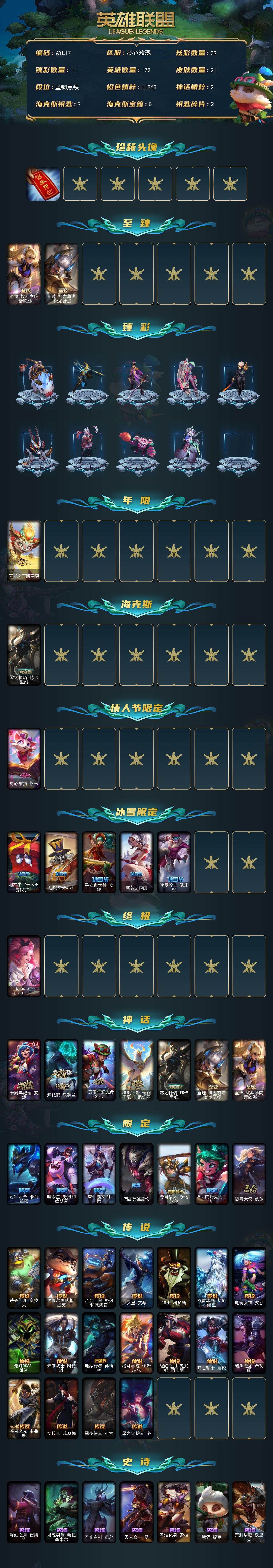 【店主推荐捡漏号!可直接换绑】黑铁段位-172英雄-211皮肤-28炫彩-3终极-7神话-14限定-18传说-49史诗 【珍稀头像】:红包头像 【至臻皮肤】:至臻战斗学院蕾欧娜,至臻神龙尊者炎龙瑟提 【臻彩皮肤】:无畏骑士瑟庄妮赤子初心,冠军之矛卡莉丝塔凯旋圣装,玉剑传说无极麒麟,幻灵战斗猫金克丝梦幻强袭,源计划火菲奥娜惩戒,霸天异形卡兹克刹那银光,星之守护者卡莎热情之光,可爱可爱粉红红布里茨,魔女阿卡丽虚荣,净雪之月莫甘娜冬虹,花仙子崔丝塔娜蓝闪 【年限皮肤】:天龙之子斯莫德 【海克斯皮肤】:零之呛骑赫卡里姆 【情人节限定】:觅心猫猫悠米 【冰雪限定】:阿木木“主人不要我了”,胡桃夹子萨科,平安夜女神娑娜,雪装奈德丽,魄罗骑士瑟庄妮 【终极皮肤】:kdaallout萨勒芬妮独立音乐人 【神话皮肤】:十周年纪念安妮,源代码乐芙兰,十五周年纪念希维尔,神凰行者瑞羽圣凰艾尼维亚,零之呛骑赫卡里姆,至臻神龙尊者炎龙瑟提,至臻战斗学院蕾欧娜 【限定皮肤】:冠军之矛卡莉丝塔,暗杀星努努和威朗普,ssg嘉文四世,暗裔英雄盖伦,野兽猎人泰达米尔,波比的巧克力工坊,防暴天使凯尔 【传说皮肤】:铁哥们儿奥拉夫,约德尔国队长提莫,合金巨兽努努和威朗普,女皇艾希,绅士科加斯,双重冰晶艾尼维亚,电玩女神娑娜,最终boss维迦,未来战士凯特琳,地狱行者孙悟空,战斗学院伊泽瑞尔,腥红之月鬼武姬阿卡丽,死亡骑士盖伦,黯黑魔龙希瓦娜,苍穹之光韦鲁斯,女校长菲奥娜,黑夜使者亚索,星之守护者洛 【史诗皮肤】:腥红之月崔斯特,摄魂男爵弗拉基米尔,圣光审判凯尔,天人合一易,圣洁化身索拉卡,熊猫提莫,荒野豺狼沃里克,法国皇室厄运小姐,国王泰达米尔,百夫长贾克斯,炼金狂士辛吉德,熔火之心拉莫斯,武动巅峰萨科,战争血统蒙多,穿着正装的恶魔维迦,驯龙大师斯维因,抵抗军天使凯特琳,海贼魅影卡特琳娜,前线指挥官卡特琳娜,暗星奥莉安娜,防弹武僧李青,地下拳王李青,苍穹之光薇恩,生化博士黑默丁格,铁血猎手奈德丽,四神之力乌迪尔,血色之锤波比,飞车暴走族古拉加斯,实习护士阿卡丽,刺客信条凯南,腥红之月凯南,铁甲雄心盖伦,血色精锐锐雯,兔女郎锐雯,odst地狱伞兵拉克丝,铁血猎人雷恩加尔,暗黑武士雷恩加尔,暗星韦鲁斯,夜鸦菲奥娜,沙之守护卡兹克,生化骑士德莱厄斯,血羽凤凰奎因,亚特兰蒂斯辛德拉,野火之藤婕拉,西部牛仔亚索,战地机甲维克兹,腥红之月烬,黯焰双魂千珏,冲击之刃劫 【王者皮肤】:星空之门内瑟斯,霹雳游侠弗拉基米尔,死亡骑士内瑟斯,战地之王加里奥 【勇士皮肤】:亮丽女神希维尔 【典藏皮肤】:魔导绅士维迦,宗师级锻造训练师 【其他皮肤1】:小红帽安妮,银河魔装机神安妮,战斗公主安妮,风执事加里奥,地狱火加里奥,地下都市梦魇崔斯特,西部魔影厄加特,潮流女王乐芙兰,社会名流乐芙兰,学生会长弗拉基米尔,星战易,荒野镖客阿利斯塔,后场堡垒阿利斯塔,黯晶巨牛阿利斯塔,部落精神瑞兹,武仙座海格力斯赛恩,腥红之月希维尔,森林女神索拉卡,军情五处提莫,约德尔海贼团崔丝塔娜,冻原猎手沃里克,黑暗骑士沃里克,攻城巨兽努努和威朗普,特工狂花厄运小姐,星之守护者厄运小姐,勇敢的心艾希,宗师级钓鱼训练师贾克斯,光明骑士贾克斯,杀戮天使昔拉莫甘娜,时间机器基兰,腥红之月基兰,抵抗军绿魔辛吉德,假面女皇伊芙琳,首领图奇,黑金诱惑图奇,横行霸道图奇,五杀摇滚主唱卡尔萨斯,狂欢阿木木,沙之守护拉莫斯,健美教练蒙多,深海一号卡萨丁,莲花之令艾瑞莉娅,老兵普朗克,大力水手普朗克,急速前进库奇,光明骑士卡尔玛,灰胡子魔法师维迦,垃圾场特朗德尔,传统造型特朗德尔,海贼参谋斯维因,擂台皇帝布里茨,暮色呛骑布里茨,珊瑚礁墨菲特,赏金猎人卡特琳娜,战斗学院卡特琳娜,劫掠梦魇魔腾,恶咒亡魂魔腾,烈焰古树茂凯,图腾古树茂凯,荒野之咬雷克顿,血石战神雷克顿,银河魔装机神伊莉丝,末日余生布兰德,摩登骇客薇恩,热带丛林兰博,魔女卡西奥佩娅,银河魔装机神奈德丽,龙神之力乌迪尔,英仙座珀尔修斯潘森,冒险精神伊泽瑞尔,足球先生伊泽瑞尔,黑桃皇牌伊泽瑞尔,龙骑士莫德凯撒,蜂刺阿卡丽,奈落之炎阿卡丽,银色闪电凯南,海上霸主盖伦,瓦尔基里蕾欧娜,刺客信条泰隆,灵魂莲华锐雯,极寒慎,炎爆慎,冲击之刃慎,游侠法师拉克丝,战地法师泽拉斯,苔原猎手菲兹,北地风暴沃利贝尔,警长沃利贝尔,怒熊沃利贝尔,坚韧不屈沃利贝尔,夜魔水晶韦鲁斯,西部魔影天使韦鲁斯,全金属狂潮维克托,野兽女王瑟庄妮,死亡骑士瑟庄妮,科学狂人吉格斯,少校吉格斯,小怪兽训练师璐璐,热血班长德莱厄斯,血石妖后丽桑卓,银河魔装机神纳尔,泳池派对扎克,真实伤害亚索,墨之影武者亚索,布隆狮心,海牛大大塔姆,夺命前锋卢锡安,女警官蔚,奥德赛亚托克斯,宇航员巴德,永恒之森洛,绝息圣堂洛,灵能特工派克,灵魂莲华莉莉娅,太空律动百万调音格温