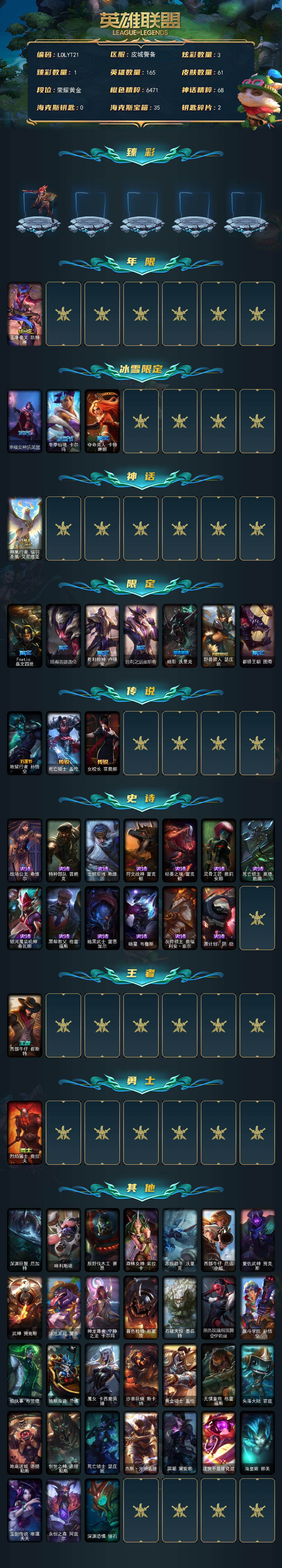 【lolyt21】165英雄/61皮肤/1神话/11限定/1臻彩/3炫彩/3传说/13史诗/黄金/黎明使者锐雯黑夜使者/玉净夜叉凯特琳/幸福女神乐芙兰/冬季仙境卡尔玛/夺命美人卡特琳娜/神凰行者瑞羽圣凰艾尼维亚/fnatic嘉文四世/暗裔英雄盖伦/胜利呛神卢锡安/胜利之运崔斯特/暗影沃里克/野兽猎人瑟庄妮/都铎王朝图奇/地狱行者孙悟空/死亡骑士盖伦/女校长菲奥娜/战场公主希维尔/特种部队普朗克/北领前线斯维因/符文战神雷克顿/枯萎之壤雷克顿/灵骨工匠奥莉安娜/死亡领主莫德凯撒/银河魔装机神希瓦娜/黑帮教父格雷福斯/暗黑武士雷恩加尔/暗星韦鲁斯/灰烬领主奥瑞利安索尔/源计划阴劫/西部牛仔崔斯特/烈焰猛士奥拉夫/深渊巨蟹厄加特/哞利斯塔/原野伐木工赛恩/森林女神索拉卡/冻原猎手沃里克/西部牛仔厄运小姐/复仇武神贾克斯/武神贾克斯/泳池派对蒙多/神龙尊者宁静之龙卡尔玛/暮色呛骑布里茨/石破天惊墨菲特/黑色玫瑰假面舞会伊莉丝/战斗学院孙悟空/焰执事布兰德/独眼海盗兰博/魔女卡西奥佩娅/沙暴巨蝎斯卡纳/黄金骑士盖伦/无情重炮格雷福斯/失落大陆菲兹/地底迷城诺提勒斯/创世之神诺提勒斯/死亡骑士瑟庄妮/杰斯光明之锤/黑潮黛安娜/这货不是维克兹/海皇姬娜美/玉剑传说寒潭夭夭/永恒之森阿兹尔/深渊恐惧锤石