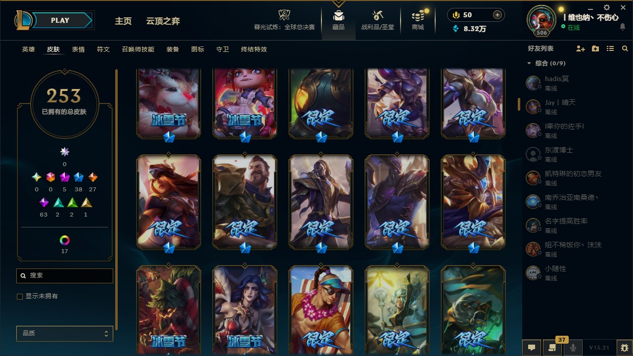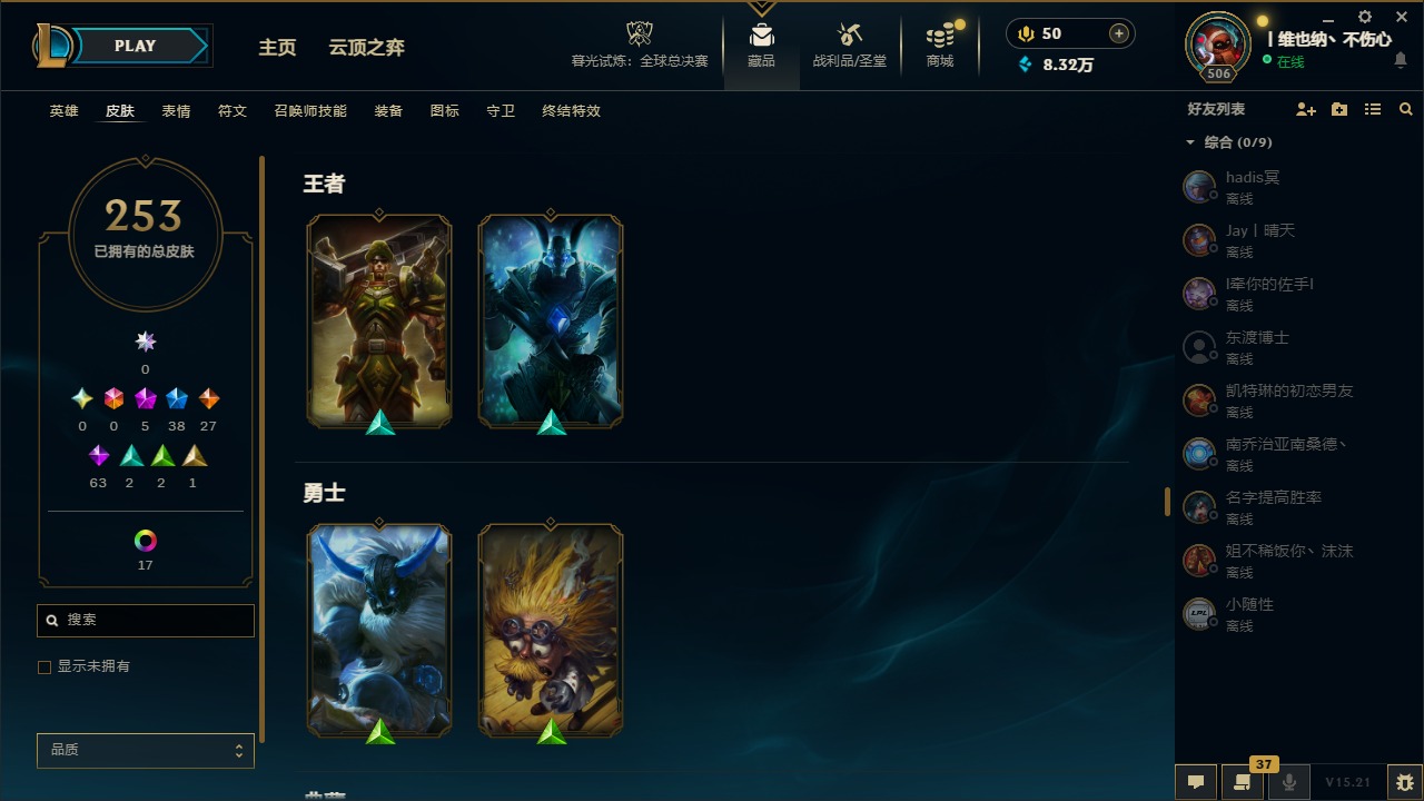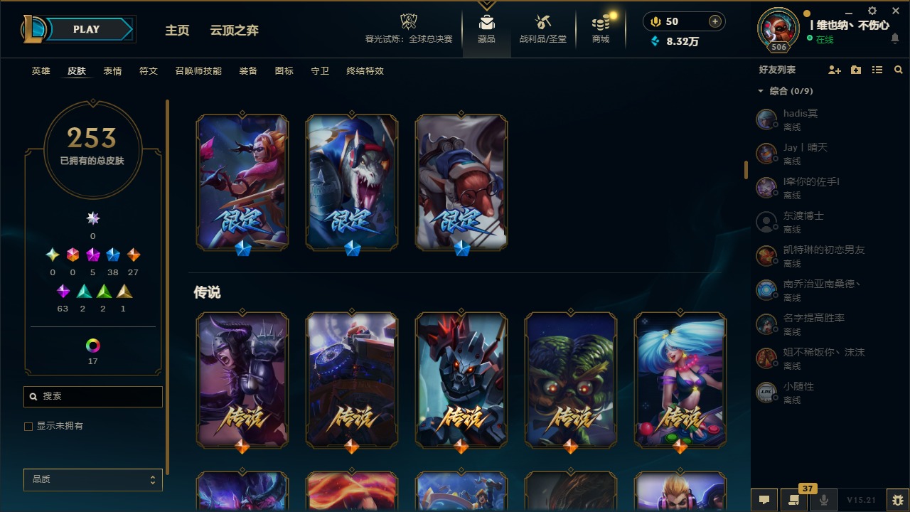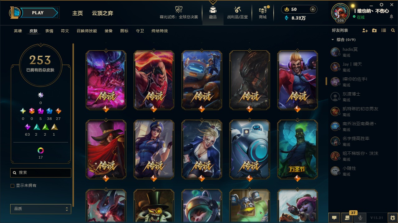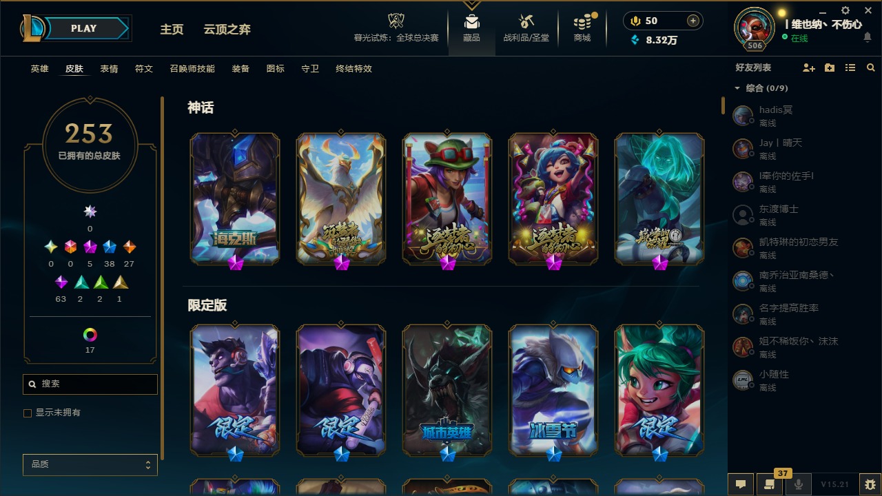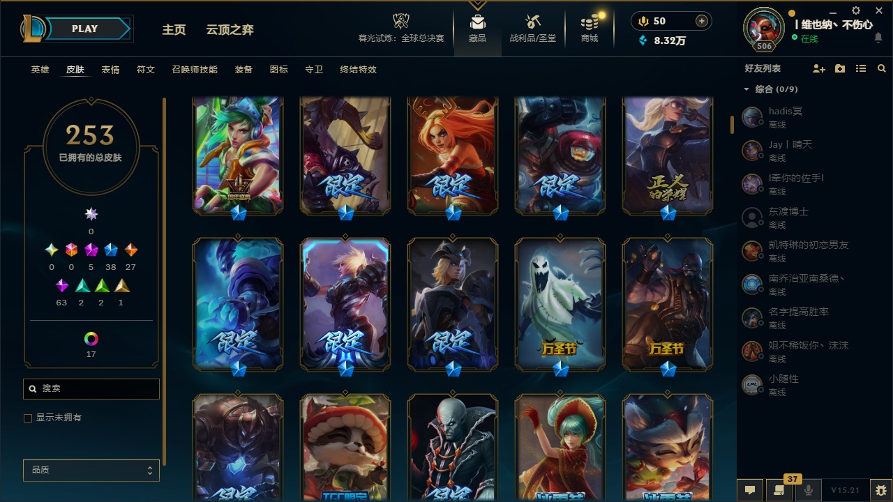 [14399379]5神话 38限定 27传说 63史诗 253皮肤 22炫彩 171英雄 可二次 可修改实名 【海克斯】:海克斯 阿利斯塔 【赛季限定皮】:胜利女神-菲奥娜胜利女神 希维尔胜利之树 茂凯胜利呛神 格雷福斯胜利女神 奥莉安娜胜利之剑 亚托克斯胜利呛神 卢锡安胜利机器人