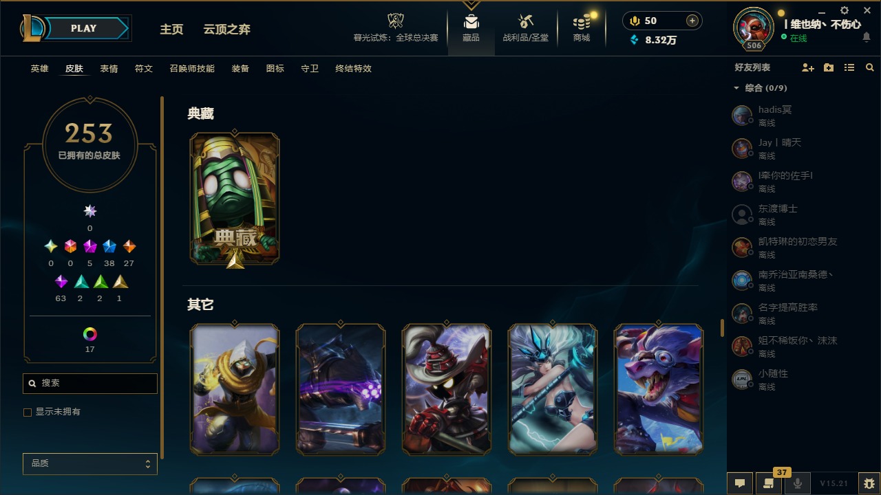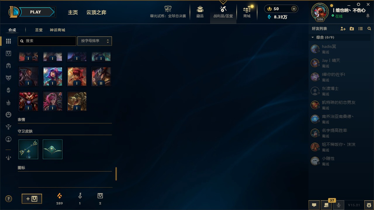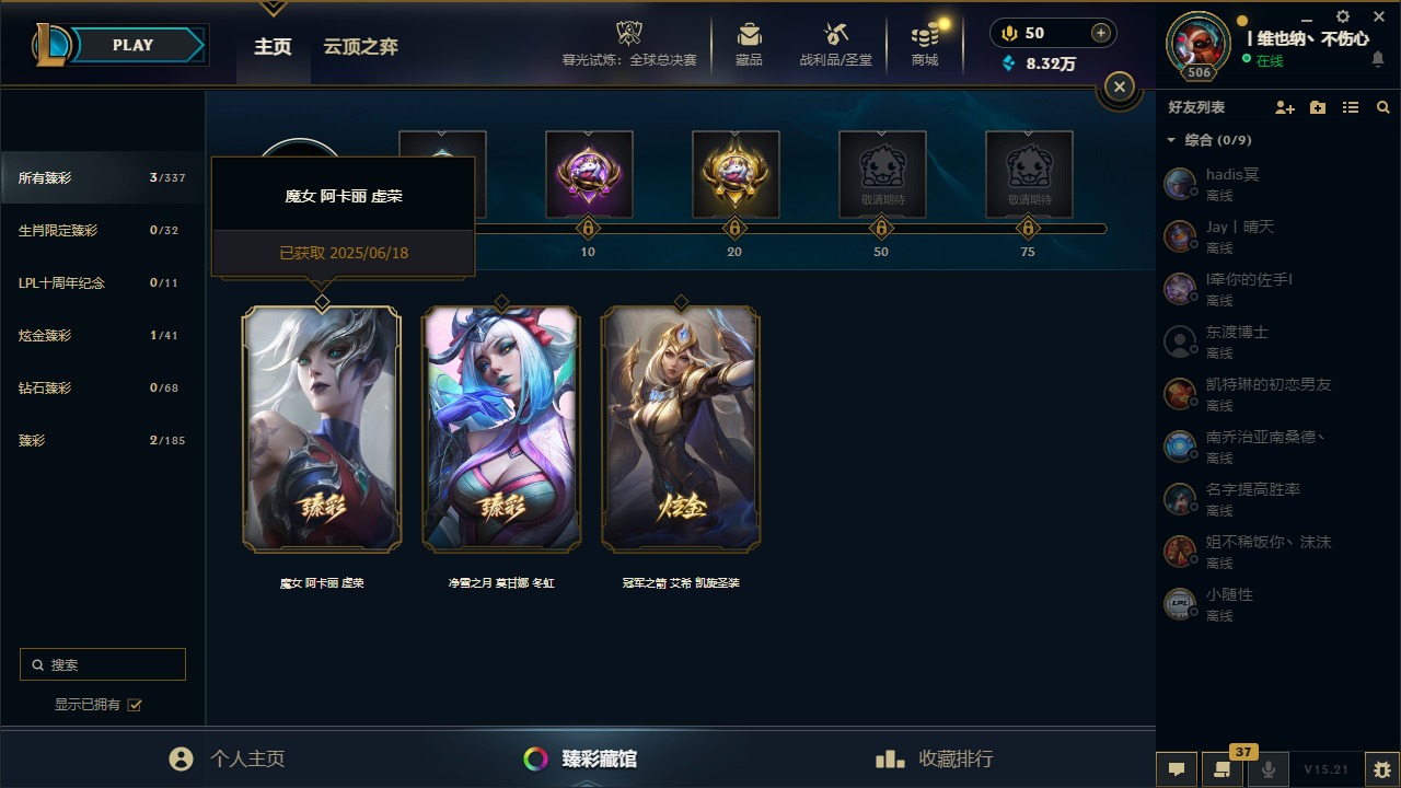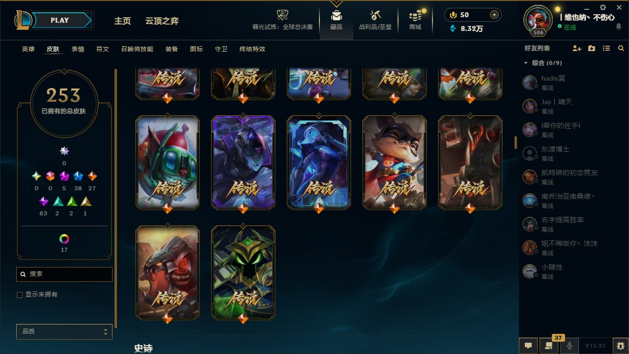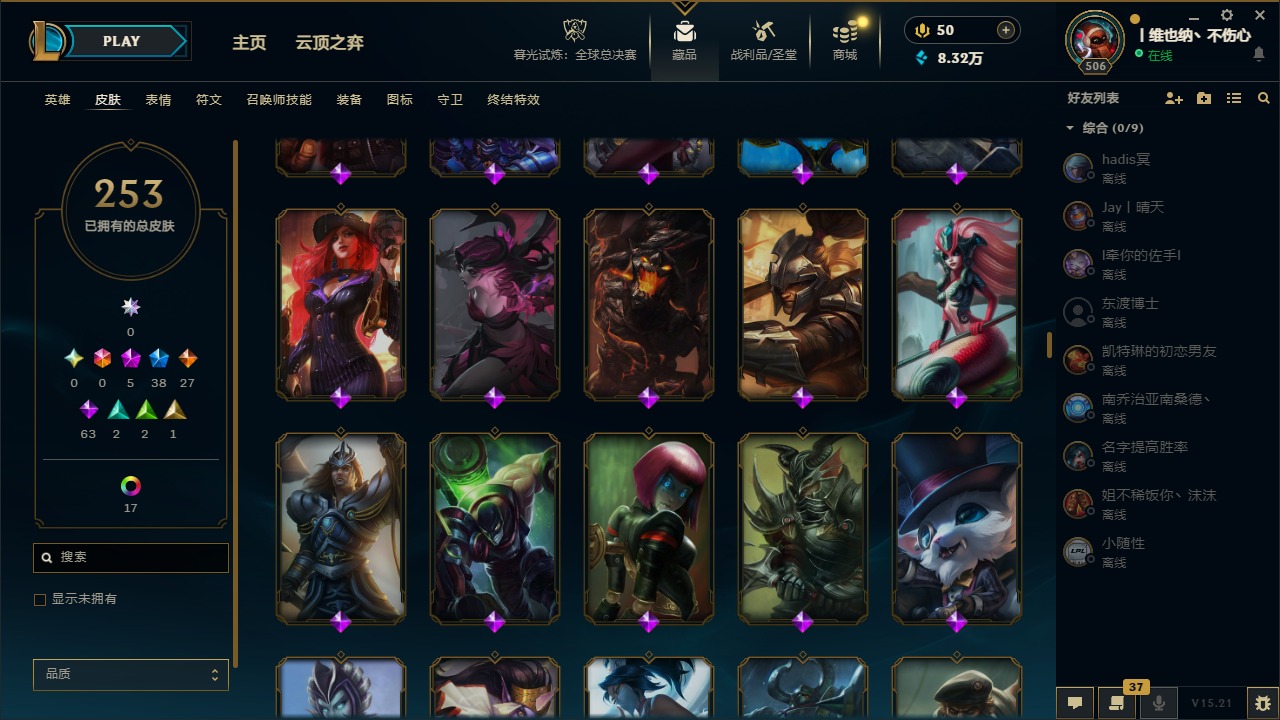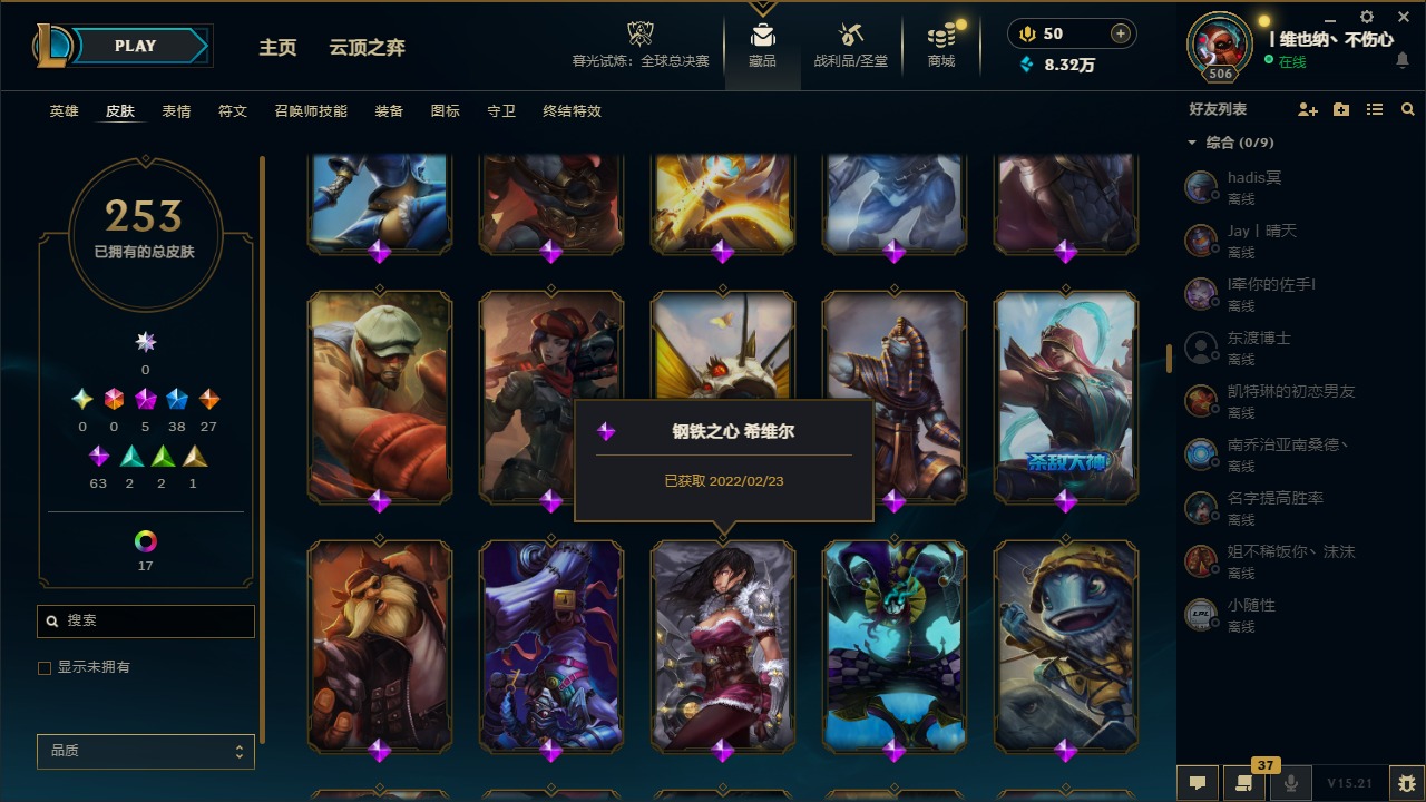 [14399379]5神话 38限定 27传说 63史诗 253皮肤 22炫彩 171英雄 可二次 可修改实名 【海克斯】:海克斯 阿利斯塔 【赛季限定皮】:胜利女神-菲奥娜胜利女神 希维尔胜利之树 茂凯胜利呛神 格雷福斯胜利女神 奥莉安娜胜利之剑 亚托克斯胜利呛神 卢锡安胜利机器人