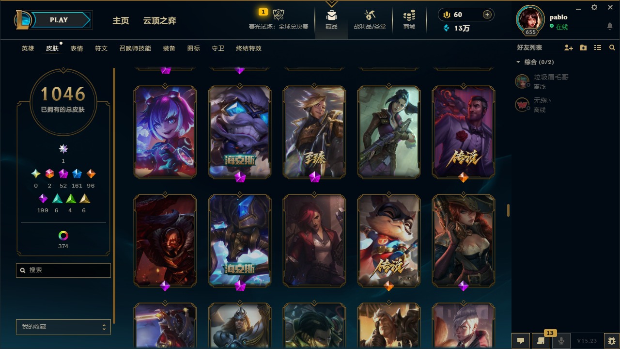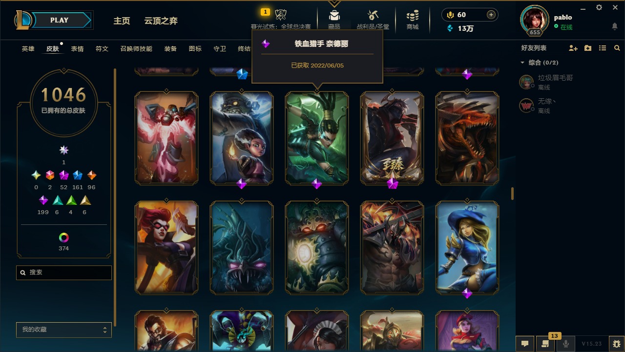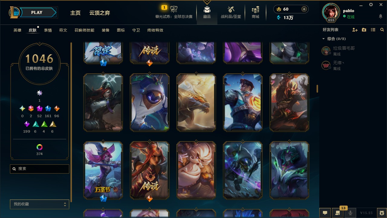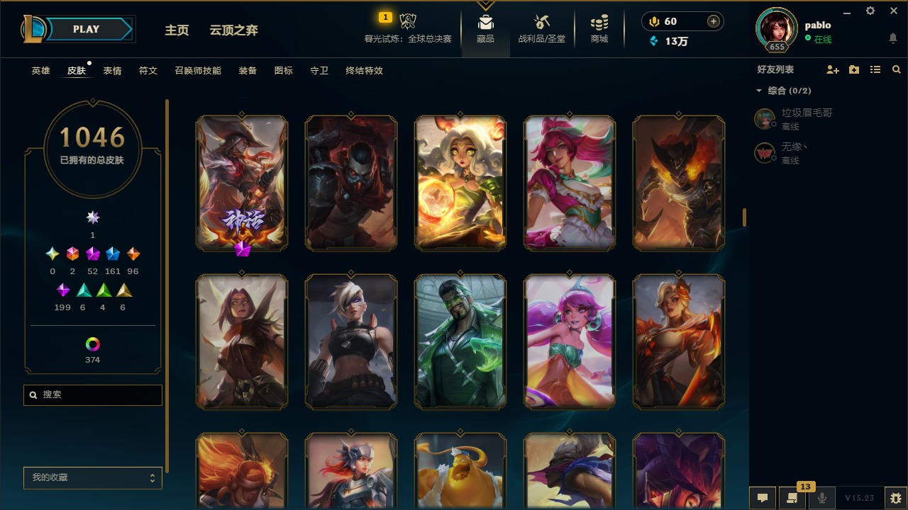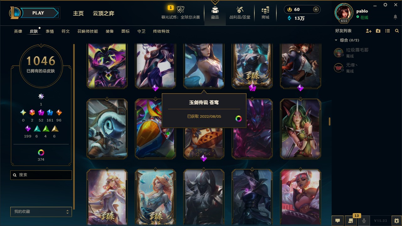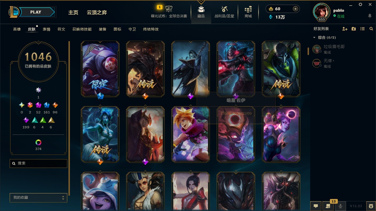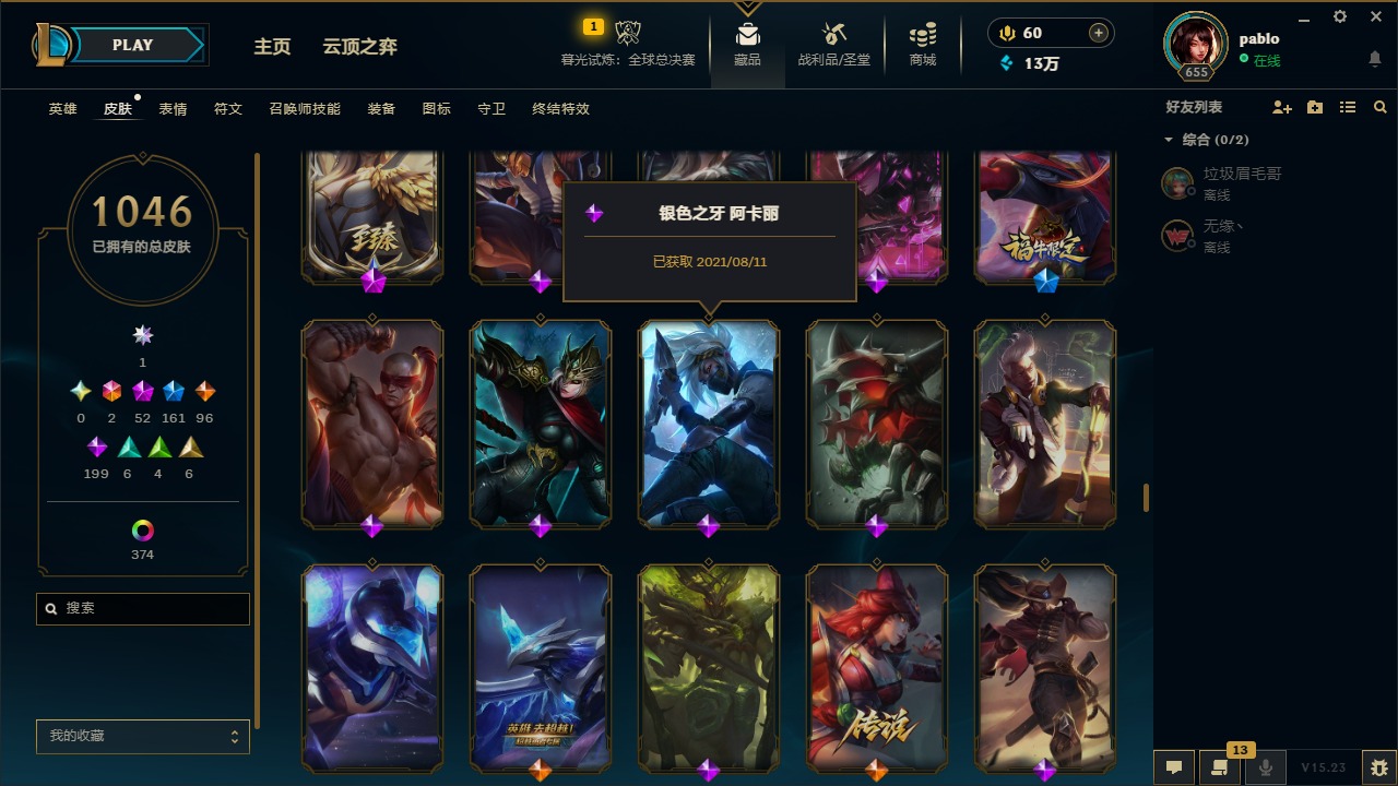 1卓越 2终极 52神话 161限定 96传说 199史诗 1046皮肤 450炫彩 172英雄 可二次 可修改实名 【卓越】:殿堂传奇 阿狸 【至臻】:至臻 未来战士 锤石2022至臻 绒毛 菲兹2022至臻 drx 亚托克斯至臻 暗星女王 黛安娜至臻 狼神英灵 斯维因至臻 魔