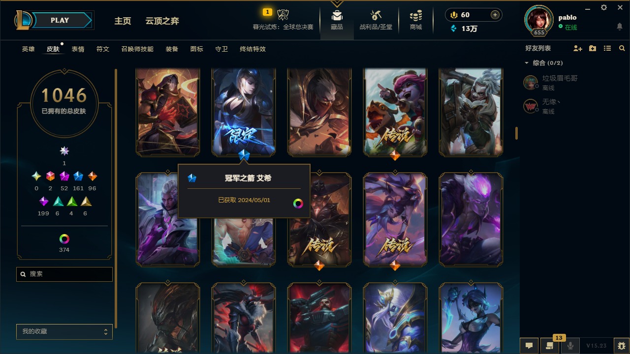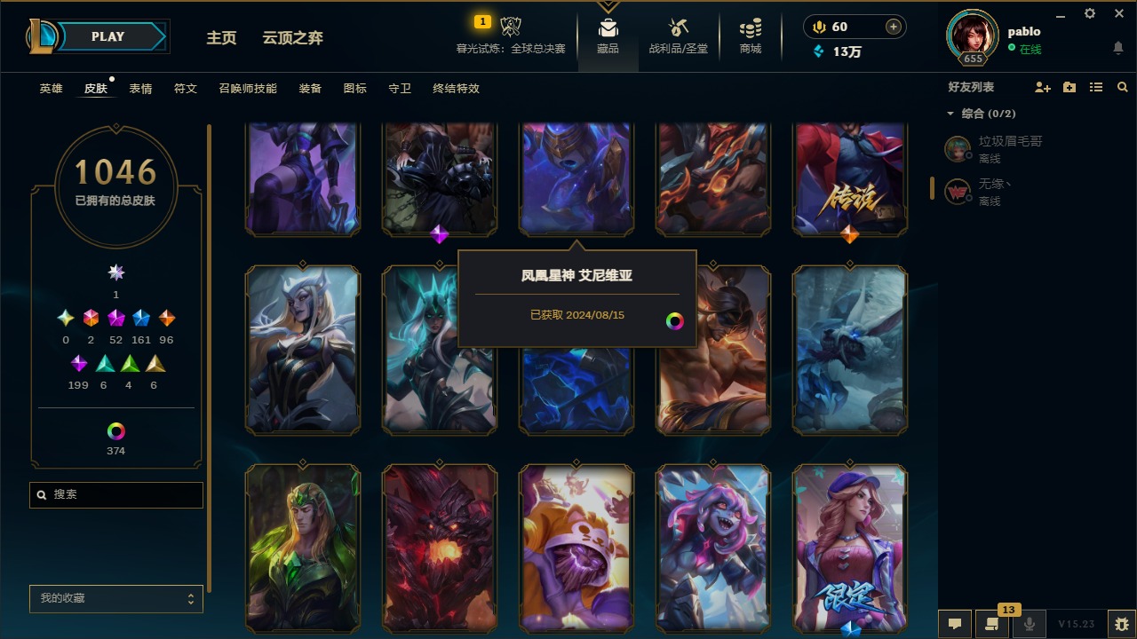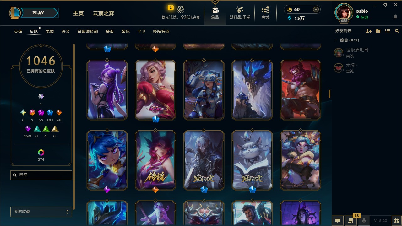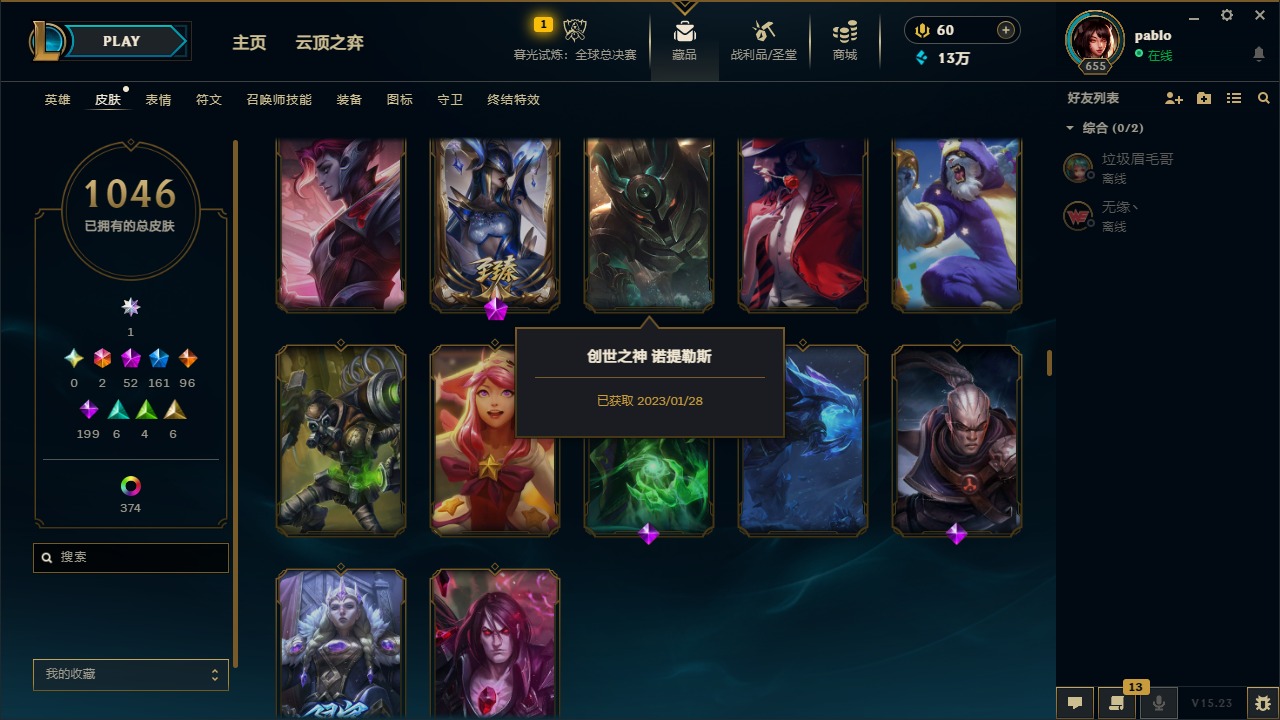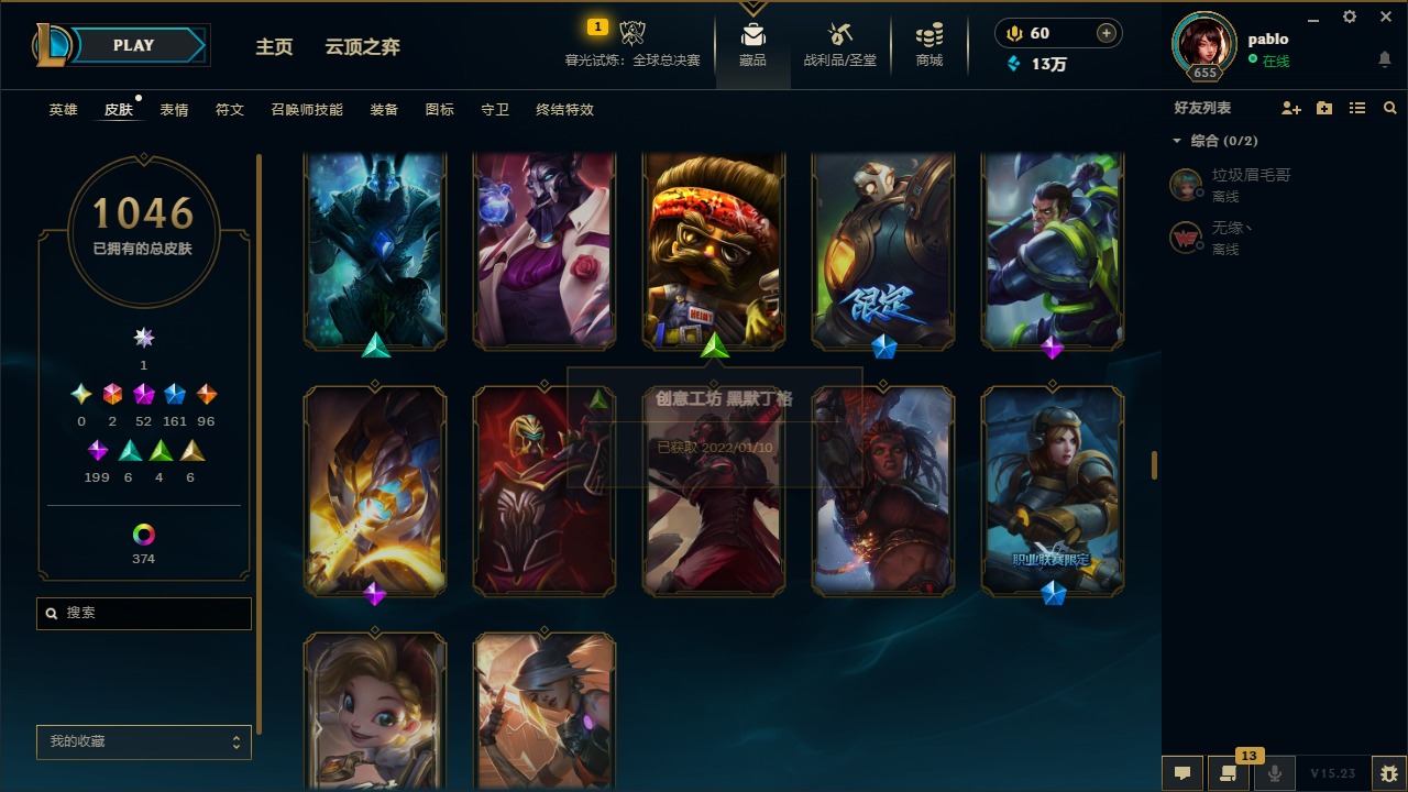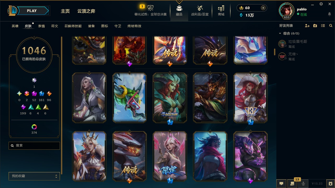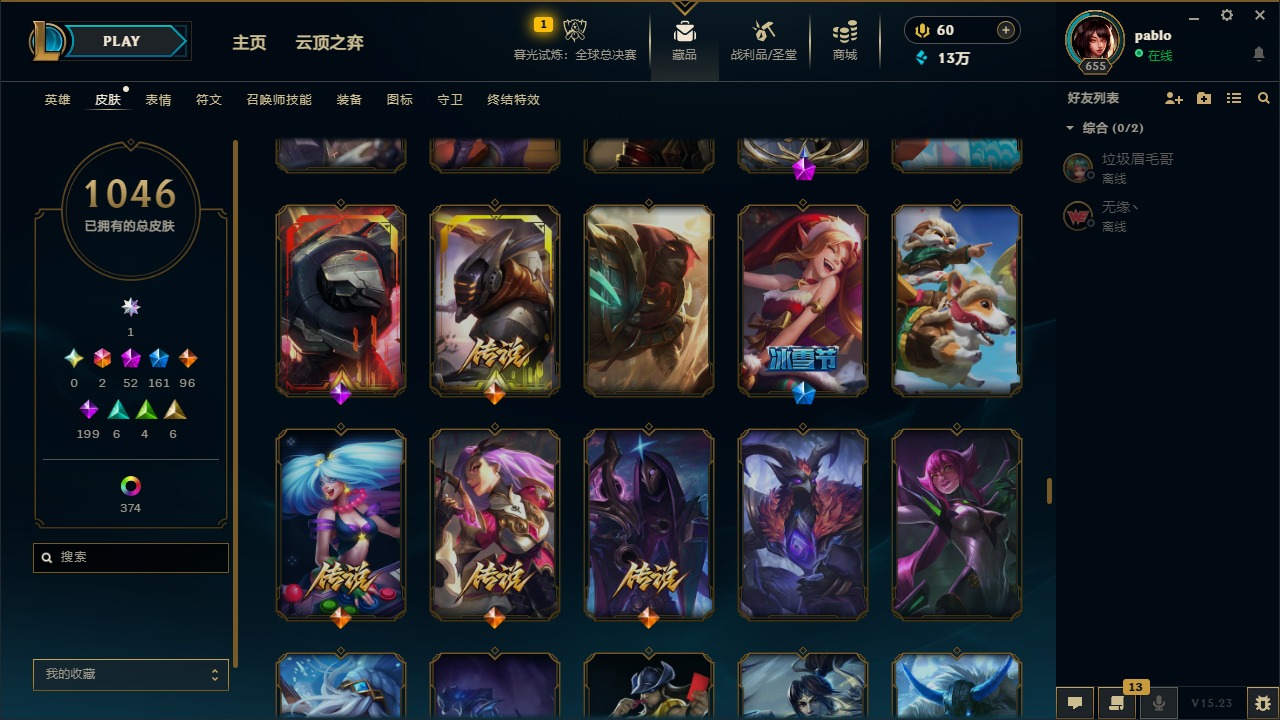 1卓越 2终极 52神话 161限定 96传说 199史诗 1046皮肤 450炫彩 172英雄 可二次 可修改实名 【卓越】:殿堂传奇 阿狸 【至臻】:至臻 未来战士 锤石2022至臻 绒毛 菲兹2022至臻 drx 亚托克斯至臻 暗星女王 黛安娜至臻 狼神英灵 斯维因至臻 魔