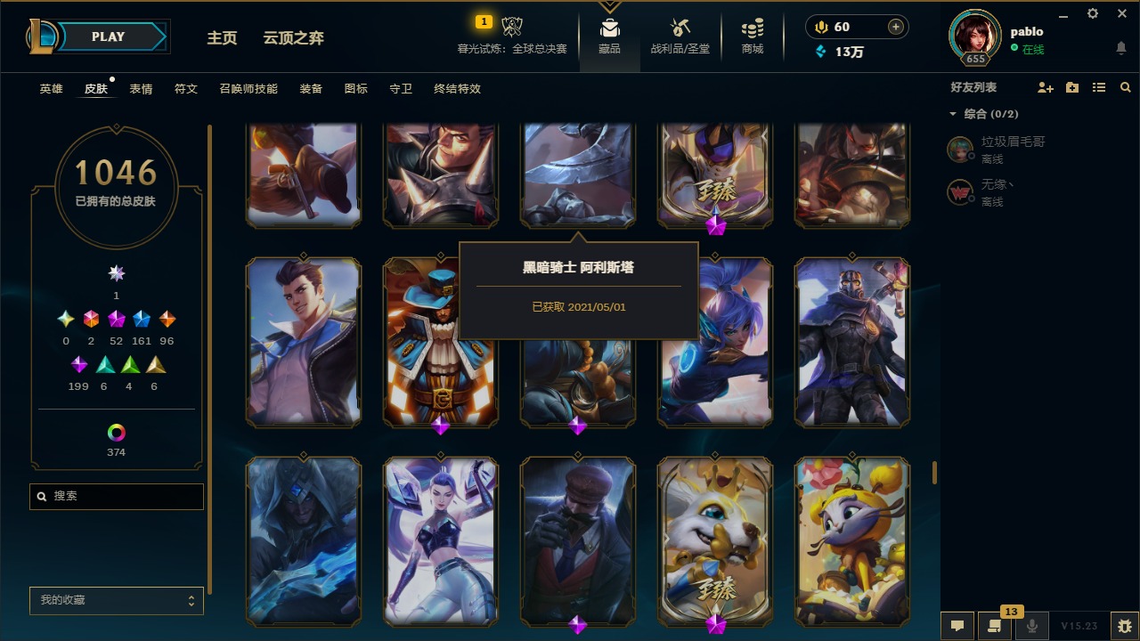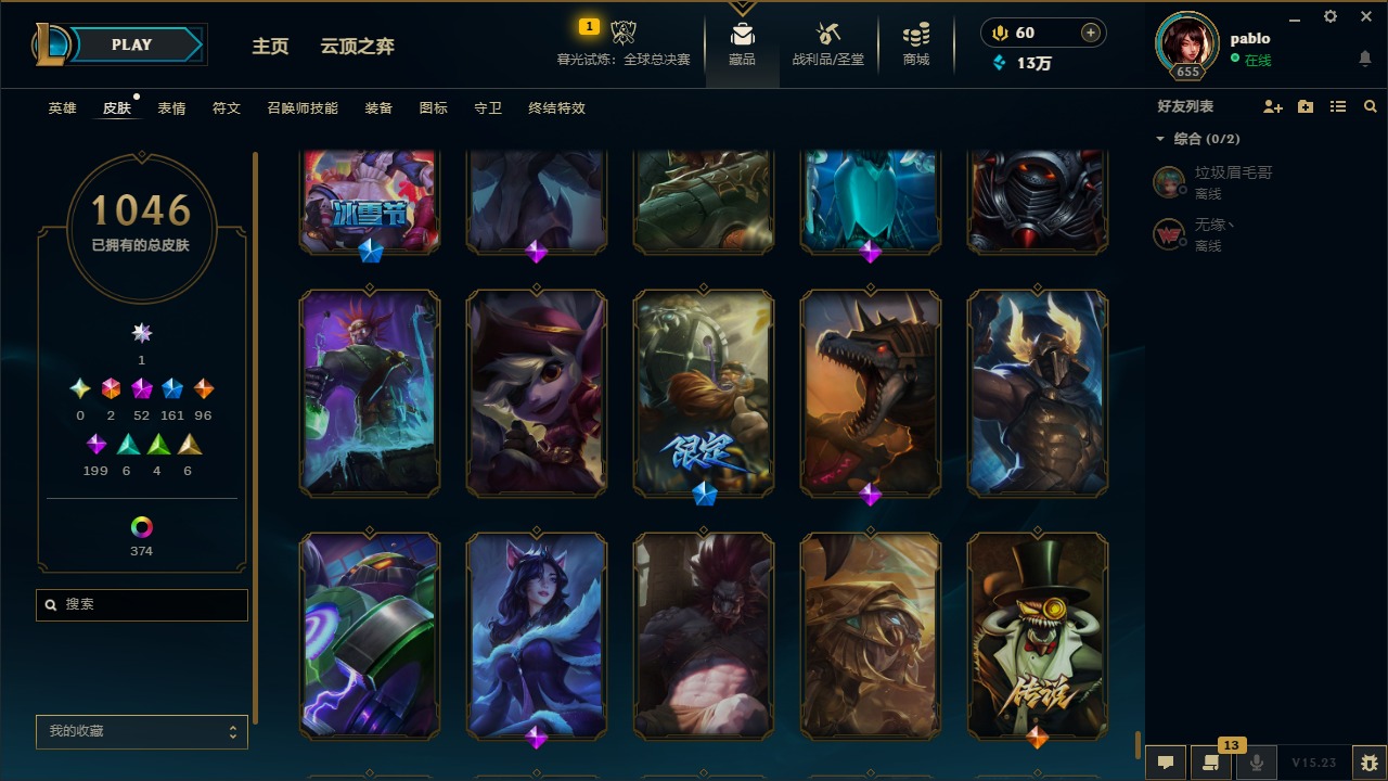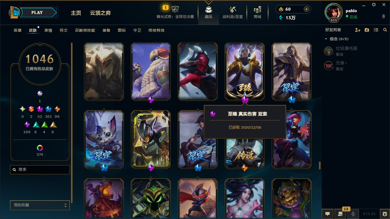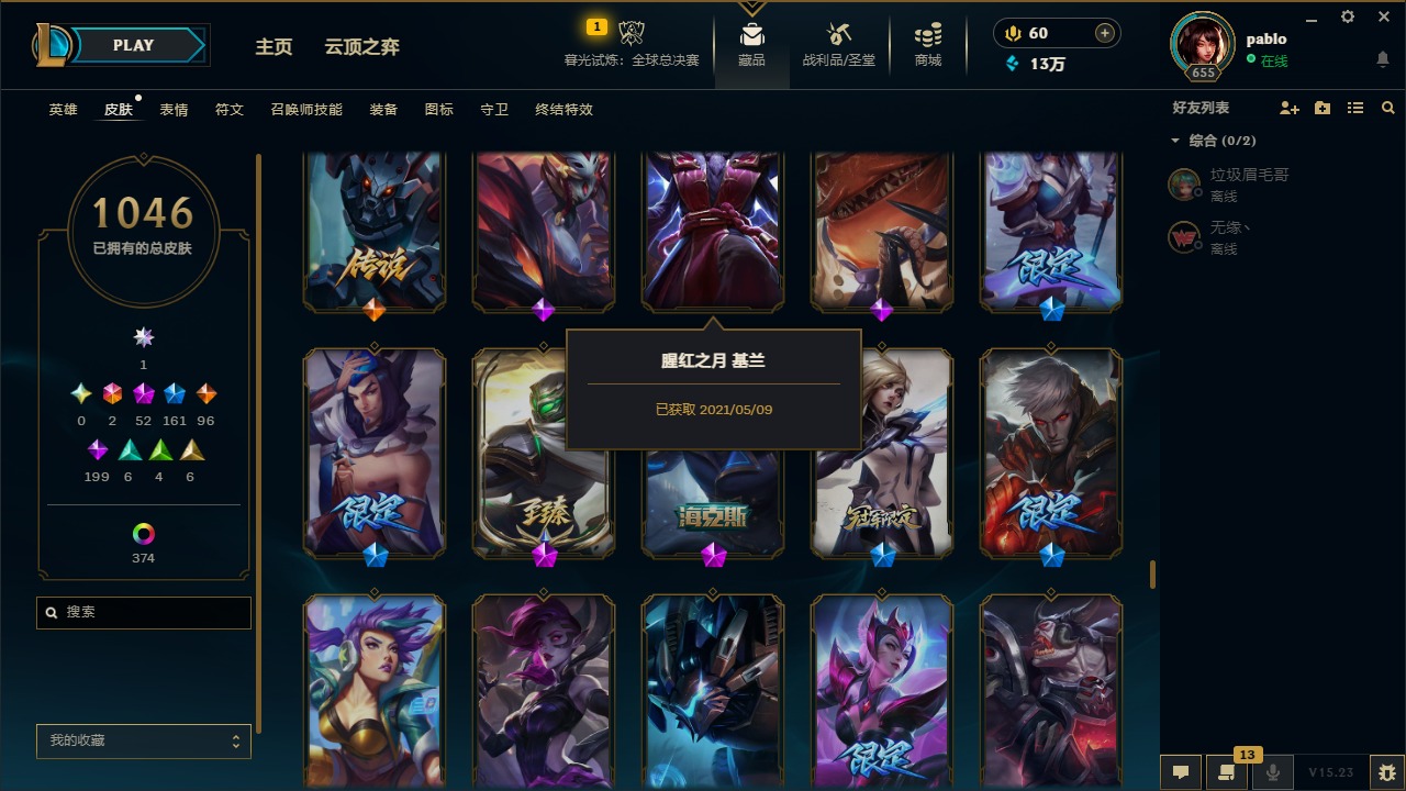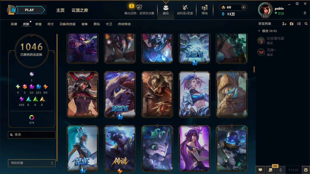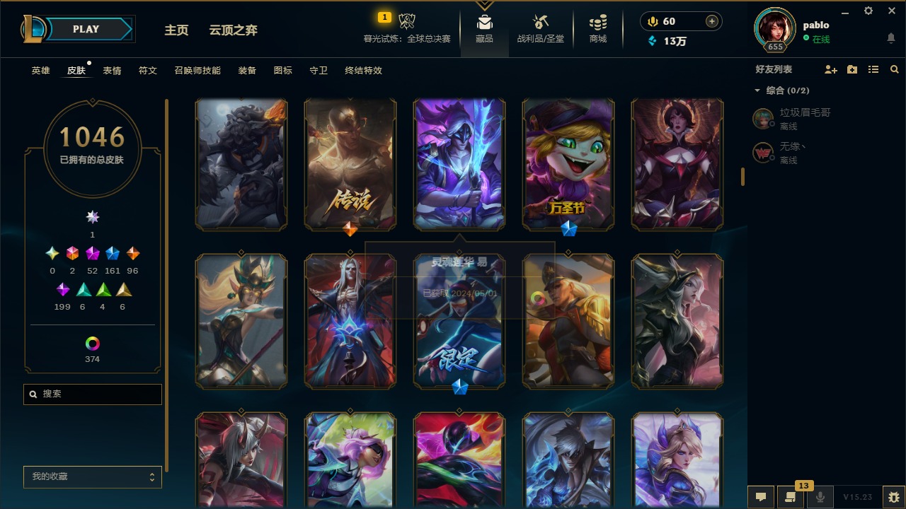 1卓越 2终极 52神话 161限定 96传说 199史诗 1046皮肤 450炫彩 172英雄 可二次 可修改实名 【卓越】:殿堂传奇 阿狸 【至臻】:至臻 未来战士 锤石2022至臻 绒毛 菲兹2022至臻 drx 亚托克斯至臻 暗星女王 黛安娜至臻 狼神英灵 斯维因至臻 魔