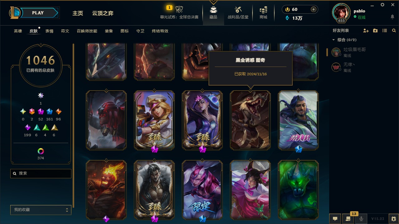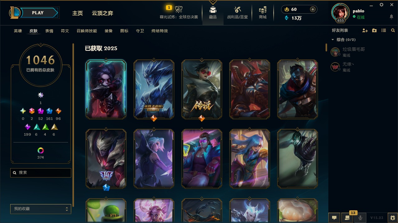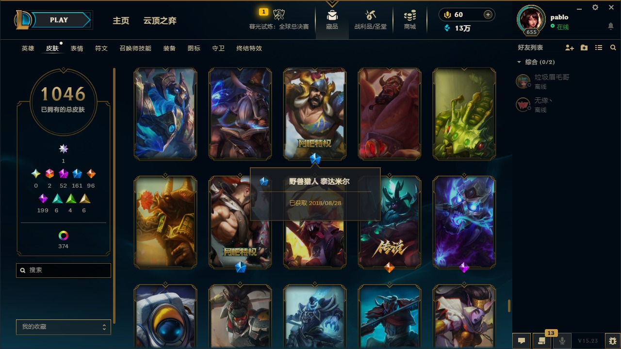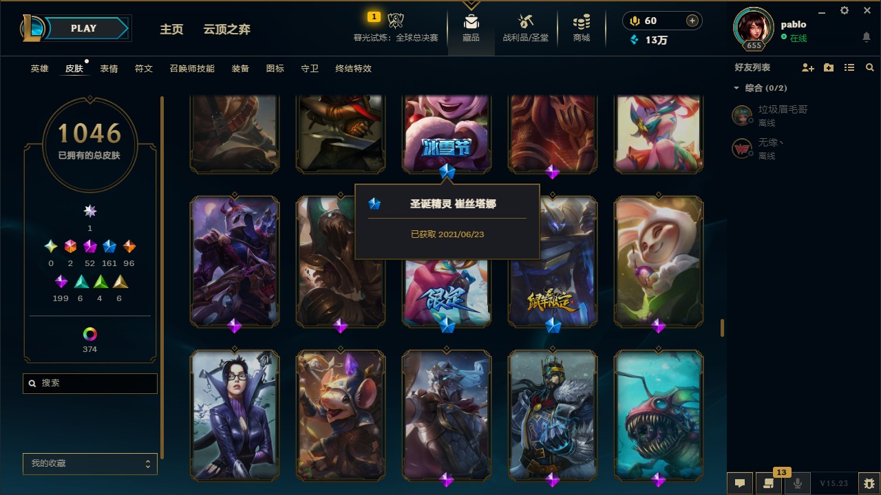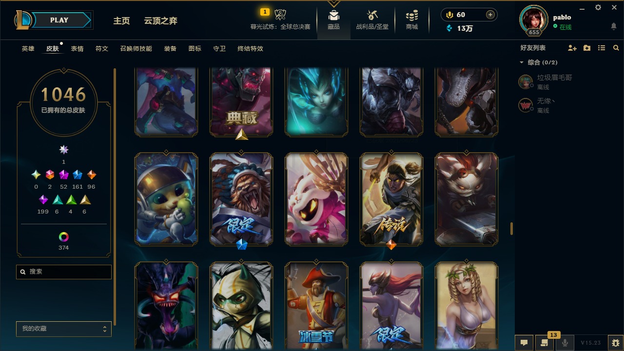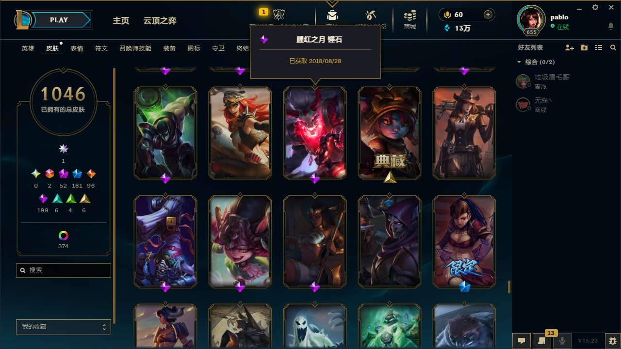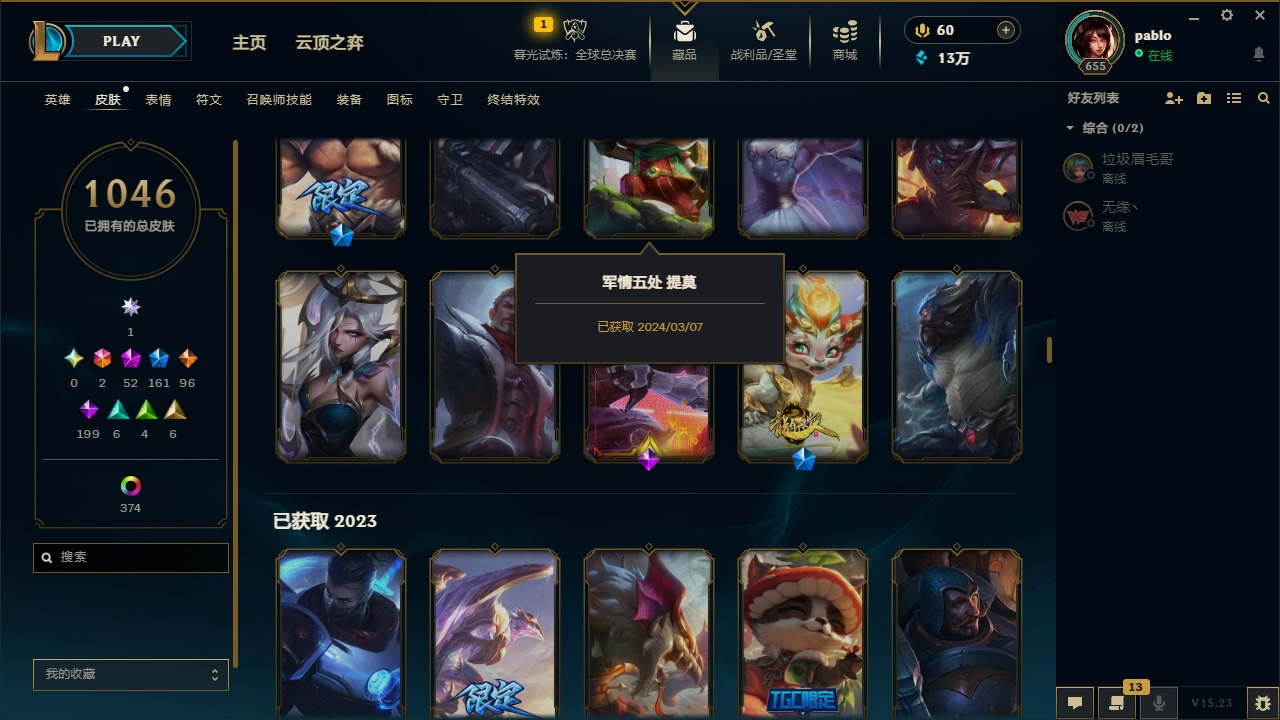 1卓越 2终极 52神话 161限定 96传说 199史诗 1046皮肤 450炫彩 172英雄 可二次 可修改实名 【卓越】:殿堂传奇 阿狸 【至臻】:至臻 未来战士 锤石2022至臻 绒毛 菲兹2022至臻 drx 亚托克斯至臻 暗星女王 黛安娜至臻 狼神英灵 斯维因至臻 魔