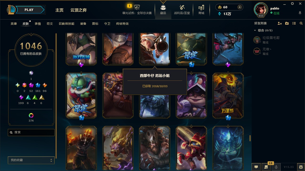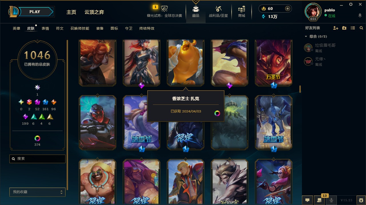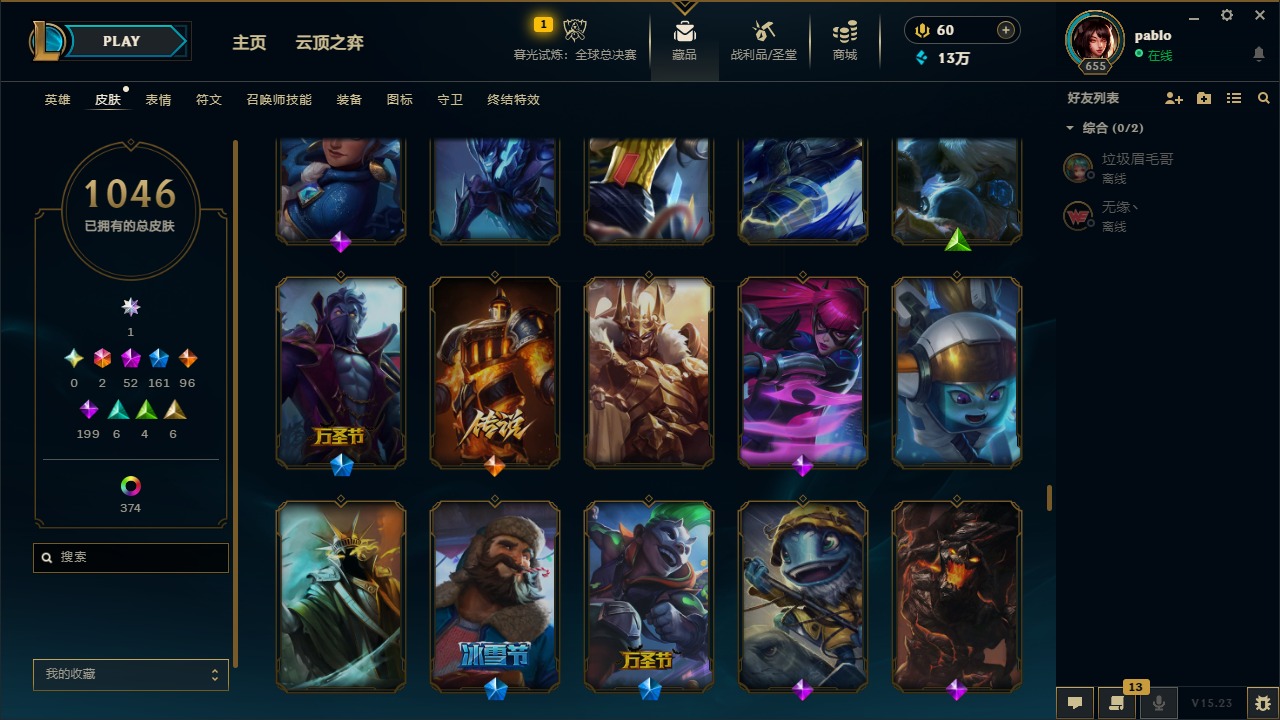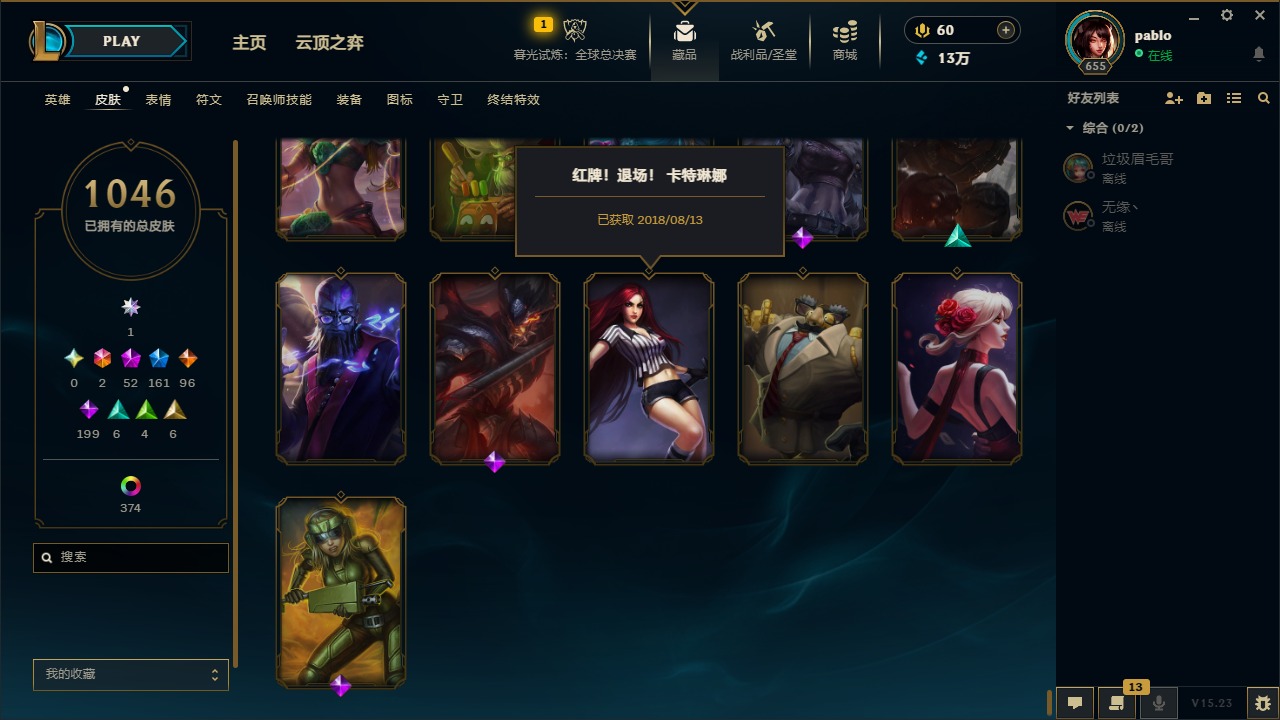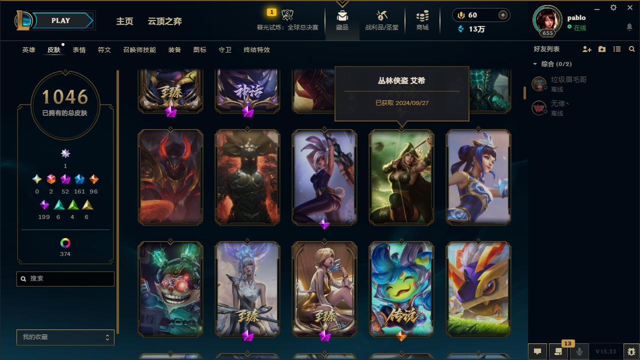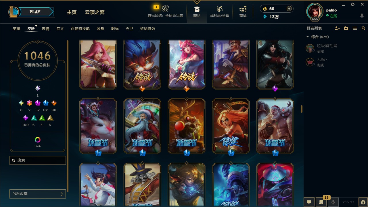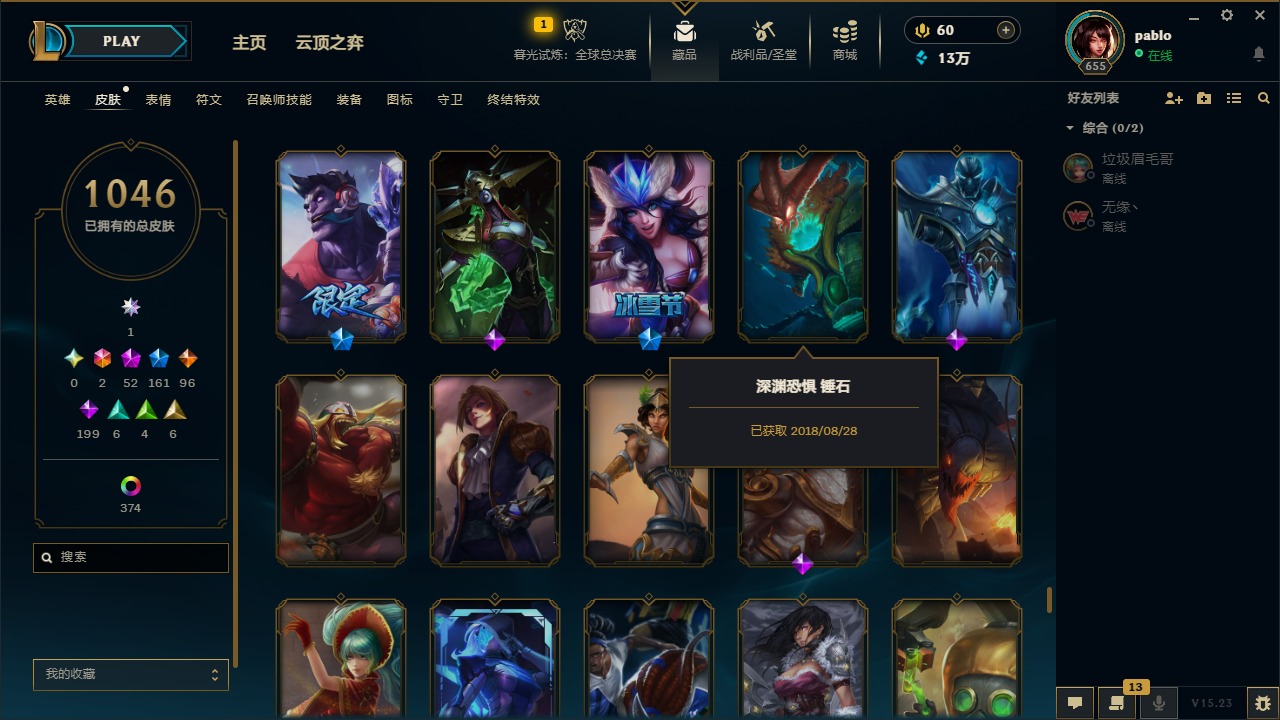 1卓越 2终极 52神话 161限定 96传说 199史诗 1046皮肤 450炫彩 172英雄 可二次 可修改实名 【卓越】:殿堂传奇 阿狸 【至臻】:至臻 未来战士 锤石2022至臻 绒毛 菲兹2022至臻 drx 亚托克斯至臻 暗星女王 黛安娜至臻 狼神英灵 斯维因至臻 魔