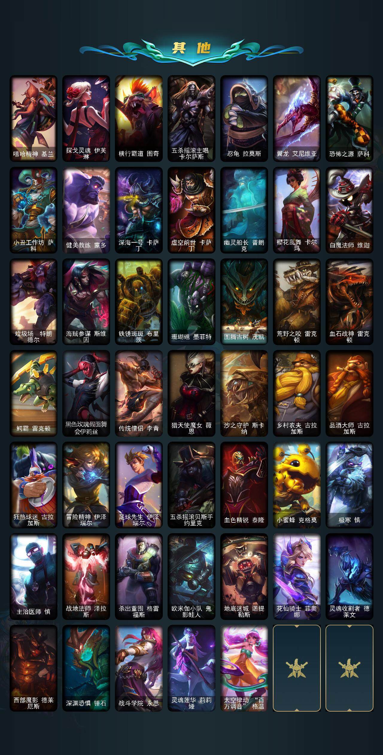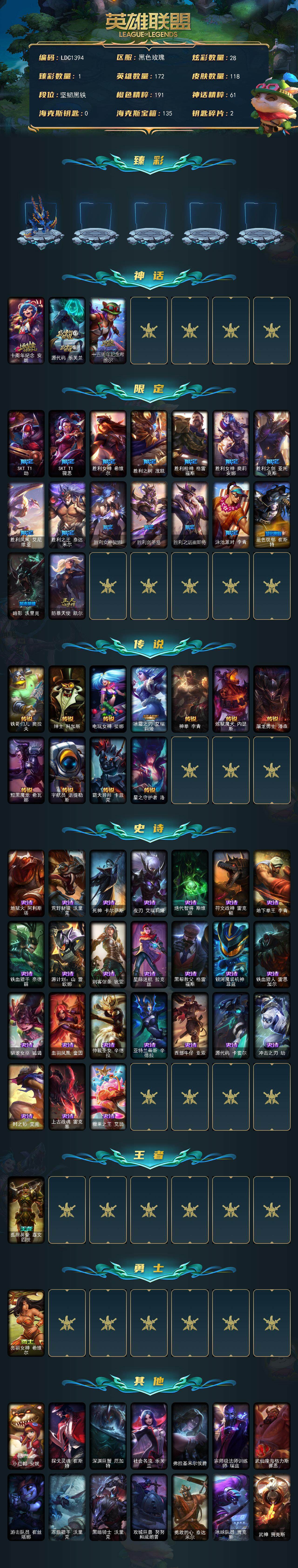 【ldc1394】172英雄/118皮肤/3神话/16限定/1臻彩/28炫彩/11传说/24史诗/未定级/霸天异形卡兹克掠空魅影/十周年纪念安妮/源代码乐芙兰/十五周年纪念希维尔/sktt1劫/sktt1薇恩/胜利女神希维尔/胜利之树茂凯/胜利呛神格雷福斯/胜利女神奥莉安娜/胜利之剑亚托克斯/胜利凤凰艾尼维亚/胜利之王泰达米尔/胜利女神娑娜/胜利剑圣易/胜利之运崔斯特/泳池派对李青/蓝色忧郁崔斯特/暗影沃里克/防暴天使凯尔/铁哥们儿奥拉夫/绅士科加斯/电玩女神娑娜/冰霜之刃艾瑞莉娅/神拳李青/炼狱魔犬内瑟斯/屠龙勇士潘森/黯黑魔龙希瓦娜/宇航员诺提勒斯/霸天异形卡兹克/星之守护者洛/地狱火阿利斯塔/荒野豺狼沃里克/死神卡尔萨斯/夜刃艾瑞莉娅/绝代智将斯维因/符文战神雷克顿/地下拳王李青/铁血猎手奈德丽/源计划山蕾欧娜/刺客信条锐雯/星际迷航拉克丝/黑帮教父格雷福斯/银河魔装机神菲兹/铁血猎人雷恩加尔/驯龙女巫璐璐/血羽凤凰奎因/仲裁圣女辛德拉/亚特兰蒂斯辛德拉/西部牛仔亚索/源代码卡蜜尔/冲击之刃劫/时之砂艾克/上古战魂雷克塞/糖果之王艾翁/孤胆英豪嘉文四世/亮丽女神希维尔/小红帽安妮/探戈灵魂崔斯特/深渊巨蟹厄加特/社会名流乐芙兰/弗拉基米尔侯爵/宗师级法师训练师瑞兹/武仙座海格力斯赛恩/游击队员崔丝塔娜/冻原猎手沃里克/黑暗骑士沃里克/攻城巨兽努努和威朗普/勇敢的心泰达米尔/冰球队员贾克斯/武神贾克斯/嘻哈精神基兰/探戈灵魂伊芙琳/横行霸道图奇/五杀摇滚主唱卡尔萨斯/忍龟拉莫斯/翼龙艾尼维亚/恐怖之源萨科/小丑工作坊萨科/健美教练蒙多/深海一号卡萨丁/虚空前世卡萨丁/幽灵船长普朗克/樱花乱舞卡尔玛/白魔法师维迦/垃圾场特朗德尔/海贼参谋斯维因/铁锈斑斑布里茨/珊瑚礁墨菲特/图腾古树茂凯/荒野之咬雷克顿/血石战神雷克顿/鳄霸雷克顿/黑色玫瑰假面舞会伊莉丝/传统僧侣李青/猎天使魔女薇恩/沙之守护斯卡纳/乡村农夫古拉加斯/品酒大师古拉加斯/狂热球迷古拉加斯/冒险精神伊泽瑞尔/足球先生伊泽瑞尔/五杀摇滚贝斯手约里克/血色精锐泰隆/小蜜蜂克格莫/极寒慎/主治医师慎/战地法师泽拉斯/杀出重围格雷福斯/欧米伽小队鬼影蛙人/地底迷城诺提勒斯/花仙骑士菲奥娜/灵魂收割者德莱文/西部魔影德莱厄斯/深渊恐惧锤石/战斗学院永恩/灵魂莲华莉莉娅/太空律动百万调音格温