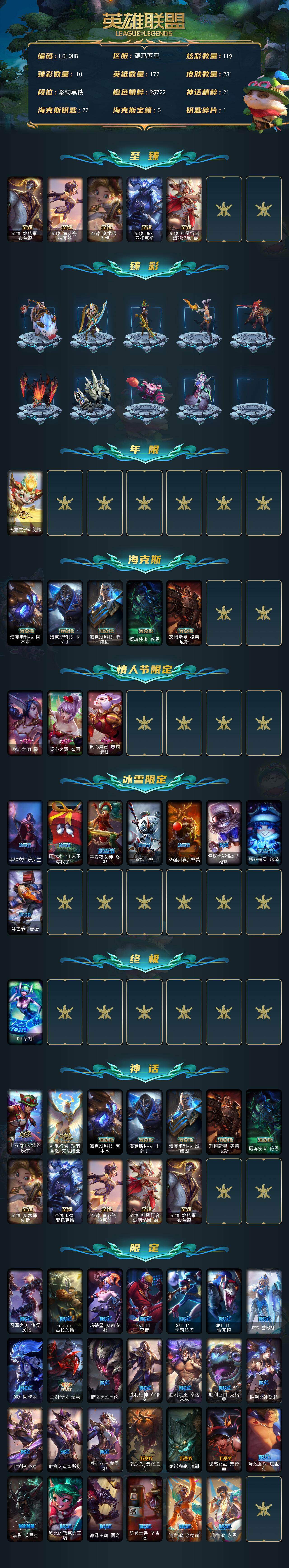 【lolqh8】172英雄/231皮肤/1终极/12神话/39限定/10臻彩/119炫彩/32传说/50史诗/未定级账号等级:370/至 焰执事布兰德/至臻 青花瓷 拉克丝/至臻奥术师佐伊/至臻 drx 亚托克斯/至臻 神凰行者 烈羽焰凰 霞/无畏骑士瑟庄妮赤子初心/冠军之箭艾希凯旋圣装/玉净夜叉凯特琳炫金/雾雨之刃锐雯/黎明使者锐雯黑夜使者/山海绘卷科加斯朱红/霸天巨兽雪崩墨菲特/可爱可爱粉