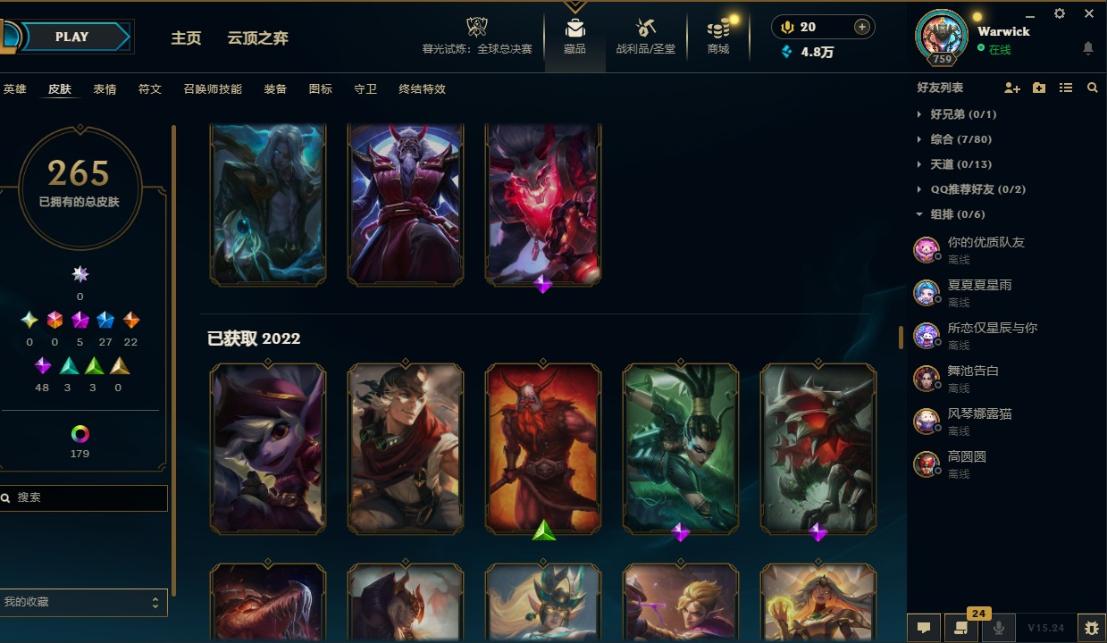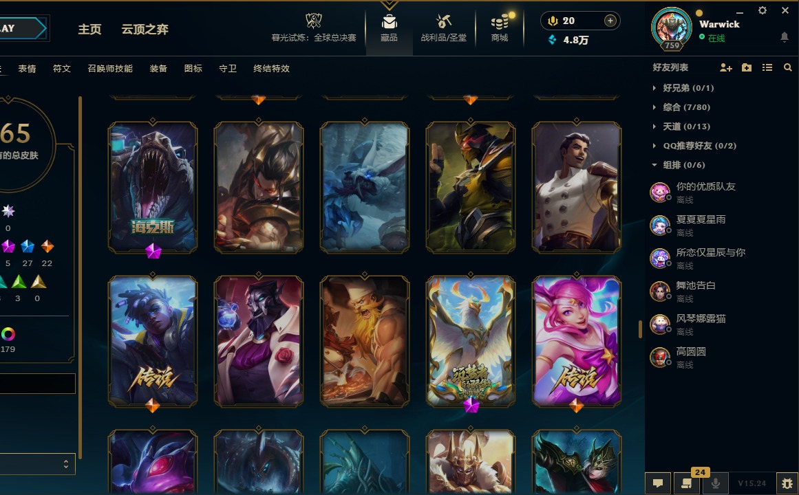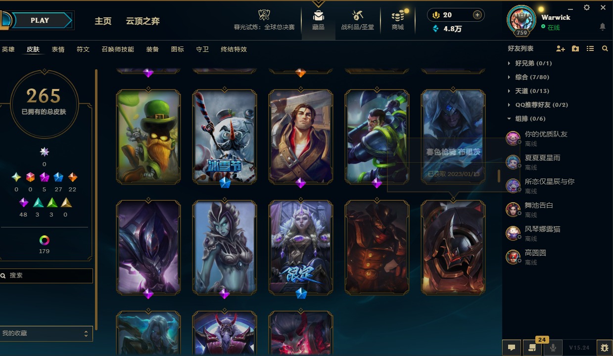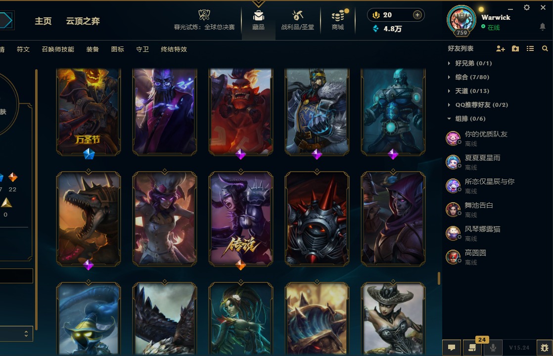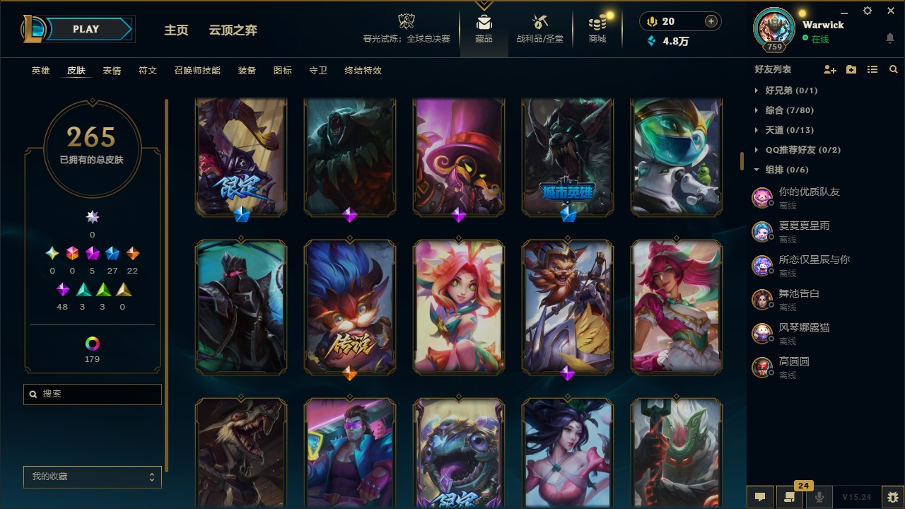 [14435045]5神话 27限定 22传说 48史诗 265皮肤 194炫彩 可二次 可修改实名 【海克斯】:海克斯 雷克顿 【限定】:双城之战2 范德尔 沃里克 【赛季限定皮】:胜利凤凰 艾尼维亚胜利之运 崔斯特胜利剑圣 易胜利女神 娑娜胜利巨口 克格莫胜利之王 泰达米尔胜利女神 瑟庄妮 【冠军限定系列】:s2 暗杀星 蒙多s2 暗杀星 努努 【冰雪节限定】:魄罗骑士 瑟庄妮圣诞开心鬼 提莫雪默丁格北极星使者 沃里克 【万圣节限定】:无头骑士 赫卡里姆 【年限】:点心宝贝 阿木木“你看见过我的熊猫吗?” 安妮王国机神白虎 贾克斯 【周年】:10周年 安妮10周年 凤凰 【其他限定/神话皮】:外星装甲 库奇十五周年纪念 希维尔暗裔英雄 盖伦源代码 乐芙兰防暴天使 凯尔暗影 沃里克都铎王朝 图奇防暴机器人 布里茨密林猎手 提莫御星魔矢 艾希制胜金靴 李青