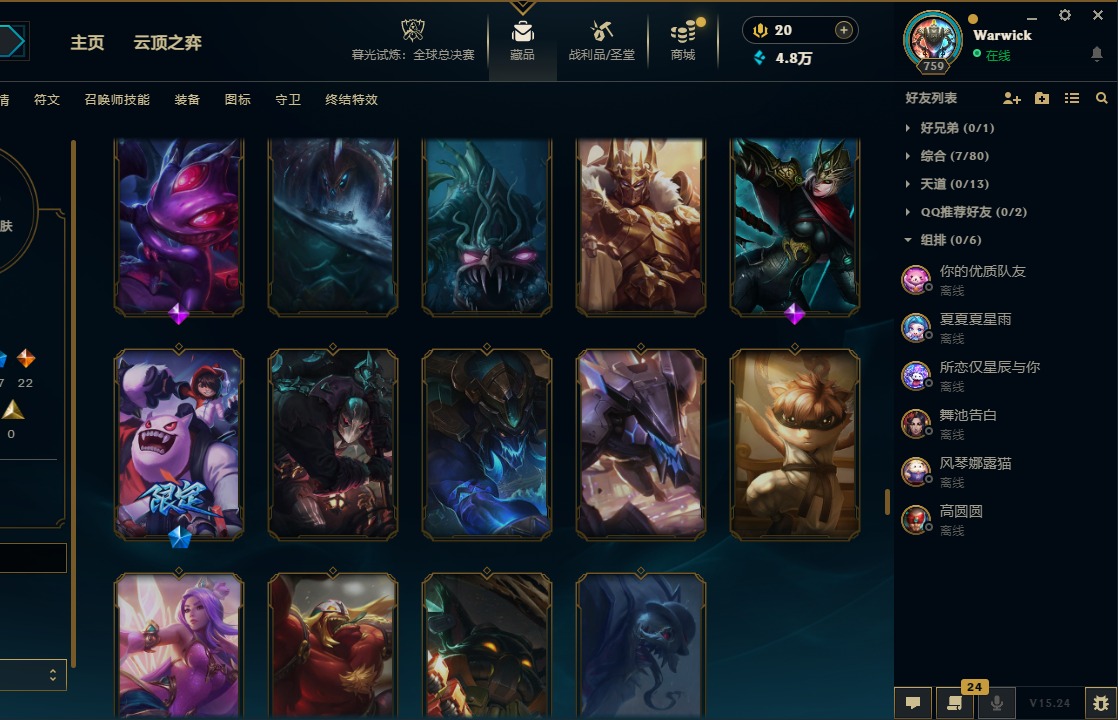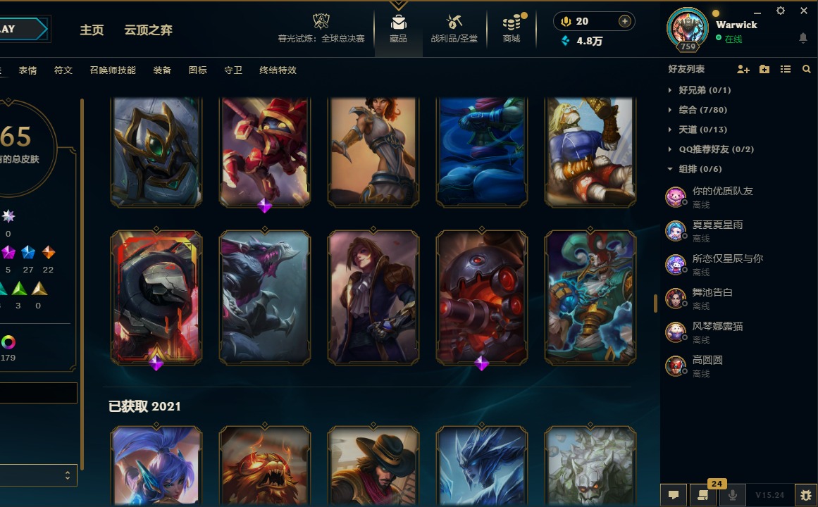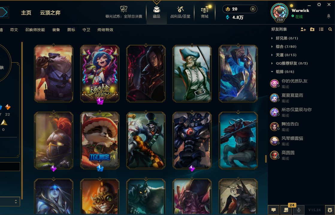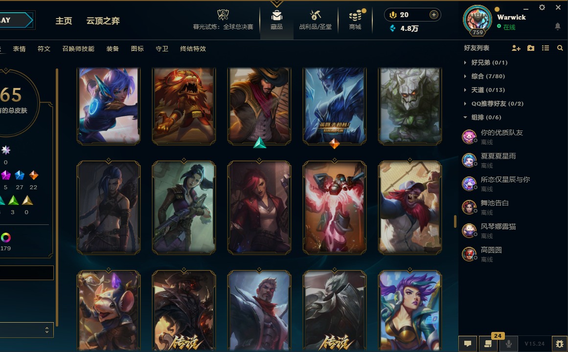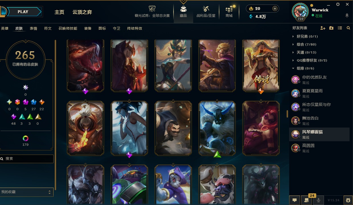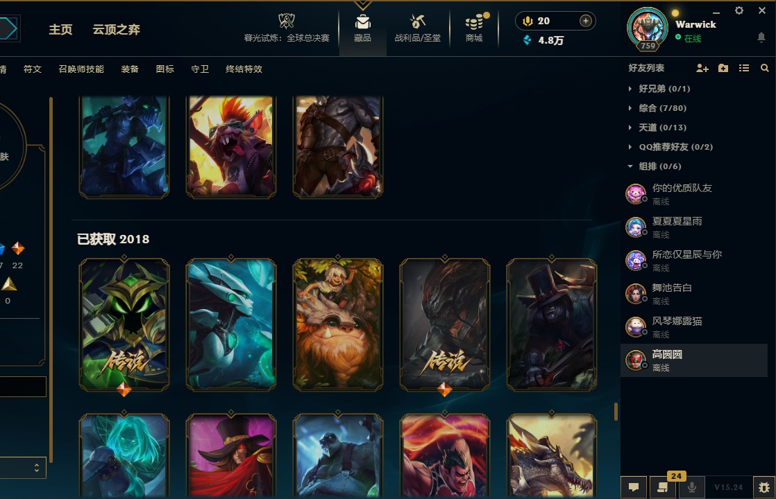 [14435045]5神话 27限定 22传说 48史诗 265皮肤 194炫彩 可二次 可修改实名 【海克斯】:海克斯 雷克顿 【限定】:双城之战2 范德尔 沃里克 【赛季限定皮】:胜利凤凰 艾尼维亚胜利之运 崔斯特胜利剑圣 易胜利女神 娑娜胜利巨口 克格莫胜利之王 泰达米尔胜利女神 瑟庄妮 【冠军限定系列】:s2 暗杀星 蒙多s2 暗杀星 努努 【冰雪节限定】:魄罗骑士 瑟庄妮圣诞开心鬼 提莫雪默丁格北极星使者 沃里克 【万圣节限定】:无头骑士 赫卡里姆 【年限】:点心宝贝 阿木木“你看见过我的熊猫吗?” 安妮王国机神白虎 贾克斯 【周年】:10周年 安妮10周年 凤凰 【其他限定/神话皮】:外星装甲 库奇十五周年纪念 希维尔暗裔英雄 盖伦源代码 乐芙兰防暴天使 凯尔暗影 沃里克都铎王朝 图奇防暴机器人 布里茨密林猎手 提莫御星魔矢 艾希制胜金靴 李青