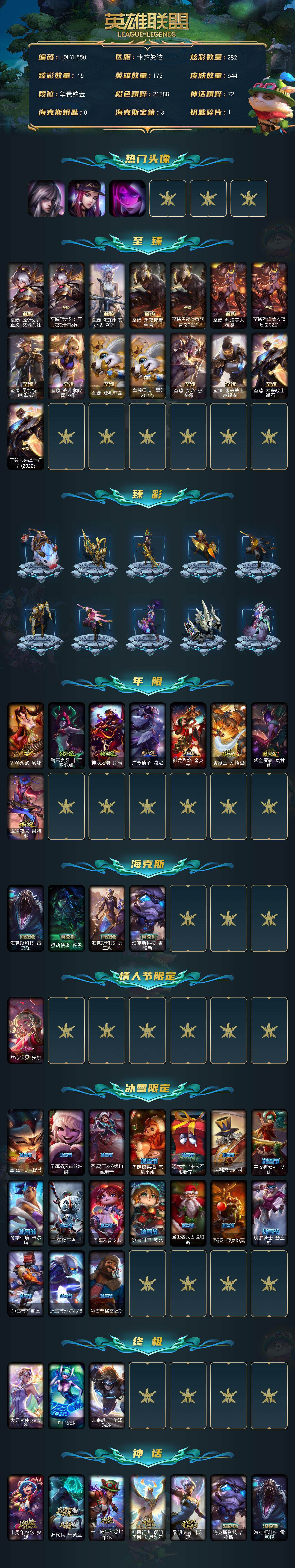 172英雄-644皮肤-【lolyh550】172英雄/644皮肤/3终极/24神话/89限定/15臻彩/282炫彩/65传说/179史诗/铂金账号等级:1304/玉剑传说无影头像/kda阿卡丽头像/源计划刀妹头像/至臻 源计划:正义 艾瑞莉娅/至臻 源计划:正义 艾瑞莉娅 2022/至臻 海珀利安小队x09-星环灵风迦娜/至臻黑夜使者李青/至臻黑夜使者李青 2022/至臻烈焰美人薇恩/至臻 烈焰美人薇恩
