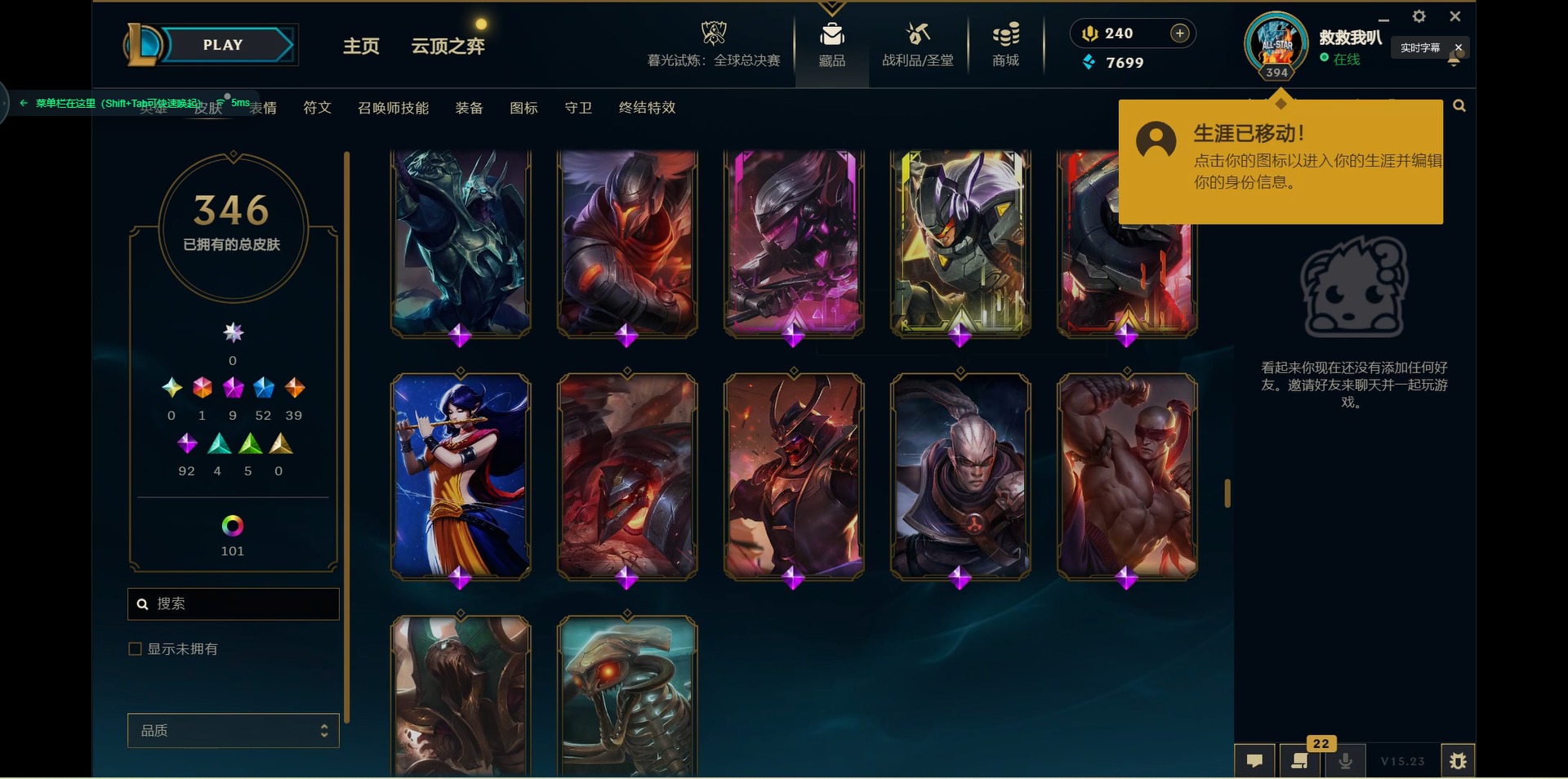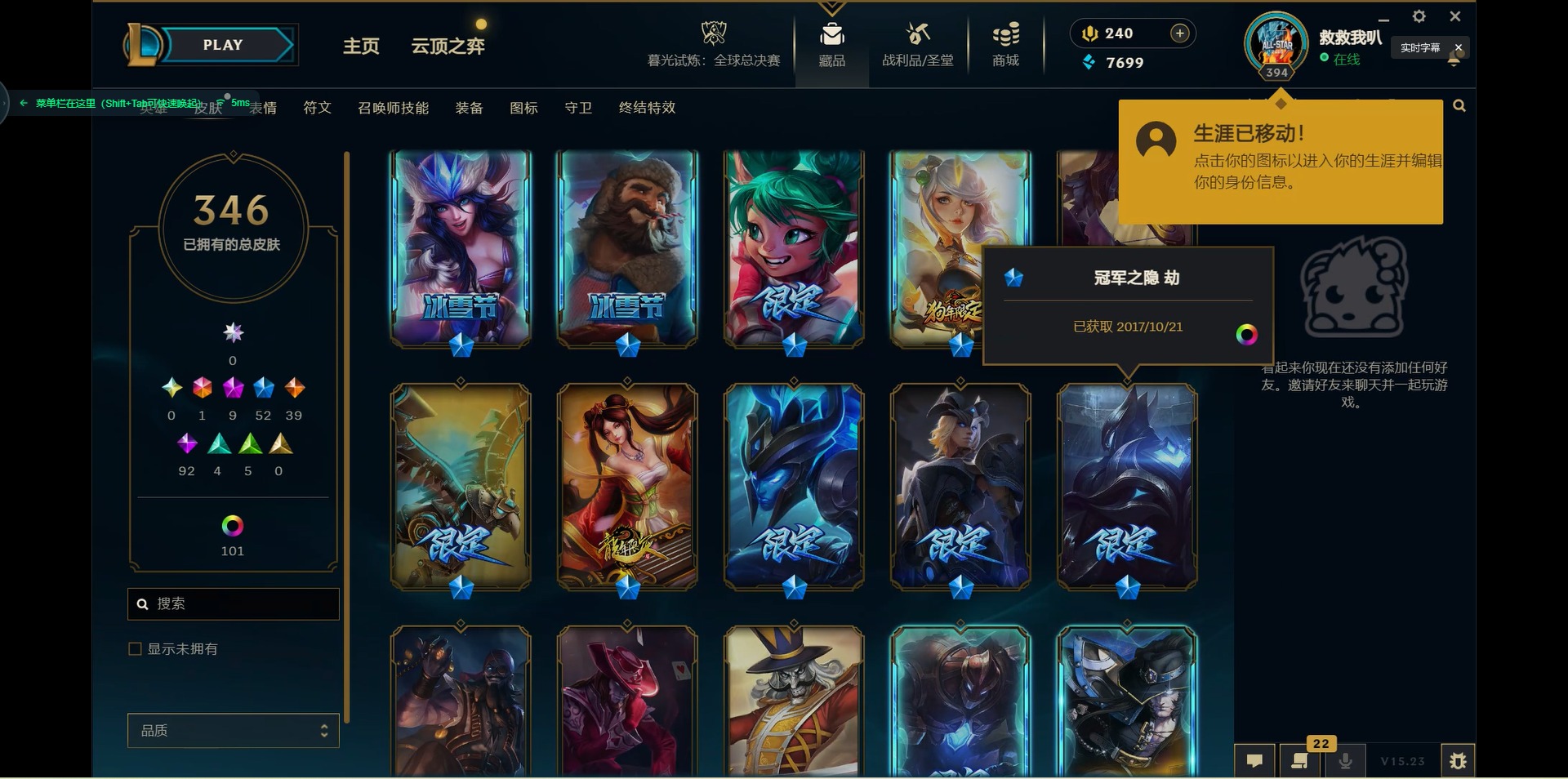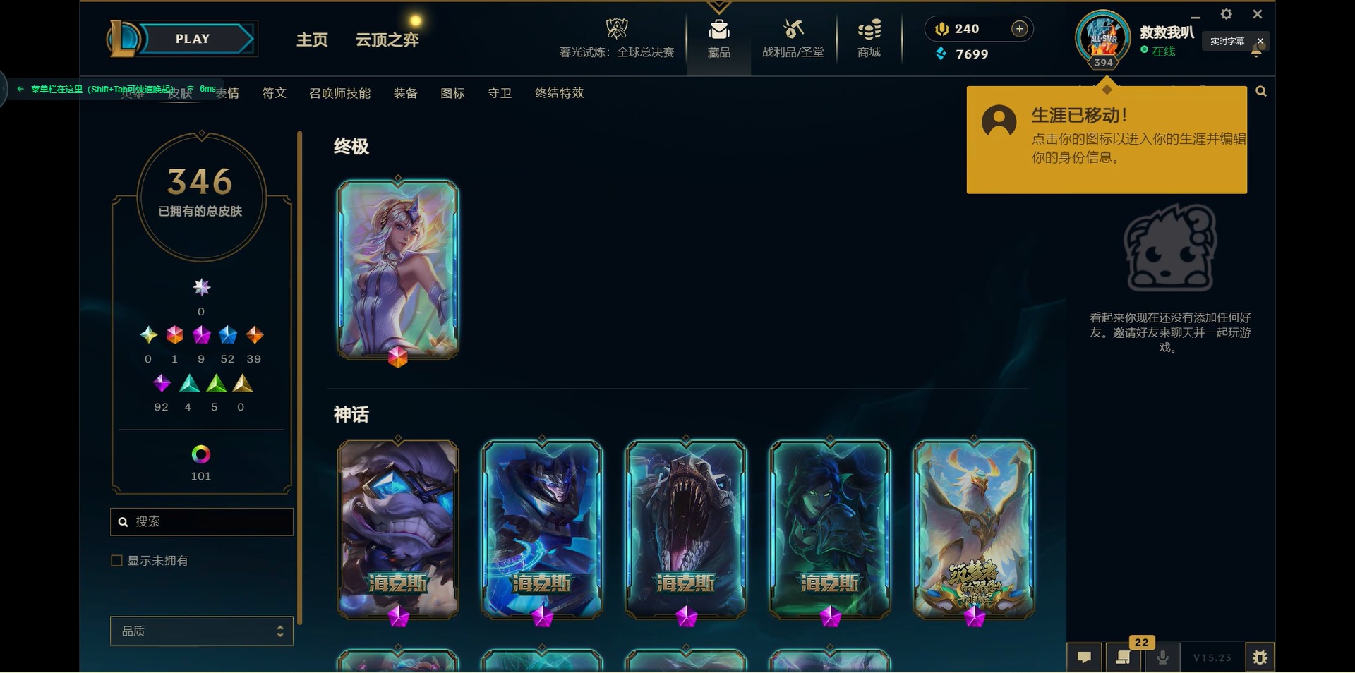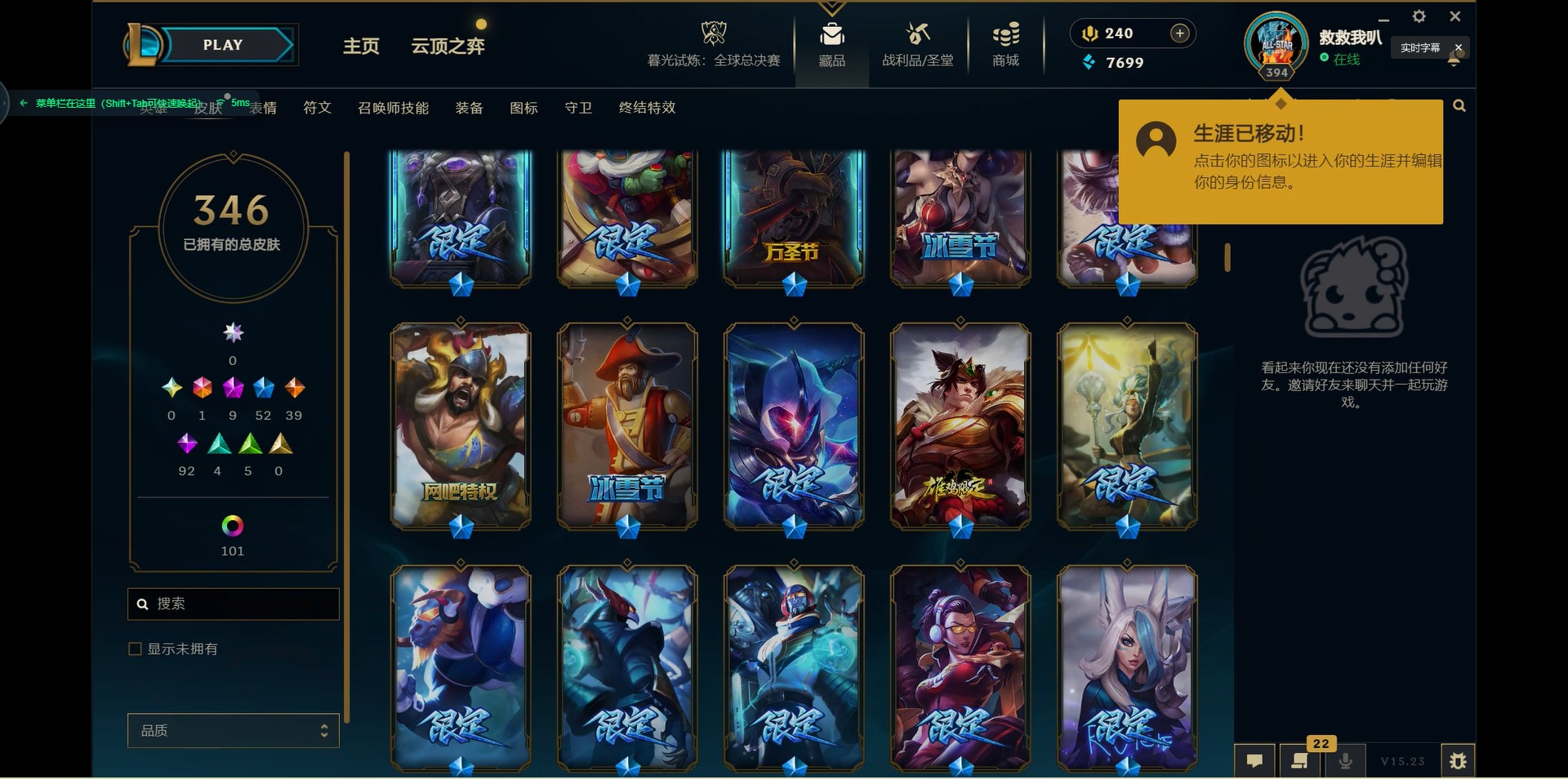 165英雄-346皮肤-[]1终极 9神话 52限定 39传说 92史诗 346皮肤 130炫彩 165英雄 可二次 可修改实名 【至臻】:至臻 灵能特工 伊泽瑞尔至臻 k/da all out卡莎 【海克斯】:海克斯 吉格斯海克斯 嘉文四世摄魂 薇恩海克斯 雷克顿 【限定】:斩星魔剑 易生化领