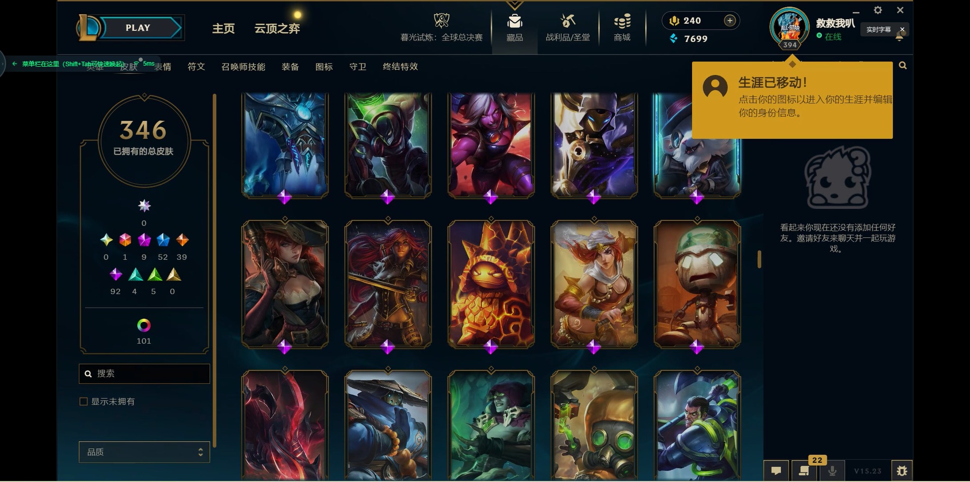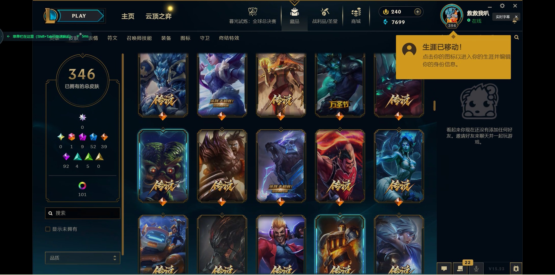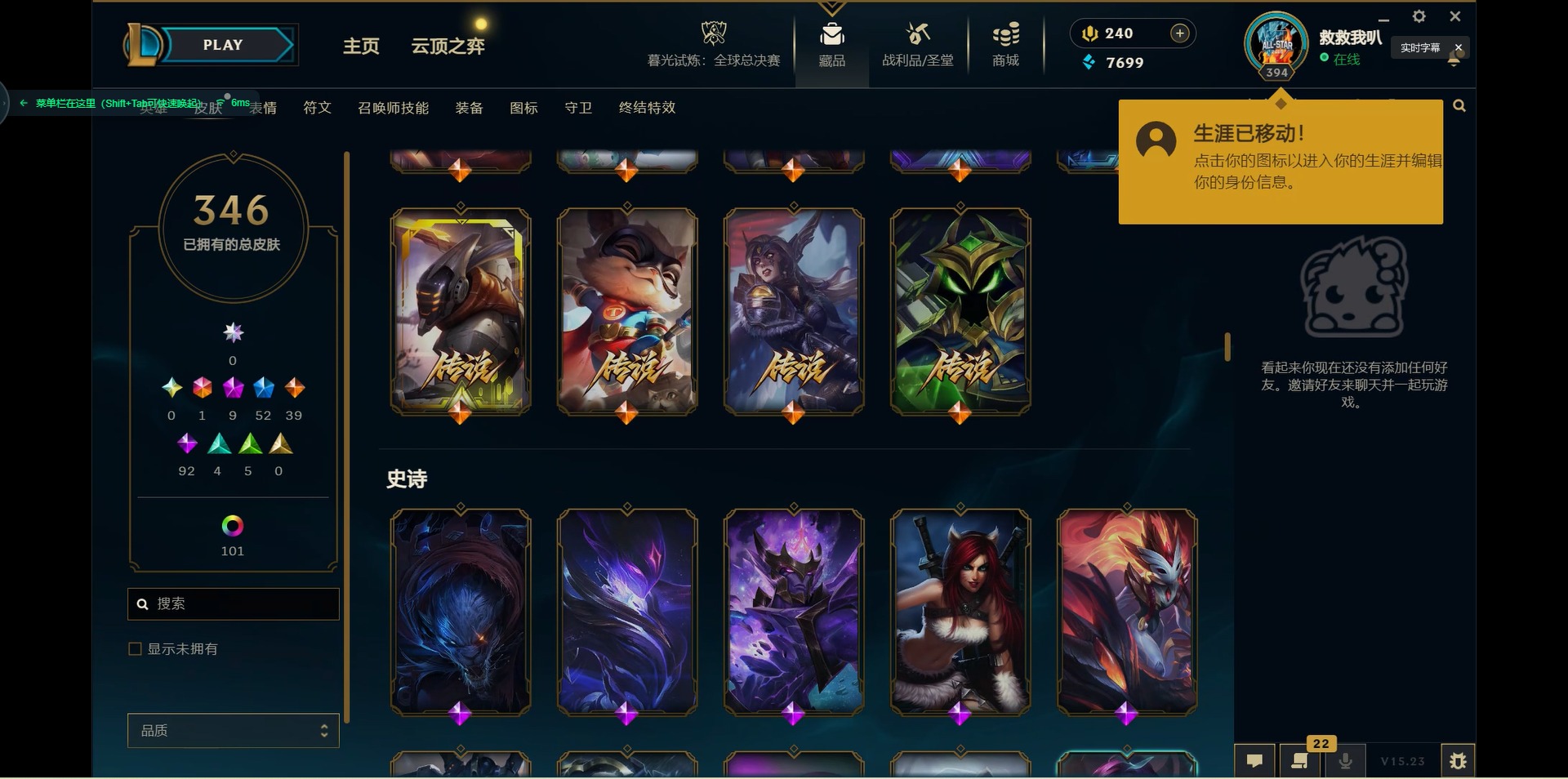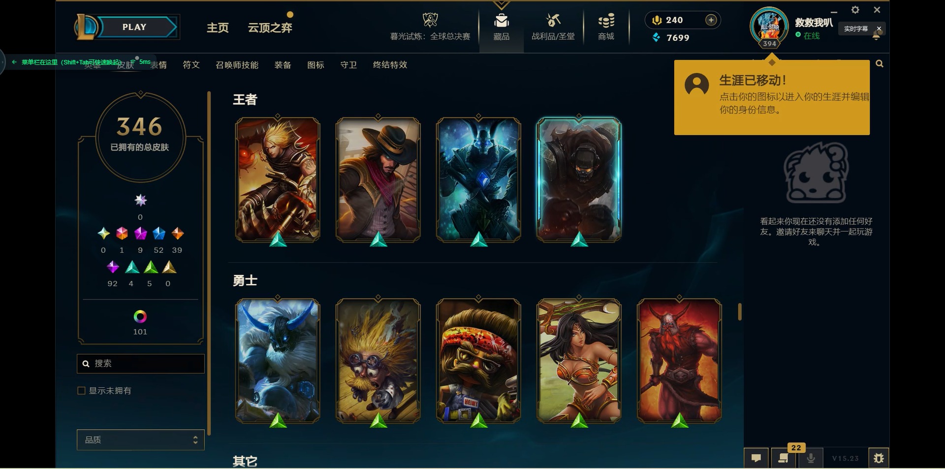 165英雄-346皮肤-[]1终极 9神话 52限定 39传说 92史诗 346皮肤 130炫彩 165英雄 可二次 可修改实名 【至臻】:至臻 灵能特工 伊泽瑞尔至臻 k/da all out卡莎 【海克斯】:海克斯 吉格斯海克斯 嘉文四世摄魂 薇恩海克斯 雷克顿 【限定】:斩星魔剑 易生化领
