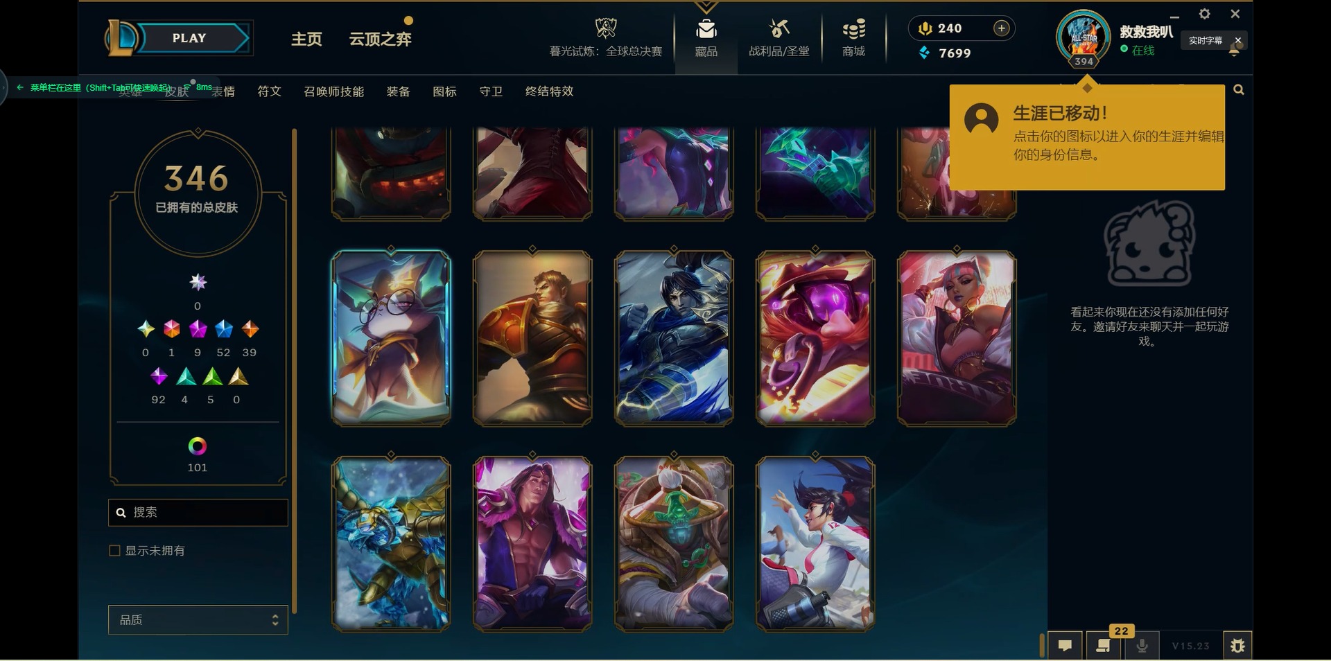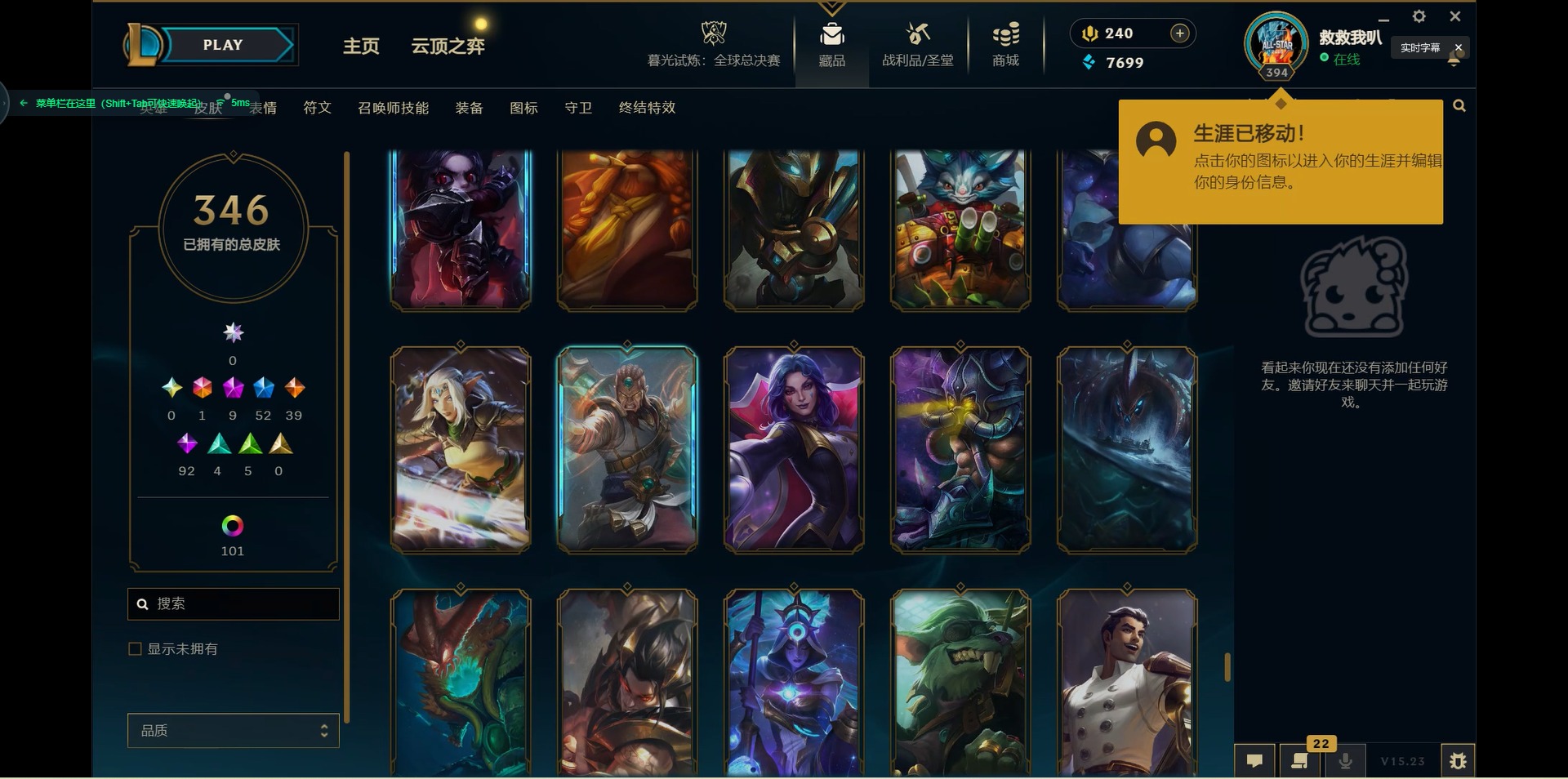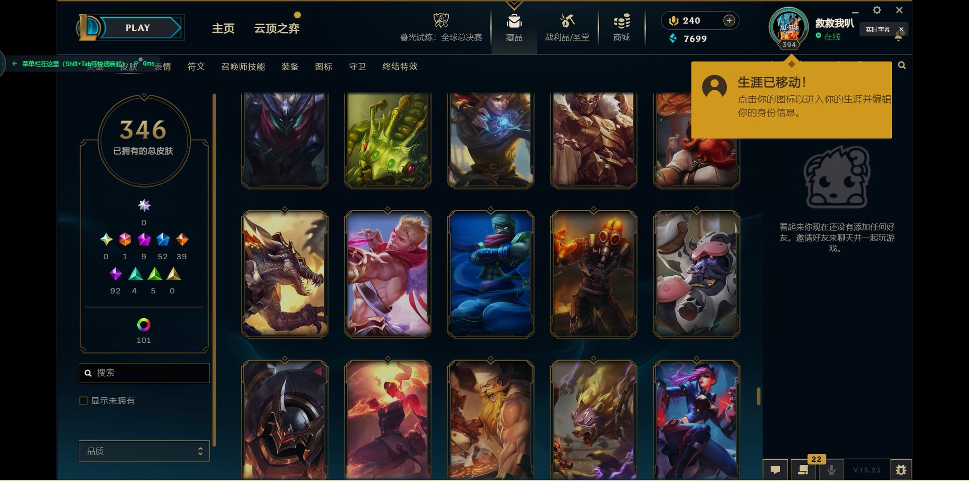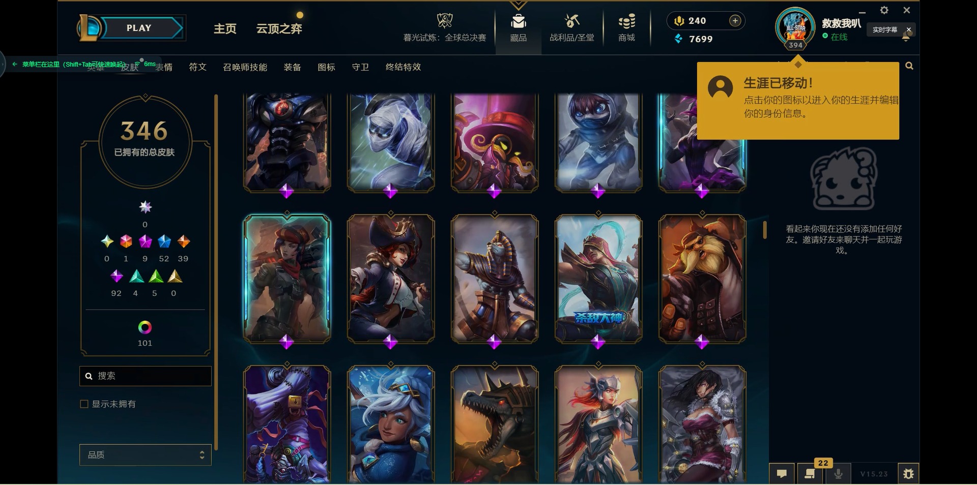 165英雄-346皮肤-[]1终极 9神话 52限定 39传说 92史诗 346皮肤 130炫彩 165英雄 可二次 可修改实名 【至臻】:至臻 灵能特工 伊泽瑞尔至臻 k/da all out卡莎 【海克斯】:海克斯 吉格斯海克斯 嘉文四世摄魂 薇恩海克斯 雷克顿 【限定】:斩星魔剑 易生化领