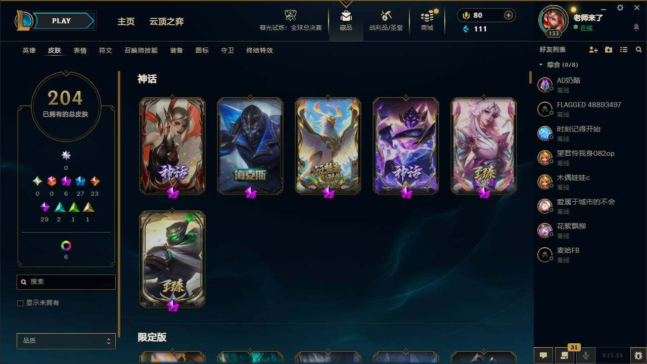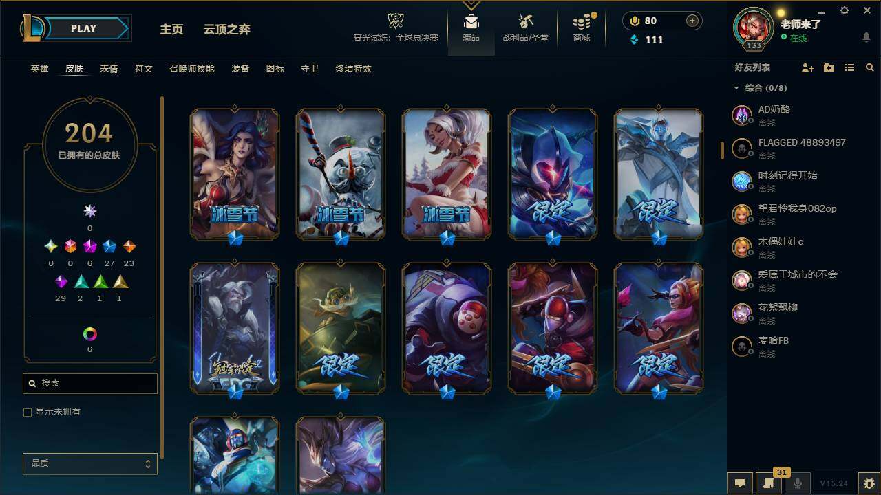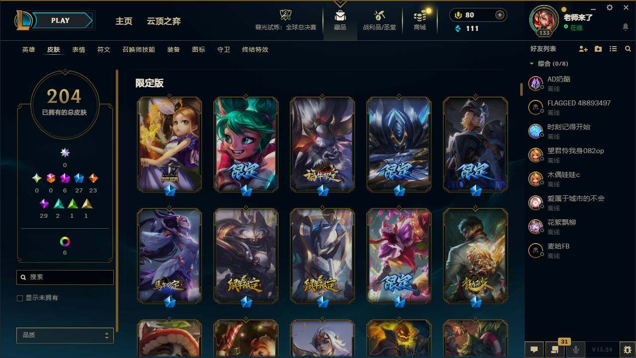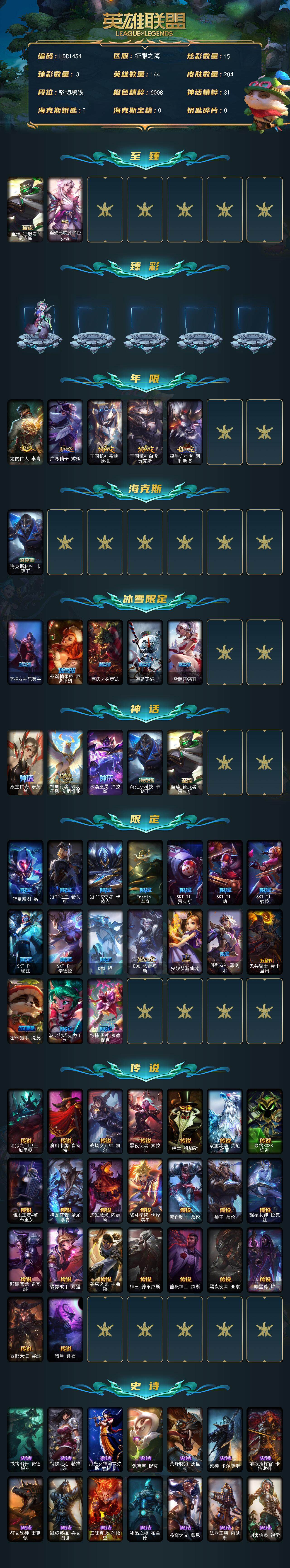 【ldc1454】144英雄/204皮肤/6神话/27限定/3臻彩/15炫彩/23传说/29史诗/黑铁账号等级:133/至臻征服者贾克斯/至臻灵魂莲华拉克丝/殿堂传奇 乐芙兰 登神/魔女 阿卡丽 虚荣/净雪之月莫甘娜冬虹/龙年盲僧/马年黛安娜/鼠年瑟提/鼠年贾克斯/福牛守护者阿利斯塔/海克斯卡萨丁/幸福女神乐芙兰/圣诞糖果棒女呛/冰雪节茂凯/雪默丁格/雪装豹女/殿堂传奇乐芙兰/10周年神凰行者