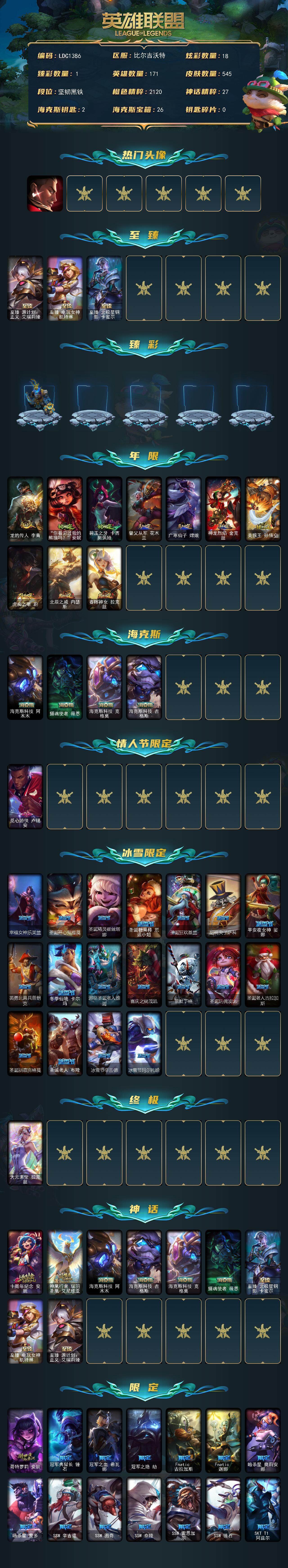 【ldc1386】171英雄/545皮肤/1终极/9神话/81限定/1臻彩/18炫彩/45传说/160史诗/未定级账号等级:189/觅心游侠卢锡安头像/至臻 源计划:正义 艾瑞莉娅/至臻 电玩女神 凯特琳/至臻 北极星钢影 卡蜜尔/冠军典狱长锤石凯旋圣装/龙年盲僧/蛇年安妮/碧玉之牙卡西奥佩娅/马年锐雯/马年黛安娜/羊年金克丝/猴年美猴王孙悟空/鸡年蔚/狗年内瑟斯/狗年春晖神女拉克丝/海克斯阿