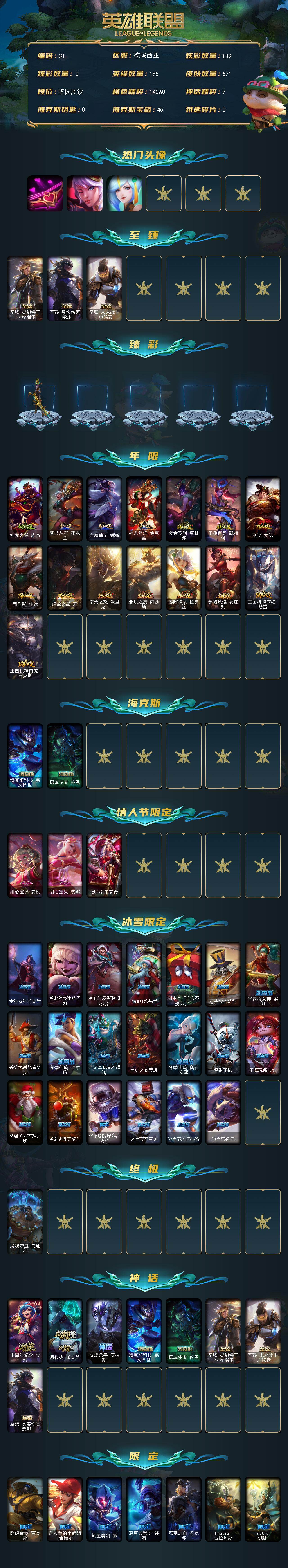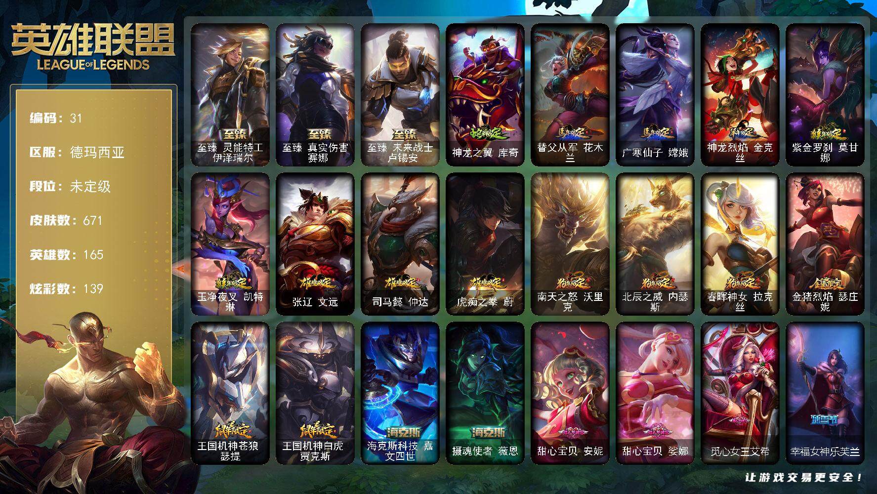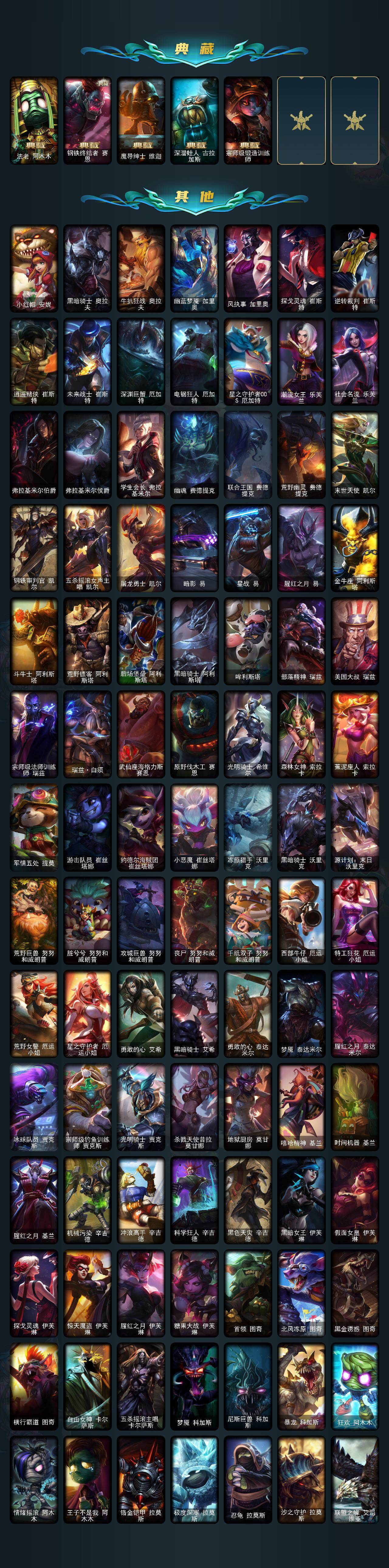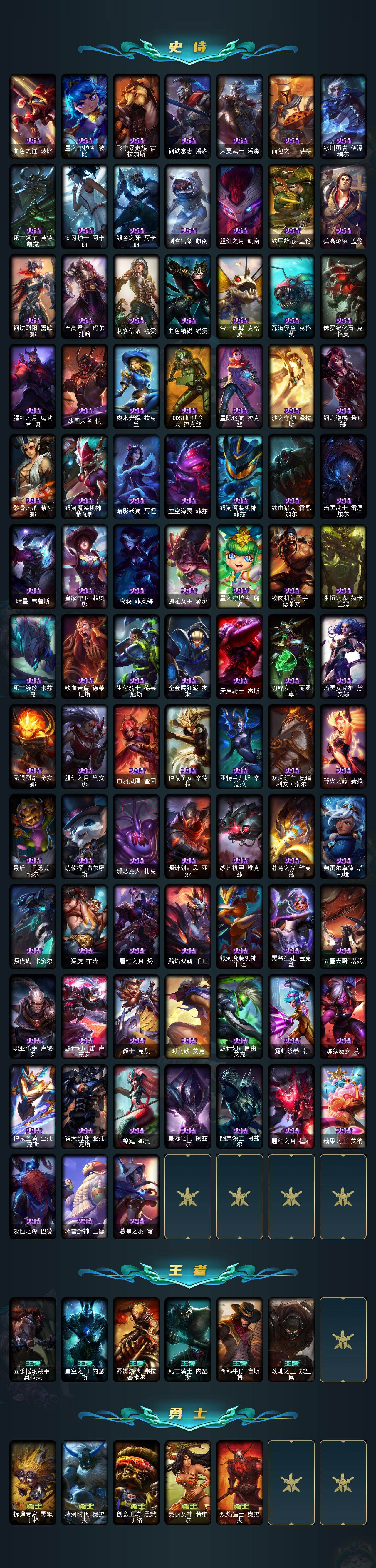 【3至臻671皮肤8神话】未定级段位-165英雄-671皮肤-139炫彩-1终极-8神话-113限定-51传说-171史诗 【热门头像】:爱情之歌头像,觅心之翼奎因头像,春晖神女头像 【至臻皮肤】:至臻灵能特工伊泽瑞尔,至臻真实伤害赛娜,至臻未来战士卢锡安 【臻彩皮肤】:春晖神女拉克丝流风回雪,玉净夜叉凯特琳炫金神机 【年限皮肤】:神龙之翼库奇,替父从军花木兰,广寒仙子嫦娥,神龙烈焰金克丝,紫金罗刹莫甘娜,玉净夜叉凯特琳,张辽文远,司马懿仲达,虎痴之拳蔚,南天之怒沃里克,北辰之威内瑟斯,春晖神女拉克丝,金猪烈焰瑟庄妮,王国机神苍狼瑟提,王国机神白虎贾克斯 【海克斯皮肤】:海克斯科技嘉文四世,摄魂使者薇恩 【情人节限定】:甜心宝贝安妮,甜心宝贝娑娜,觅心女王艾希 【冰雪限定】:幸福女神乐芙兰,圣诞精灵崔丝塔娜,圣诞狂欢努努和威朗普,圣诞狂欢基兰,阿木木“主人不要我了”,胡桃夹子萨科,平安夜女神娑娜,英勇玩具兵普朗克,冬季仙境卡尔玛,邪恶圣诞老人维迦,喜庆之树茂凯,冬季仙境奥莉安娜,雪默丁格,圣诞玩偶波比,圣诞老人古拉加斯,圣诞驯鹿克格莫,雪球也能爆炸吉格斯,冰雪节辛吉德,冰雪节玛尔扎哈,冰雪兽纳尔 【终极皮肤】:灵魂守卫乌迪尔 【神话皮肤】:十周年纪念安妮,源代码乐芙兰,灰烬杀手塞拉斯,海克斯科技嘉文四世,摄魂使者薇恩,至臻真实伤害赛娜,至臻灵能特工伊泽瑞尔,至臻未来战士卢锡安 【限定皮肤】:卧虎藏龙贾克斯,送披萨的小姐姐希维尔,斩星魔剑易,冠军典狱长锤石,冠军之血希瓦娜,fnatic古拉加斯,fnatic迦娜,fnatic嘉文四世,fnatic卡尔萨斯,fnatic库奇,暗杀星奥莉安娜,暗杀星蒙多,暗杀星努努和威朗普,暗杀星慎,暗杀星伊泽瑞尔,sktt1贾克斯,sktt1劫,sktt1婕拉,sktt1李青,ssw辛吉德,ssw图奇,ssw泰隆,sktt1阿利斯塔,sktt1阿兹尔,sktt1卡莉丝塔,sktt1雷克顿,sktt1瑞兹,sktt1伊莉丝,sktt1艾克,sktt1奥拉夫,sktt1烬,sktt1娜美,sktt1辛德拉,sktt1扎克,电玩女神厄运小姐,电玩勇者锐雯,电玩女神阿狸,星之守护者佐伊,胜利女神希维尔,胜利之树茂凯,胜利呛神格雷福斯,胜利女神奥莉安娜,胜利之剑亚托克斯,胜利呛神卢锡安,胜利机器人布里茨,胜利之王泰达米尔,海贼瑞兹,南瓜头费德提克,鬼影重重魔腾,鬼影森森茂凯,无头骑士赫卡里姆,克烈古拉伯爵,魅惑女巫莫甘娜,泳池派对雷克顿,泳池派对蕾欧娜,泳池派对普朗克,泳池派对塔里克,泳池派对佐伊,机械迷城加里奥,密林猎手提莫,外星装甲库奇,暗影沃里克,野兽猎人德莱文,野兽猎人瑟庄妮,野兽猎人泰达米尔,波比的巧克力工坊,勇者阿狸,勇者奈德丽,都铎王朝图奇,钢铁之翼艾尼维亚,防暴士兵格雷福斯,防暴士兵辛吉德,防暴天使凯尔,惊悚派对阿木木,警用试作体k9内瑟斯 【传说皮肤】:铁哥们儿奥拉夫,地狱之门卫士加里奥,魔幻卡牌崔斯特,战地机甲厄加特,邪鸦魅影乐芙兰,血石领主弗拉基米尔,大天使长米迦勒凯尔,战场女武神凯尔,提莫约德尔人的一大步,约德尔国队长提莫,欧米伽小队幽灵特工,驯龙炮手崔丝塔娜,合金巨兽努努和威朗普,女皇艾希,源计划联合艾希,恶魔之刃泰达米尔,鬼魂新娘莫甘娜,绅士科加斯,战地巨兽科加斯,双重冰晶艾尼维亚,黯晶凤凰艾尼维亚,律政大亨蒙多,冰霜之刃艾瑞莉娅,女主播迦娜,红色男爵库奇,最终boss维迦,女警狙击凯特琳,未来战士凯特琳,陆地王者4wd布里茨,上古战魂魔腾,地狱行者孙悟空,丧尸布兰德,神龙尊者圣龙李青,银河魔装机神兰博,第三类接触黑默丁格,战斗学院伊泽瑞尔,腥红之月鬼武姬阿卡丽,死亡骑士盖伦,神王盖伦,黎明使者锐雯,枯萎之壤泽拉斯,黯黑魔龙希瓦娜,冰霜亚龙希瓦娜,焰尾妖狐阿狸,符文战熊沃利贝尔,苍穹之光韦鲁斯,宇航员诺提勒斯,女校长菲奥娜,霸天异形卡兹克,黑夜使者亚索,暗星锤石 【史诗皮肤】:冰霜烈焰安妮,安伯斯与提妮,科学怪熊的新娘安妮,皇家火呛手崔斯特,腥红之月崔斯特,特战先锋赵信,绞肉机角斗士赵信,翼骑统领赵信,铁钩船长费德提克,重生之沙费德提克,圣光审判凯尔,天人合一易,侍魂易,铁血剑豪易,地狱火阿利斯塔,战争机器赛恩,战场公主希维尔,钢铁之心希维尔,月光女神阿忒弥斯索拉卡,圣洁化身索拉卡,熊猫提莫,火箭达人崔丝塔娜,狼外婆沃里克,火牙狼人沃里克,荒野豺狼沃里克,法国皇室厄运小姐,紫晶射手艾希,国王泰达米尔,百夫长贾克斯,少林武僧贾克斯,刀锋女王莫甘娜,炼金狂士辛吉德,死神卡尔萨斯,卡尔萨斯祸害之光,侏罗纪化石科加斯,小小骑士阿木木,殇之机器人阿木木,熔火之心拉莫斯,贵族血统萨科,飞越疯人院萨科,武动巅峰萨科,战争血统蒙多,五杀摇滚键盘手娑娜,掠星魔刃卡萨丁,夜行义贼艾瑞莉娅,海克斯科技迦娜,寒冰女皇迦娜,特种部队普朗克,恐惧新星普朗克,穿着正装的恶魔维迦,北领前线斯维因,绝代智将斯维因,驯龙大师斯维因,抵抗军天使凯特琳,古墓丽影凯特琳,铁血狙击手凯特琳,黑曜石守护者墨菲特,无畏号墨菲特,海贼魅影卡特琳娜,暗夜猫女卡特琳娜,前线指挥官卡特琳娜,沙漠风暴卡特琳娜,蓝焰梦魔魔腾,符文战神雷克顿,枯萎之壤雷克顿,龙骑统帅嘉文四世,死亡绽放伊莉丝,腥红之月伊莉丝,灵骨工匠奥莉安娜,三昧真火孙悟空,v字仇杀者布兰德,冰晶之核布兰德,灵魂烈焰布兰德,防弹武僧李青,地下拳王李青,屠龙勇士薇恩,苍穹之光薇恩,深海妖姬卡西奥佩娅,战地机甲斯卡纳,生化博士黑默丁格,法老王朝内瑟