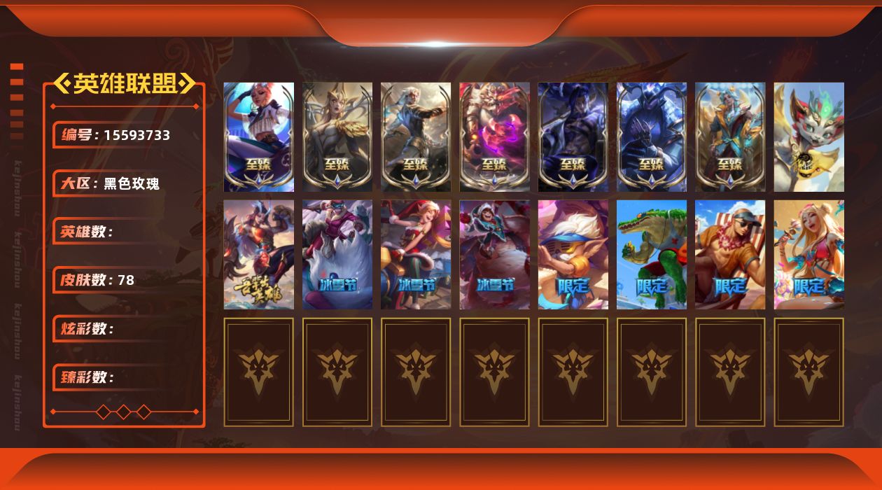 [15593733]可二次实名 黑色玫瑰-108英雄-78原皮-1炫彩-2臻彩-7神话级-7至臻/至臻黑夜使者凯影/至臻魔女乐芙兰/至臻墨之影舞者亚索/至臻神龙尊者均衡之龙沃利贝尔/至臻天龙之子伊泽瑞尔/至臻真实伤害奇亚娜/至臻drx亚托克斯/天龙之子斯莫德/海之歌萨勒芬妮/玉剑传说神机花火/玉剑传说舞龙卫/详情看图/号满满/低价出售找回包赔
