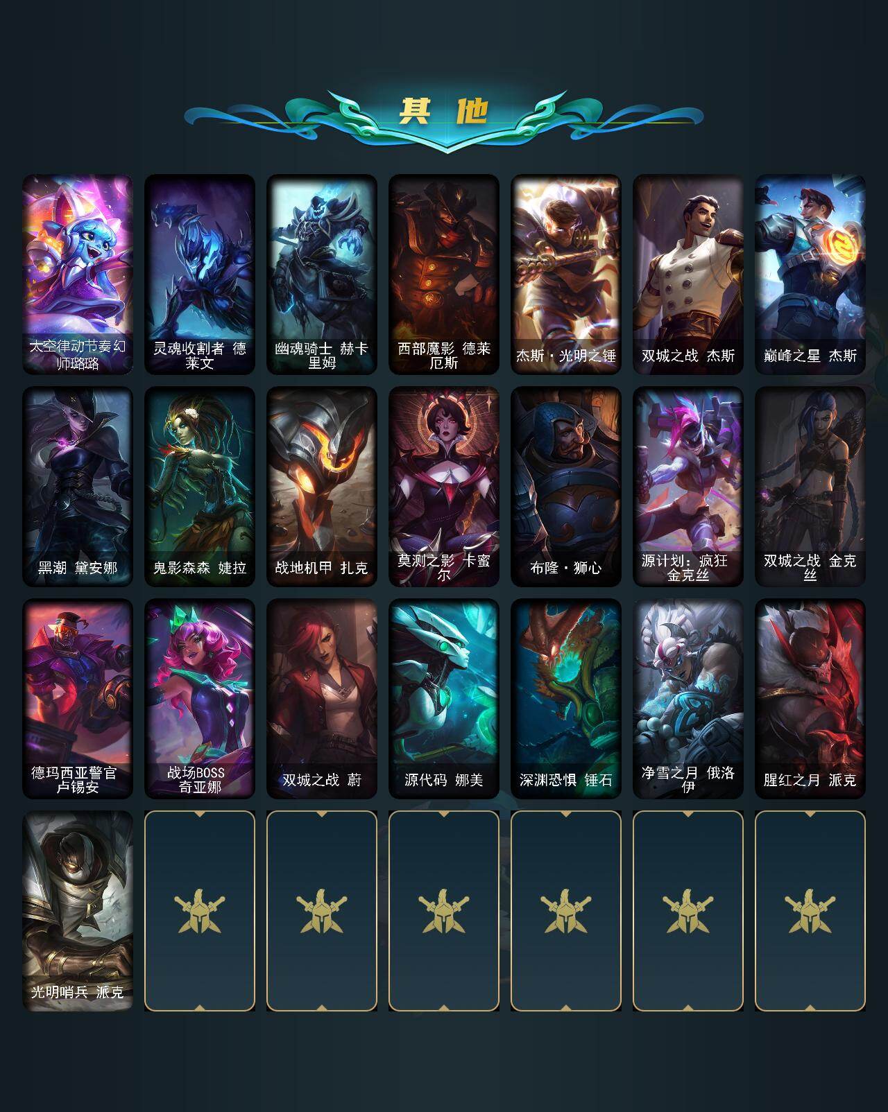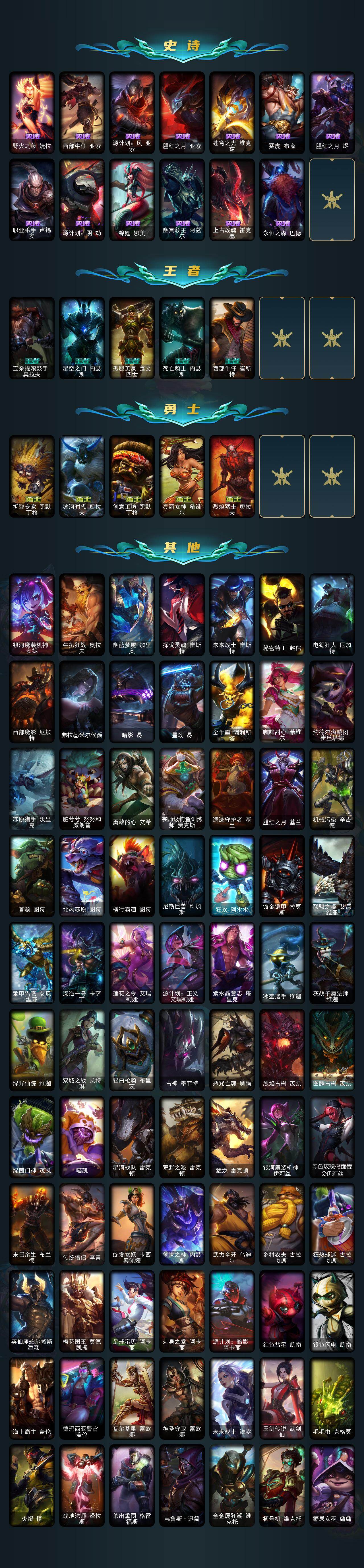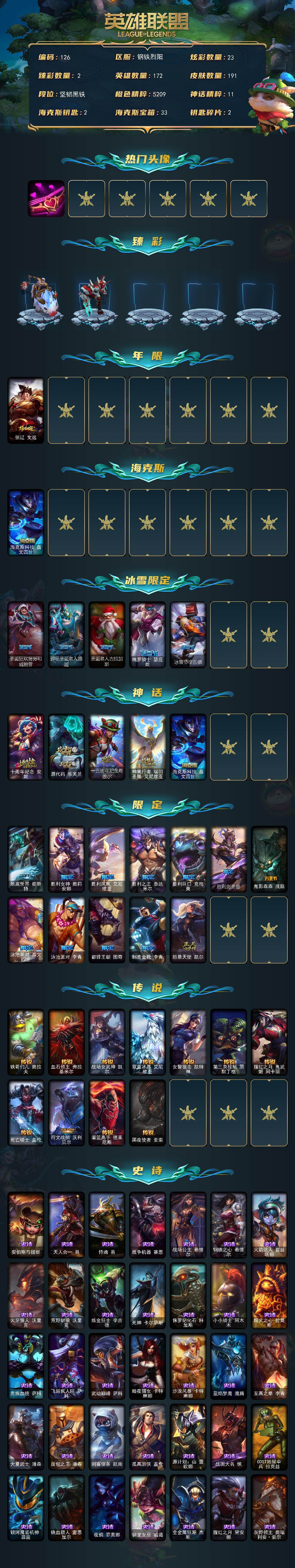 【126】未定级段位-172英雄-191皮肤-23炫彩-0终极-5神话-18限定-11传说-48史诗 【热门头像】:爱情之歌头像 【臻彩皮肤】:无畏骑士瑟庄妮赤子初心,霸天战士雷恩加尔星啸天火 【年限皮肤】:张辽文远 【海克斯皮肤】:海克斯科技嘉文四世 【冰雪限定】:圣诞狂欢努努和威朗普,邪恶圣诞老人维迦,圣诞老人古拉加斯,魄罗骑士瑟庄妮,冰雪节辛吉德 【神话皮肤】:十周年纪念安妮,源代码乐芙兰,十五周年纪念希维尔,神凰行者瑞羽圣凰艾尼维亚,海克斯科技嘉文四世 【限定皮肤】:地底世界崔斯特,胜利女神奥莉安娜,胜利凤凰艾尼维亚,胜利之王泰达米尔,胜利巨口克格莫,胜利剑圣易,鬼影森森茂凯,泳池派对嘉文四世,泳池派对李青,都铎王朝图奇,制胜金靴李青,防暴天使凯尔 【传说皮肤】:铁哥们儿奥拉夫,血石领主弗拉基米尔,战场女武神凯尔,双重冰晶艾尼维亚,女警狙击凯特琳,第三类接触黑默丁格,腥红之月鬼武姬阿卡丽,死亡骑士盖伦,符文战熊沃利贝尔,灌篮高手德莱厄斯,黑夜使者亚索 【史诗皮肤】:安伯斯与提妮,天人合一易,侍魂易,战争机器赛恩,战场公主希维尔,钢铁之心希维尔,火箭达人崔丝塔娜,火牙狼人沃里克,荒野豺狼沃里克,炼金狂士辛吉德,死神卡尔萨斯,侏罗纪化石科加斯,小小骑士阿木木,熔火之心拉莫斯,贵族血统萨科,飞越疯人院萨科,武动巅峰萨科,暗夜猫女卡特琳娜,沙漠风暴卡特琳娜,蓝焰梦魔魔腾,至高之拳李青,大夏武士潘森,面包之王潘森,刺客信条凯南,孤高游侠盖伦,源计划山蕾欧娜,战国大名慎,odst地狱伞兵拉克丝,银河魔装机神菲兹,铁血猎人雷恩加尔,夜鸦菲奥娜,驯龙女巫璐璐,全金属狂潮杰斯,腥红之月黛安娜,灰烬领主奥瑞利安索尔,野火之藤婕拉,西部牛仔亚索,源计划风亚索,腥红之月亚索,苍穹之光维克兹,猛虎布隆,腥红之月烬,职业杀手卢锡安,源计划阴劫,锦鲤娜美,幽冥领主阿兹尔,上古战魂雷克塞,永恒之森巴德 【王者皮肤】:五杀摇滚鼓手奥拉夫,星空之门内瑟斯,孤胆英豪嘉文四世,死亡骑士内瑟斯,西部牛仔崔斯特 【勇士皮肤】:拆弹专家黑默丁格,冰河时代奥拉夫,创意工坊黑默丁格,亮丽女神希维尔,烈焰猛士奥拉夫 【其他皮肤1】:银河魔装机神安妮,牛扒狂战奥拉夫,幽蓝梦魇加里奥,探戈灵魂崔斯特,未来战士崔斯特,秘密特工赵信,电锯狂人厄加特,西部魔影厄加特,弗拉基米尔侯爵,暗影易,星战易,金牛座阿利斯塔,咖啡甜心希维尔,约德尔海贼团崔丝塔娜,冻原猎手沃里克,脏兮兮努努和威朗普,勇敢的心艾希,宗师级钓鱼训练师贾克斯,遗迹守护者基兰,腥红之月基兰,机械污染辛吉德,首领图奇,北风冻原图奇,横行霸道图奇,尼斯巨兽科加斯,狂欢阿木木,铬金铠甲拉莫斯,联盟之喙艾尼维亚,重甲猎鹰艾尼维亚,深海一号卡萨丁,莲花之令艾瑞莉娅,源计划正义艾瑞莉娅,紫水晶意志塔里克,冰壶选手维迦,灰胡子魔法师维迦,绿野仙踪维迦,双城之战凯特琳,银白呛骑布里茨,古神墨菲特,恶咒亡魂魔腾,烈焰古树茂凯,图腾古树茂凯,绿茵门神茂凯,喵凯,星河战队雷克顿,荒野之咬雷克顿,猛龙雷克顿,银河魔装机神伊莉丝,黑色玫瑰假面舞会伊莉丝,末日余生布兰德,传统僧侣李青,蛇发女妖卡西奥佩娅,创世之神内瑟斯,武力全开乌迪尔,乡村农夫古拉加斯,狂热球迷古拉加斯,英仙座珀尔修斯潘森,梅花国王莫德凯撒,足球宝贝阿卡丽,刺身之拳阿卡丽,源计划暗影阿卡丽,红色彗星凯南,银色闪电凯南,海上霸主盖伦,德玛西亚警官盖伦,瓦尔基里蕾欧娜,神圣守卫蕾欧娜,未来战士锐雯,玉剑传说武剑仙,毛毛虫克格莫,炎爆慎,战地法师泽拉斯,杀出重围格雷福斯,韦鲁斯迅箭,全金属狂潮维克托,初号机维克托,糖果女巫璐璐,太空律动节奏幻师璐璐,灵魂收割者德莱文,幽魂骑士赫卡里姆,西部魔影德莱厄斯,杰斯光明之锤,双城之战杰斯,巅峰之星杰斯,黑潮黛安娜,鬼影森森婕拉,战地机甲扎克,莫测之影卡蜜尔,布隆狮心,源计划疯狂金克丝,双城之战金克丝,德玛西亚警官卢锡安,战场boss奇亚娜,双城之战蔚,源代码娜美,深渊恐惧锤石,净雪之月俄洛伊,腥红之月派克,光明哨兵派克