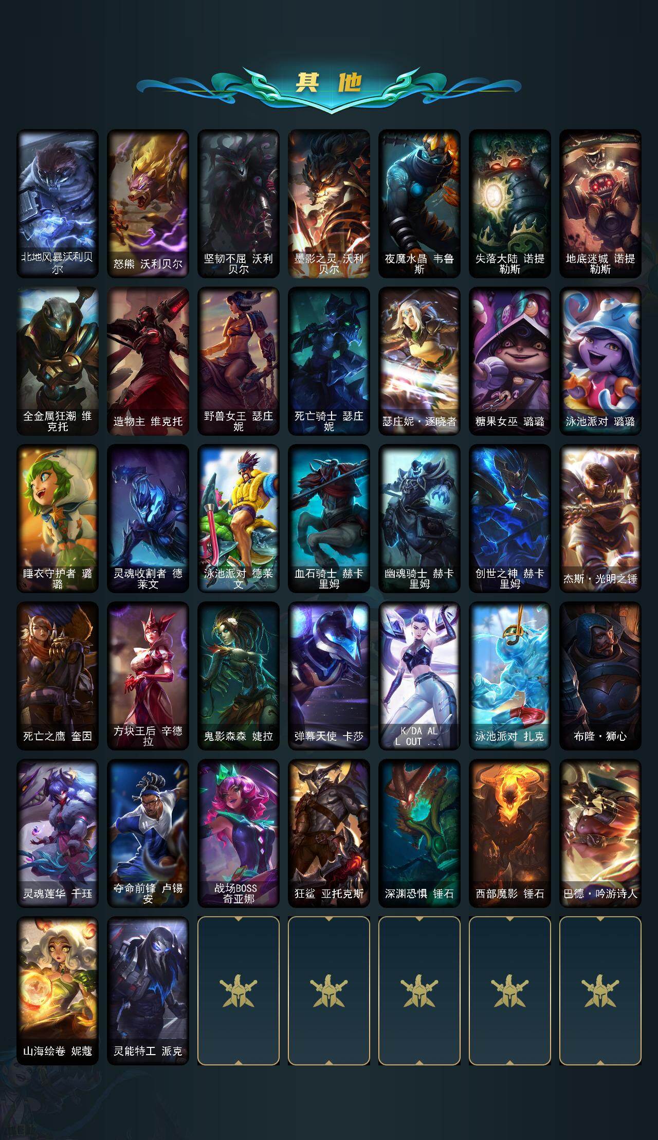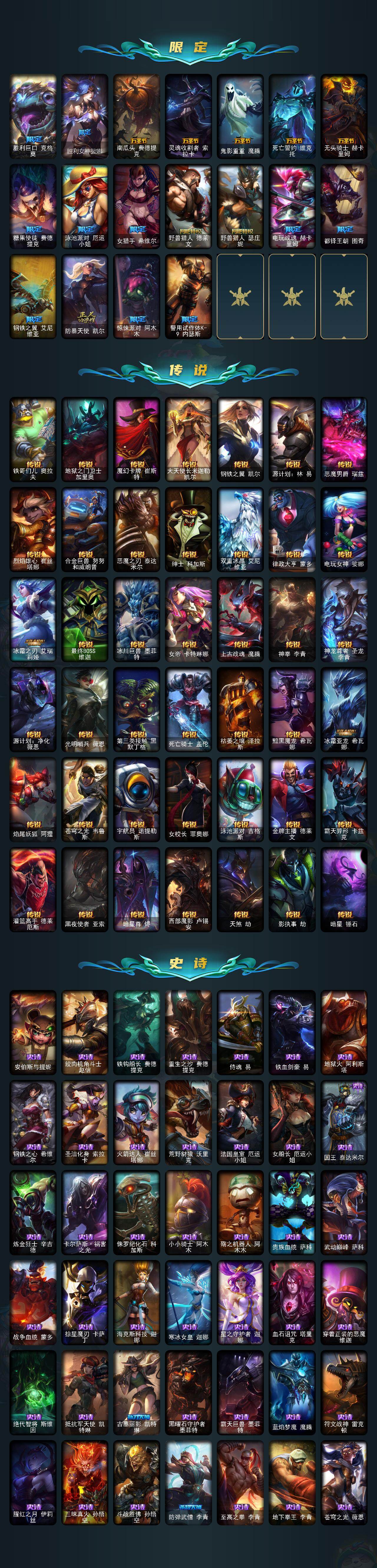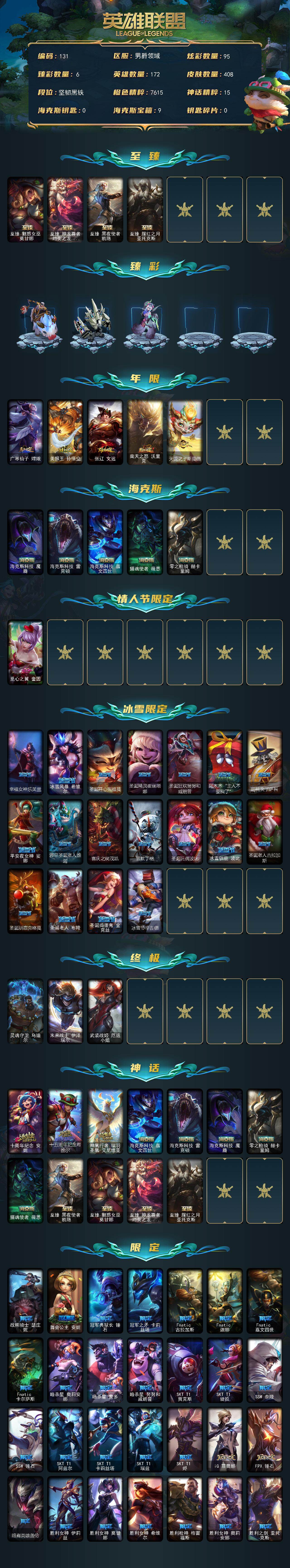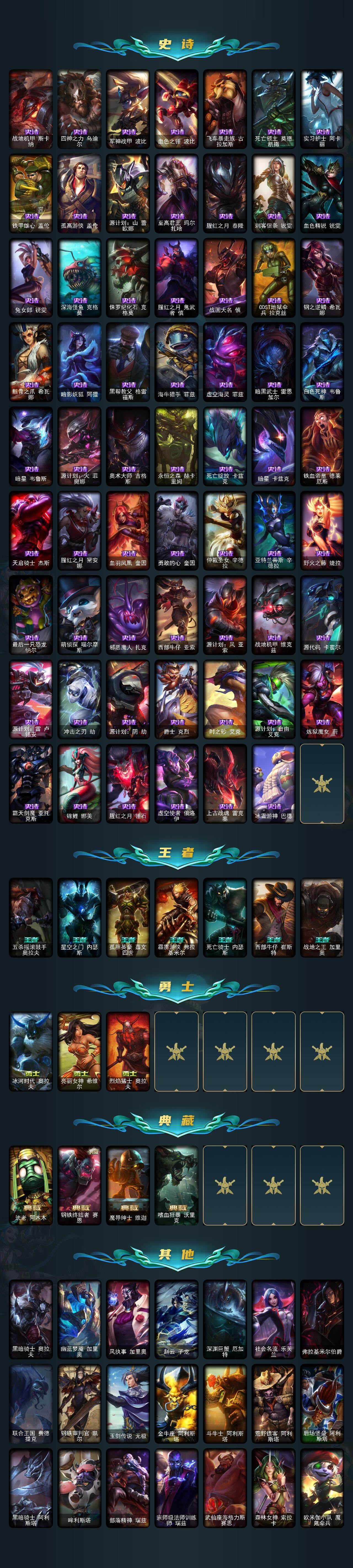 【131】未定级段位-172英雄-408皮肤-95炫彩-3终极-12神话-70限定-42传说-104史诗 【至臻皮肤】:至臻魅惑女巫莫甘娜,至臻神龙尊者均衡之龙沃利贝尔,至臻黑夜使者凯隐,至臻腥红之月亚托克斯 【臻彩皮肤】:天龙之子卡莎飞龙乘云,无畏骑士瑟庄妮赤子初心,墨之影武者亚索金墨耀影,霸天巨兽雪崩墨菲特,魔女阿卡丽虚荣,净雪之月莫甘娜冬虹 【年限皮肤】:广寒仙子嫦娥,美猴王孙悟空,张辽文远,南天之怒沃里克,天龙之子斯莫德 【海克斯皮肤】:海克斯科技魔腾,海克斯科技雷克顿,海克斯科技嘉文四世,摄魂使者薇恩,零之呛骑赫卡里姆 【情人节限定】:觅心之翼奎因 【冰雪限定】:幸福女神乐芙兰,冰雪风暴希维尔,圣诞开心鬼提莫,圣诞精灵崔丝塔娜,圣诞狂欢努努和威朗普,阿木木“主人不要我了”,胡桃夹子萨科,平安夜女神娑娜,邪恶圣诞老人维迦,喜庆之树茂凯,雪默丁格,圣诞玩偶波比,冰雪驯鹿波比,圣诞老人古拉加斯,圣诞驯鹿克格莫,圣诞老人布隆,圣诞捣蛋鬼金克丝,冰雪节辛吉德 【终极皮肤】:灵魂守卫乌迪尔,未来战士伊泽瑞尔,武装战姬厄运小姐 【神话皮肤】:十周年纪念安妮,十五周年纪念希维尔,神凰行者瑞羽圣凰艾尼维亚,海克斯科技嘉文四世,海克斯科技雷克顿,海克斯科技魔腾,零之呛骑赫卡里姆,摄魂使者薇恩,至臻黑夜使者凯隐,至臻魅惑女巫莫甘娜,至臻神龙尊者均衡之龙沃利贝尔,至臻腥红之月亚托克斯 【限定皮肤】:战熊骑士瑟庄妮,舞会公主安妮,冠军典狱长锤石,冠军之矛卡莉丝塔,fnatic古拉加斯,fnatic迦娜,fnatic嘉文四世,fnatic卡尔萨斯,暗杀星奥莉安娜,暗杀星蒙多,暗杀星努努和威朗普,sktt1贾克斯,sktt1婕拉,ssw泰隆,ssw锤石,sktt1阿兹尔,sktt1卡莉丝塔,sktt1瑞兹,sktt1烬,ig菲奥娜,f锤石,暗裔英雄盖伦,胜利女神伊莉丝,胜利女神莫甘娜,胜利女神希维尔,胜利呛神格雷福斯,胜利女神奥莉安娜,胜利之剑亚托克斯,胜利巨口克格莫,胜利女神娑娜,南瓜头费德提克,灵魂收割者索拉卡,鬼影重重魔腾,死亡誓约维克托,无头骑士赫卡里姆,糖果使徒费德提克,泳池派对厄运小姐,女猎手希维尔,野兽猎人德莱文,野兽猎人瑟庄妮,电玩战魂赫卡里姆,都铎王朝图奇,钢铁之翼艾尼维亚,防暴天使凯尔,惊悚派对阿木木,警用试作体k9内瑟斯 【传说皮肤】:铁哥们儿奥拉夫,地狱之门卫士加里奥,魔幻卡牌崔斯特,大天使长米迦勒凯尔,钢铁之翼凯尔,源计划林易,恶魔男爵瑞兹,烈焰雄心崔丝塔娜,合金巨兽努努和威朗普,恶魔之刃泰达米尔,绅士科加斯,双重冰晶艾尼维亚,律政大亨蒙多,电玩女神娑娜,冰霜之刃艾瑞莉娅,最终boss维迦,冰川巨兽墨菲特,女帝卡特琳娜,上古战魂魔腾,神拳李青,神龙尊者圣龙李青,源计划净化薇恩,光明哨兵薇恩,第三类接触黑默丁格,死亡骑士盖伦,枯萎之壤泽拉斯,黯黑魔龙希瓦娜,冰霜亚龙希瓦娜,焰尾妖狐阿狸,苍穹之光韦鲁斯,宇航员诺提勒斯,女校长菲奥娜,泳池派对吉格斯,金牌主播德莱文,霸天异形卡兹克,灌篮高手德莱厄斯,黑夜使者亚索,暗星尊烬,西部魔影卢锡安,天煞劫,影执事劫,暗星锤石 【史诗皮肤】:安伯斯与提妮,绞肉机角斗士赵信,铁钩船长费德提克,重生之沙费德提克,侍魂易,铁血剑豪易,地狱火阿利斯塔,钢铁之心希维尔,圣洁化身索拉卡,火箭达人崔丝塔娜,荒野豺狼沃里克,法国皇室厄运小姐,女船长厄运小姐,国王泰达米尔,炼金狂士辛吉德,卡尔萨斯祸害之光,侏罗纪化石科加斯,小小骑士阿木木,殇之机器人阿木木,贵族血统萨科,武动巅峰萨科,战争血统蒙多,掠星魔刃卡萨丁,海克斯科技迦娜,寒冰女皇迦娜,星之守护者迦娜,血石诅咒塔里克,穿着正装的恶魔维迦,绝代智将斯维因,抵抗军天使凯特琳,古墓丽影凯特琳,黑曜石守护者墨菲特,霸天巨兽墨菲特,蓝焰梦魔魔腾,符文战神雷克顿,腥红之月伊莉丝,三昧真火孙悟空,斗战胜佛孙悟空,防弹武僧李青,至高之拳李青,地下拳王李青,苍穹之光薇恩,战地机甲斯卡纳,四神之力乌迪尔,军神战甲波比,血色之锤波比,飞车暴走族古拉加斯,死亡领主莫德凯撒,实习护士阿卡丽,铁甲雄心盖伦,孤高游侠盖伦,源计划山蕾欧娜,至高君王玛尔扎哈,腥红之月泰隆,刺客信条锐雯,血色精锐锐雯,兔女郎锐雯,深海怪鱼克格莫,侏罗纪化石克格莫,腥红之月鬼武者慎,战国大名慎,odst地狱伞兵拉克丝,钢之逆鳞希瓦娜,骸骨之爪希瓦娜,暗影妖狐阿狸,黑帮教父格雷福斯,海牛猎手菲兹,虚空海灵菲兹,暗黑武士雷恩加尔,白色死神韦鲁斯,暗星韦鲁斯,源计划火菲奥娜,奥术大师吉格斯,永恒之森赫卡里姆,死亡绽放卡兹克,暗星卡兹克,铁血帝皇德莱厄斯,天启骑士杰斯,腥红之月黛安娜,血羽凤凰奎因,勇敢的心奎因,仲裁圣女辛德拉,亚特兰蒂斯辛德拉,野火之藤婕拉,最后一只恐龙纳尔,萌侦探喵尔摩斯,邪恶魔人扎克,西部牛仔亚索,源计划风亚索,战地机甲维克兹,源代码卡蜜尔,源计划雷卢锡安,冲击之刃劫,源计划阴劫,爵士克烈,时之砂艾克,源计划自由艾克,炼狱魔女蔚,霸天剑魔亚托克斯,锦鲤娜美,腥红之月锤石,虚空使者俄洛伊,上古战魂雷克塞,冰雪游神巴德 【王者皮肤】:五杀摇滚鼓手奥拉夫,星空之门内瑟斯,孤胆英豪嘉文四世,霹雳游侠弗拉基米尔,死亡骑士内瑟斯,西部牛仔崔斯特,战地之王加里奥 【勇士皮肤】:冰河时代奥拉夫,亮丽女神希维尔,烈焰猛士奥拉夫 【典藏皮肤】:法老阿木木,钢铁终结者赛恩,魔导绅士维迦,嗜血狂暴沃里