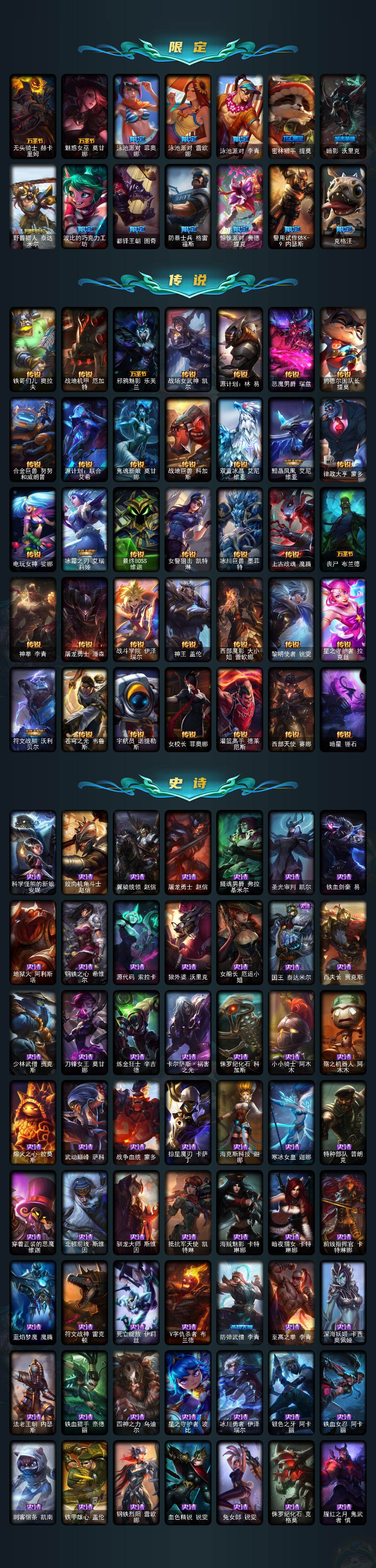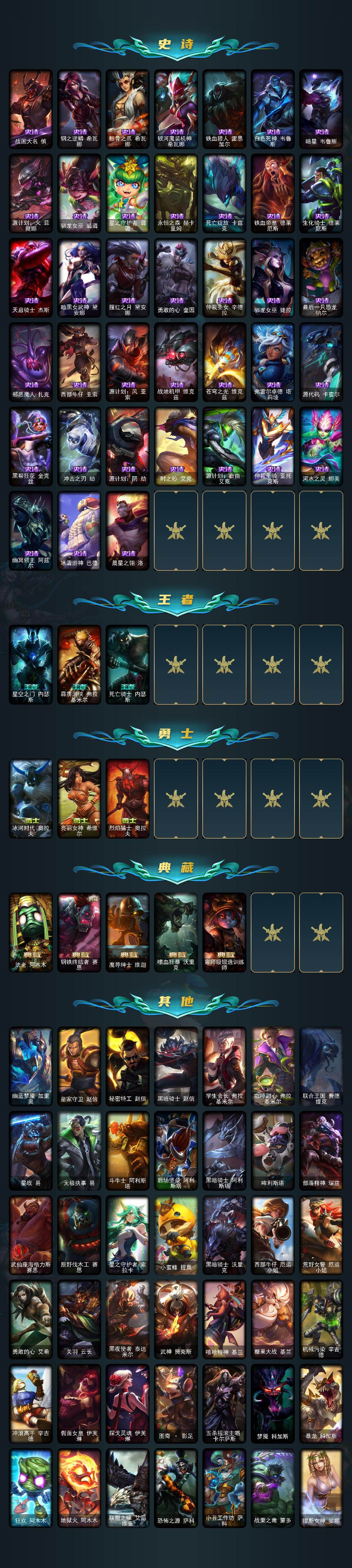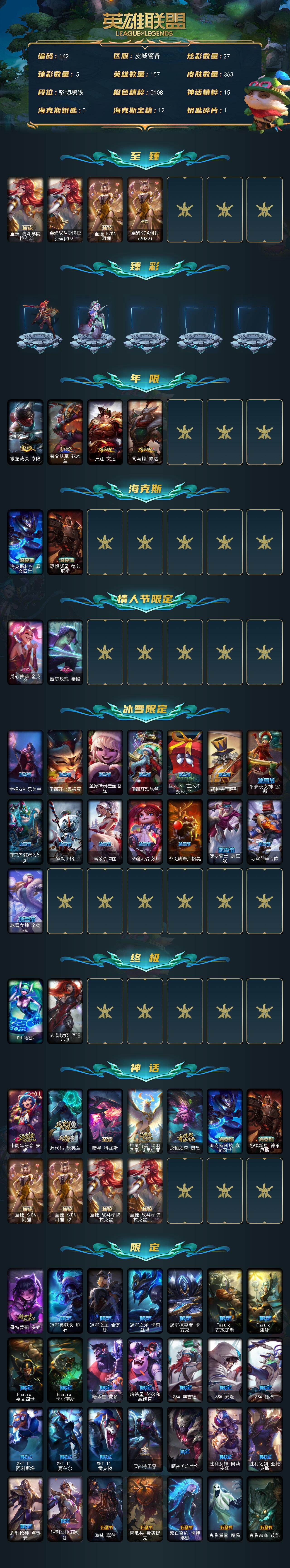 【142】未定级段位-157英雄-363皮肤-27炫彩-2终极-11神话-63限定-35传说-94史诗 【至臻皮肤】:至臻战斗学院拉克丝,至臻战斗学院拉克丝2022,至臻kda阿狸,至臻kda阿狸2022 【臻彩皮肤】:天龙之子卡莎飞龙乘云,黎明使者锐雯黑夜使者,魔女阿卡丽虚荣,净雪之月莫甘娜冬虹,霸天异形卡兹克丛林灾厄 【年限皮肤】:银龙裁决泰隆,替父从军花木兰,张辽文远,司马懿仲达 【海克斯皮肤】:海克斯科技嘉文四世,恐惧新星德莱厄斯 【情人节限定】:觅心萝莉金克丝,幽梦玫瑰泰隆 【冰雪限定】:幸福女神乐芙兰,圣诞开心鬼提莫,圣诞精灵崔丝塔娜,圣诞狂欢基兰,阿木木“主人不要我了”,胡桃夹子萨科,平安夜女神娑娜,邪恶圣诞老人维迦,雪默丁格,雪装奈德丽,圣诞玩偶波比,圣诞驯鹿克格莫,魄罗骑士瑟庄妮,冰雪节辛吉德,冰雪女神辛德拉 【终极皮肤】:dj娑娜,武装战姬厄运小姐 【神话皮肤】:十周年纪念安妮,源代码乐芙兰,暗星科加斯,神凰行者瑞羽圣凰艾尼维亚,永恒之森奥恩,海克斯科技嘉文四世,恐惧新星德莱厄斯,至臻kda阿狸,至臻kda阿狸2022,至臻战斗学院拉克丝,至臻战斗学院拉克丝2022 【限定皮肤】:哥特萝莉安妮,冠军典狱长锤石,冠军之血希瓦娜,冠军之矛卡莉丝塔,冠军掠夺者卡兹克,fnatic古拉加斯,fnatic迦娜,fnatic嘉文四世,fnatic卡尔萨斯,暗杀星蒙多,暗杀星努努和威朗普,ssw辛吉德,ssw泰隆,ssw锤石,sktt1阿利斯塔,sktt1阿兹尔,sktt1雷克顿,灵能特工易,暗裔英雄盖伦,胜利女神奥莉安娜,胜利之剑亚托克斯,胜利呛神卢锡安,胜利女神菲奥娜,海贼瑞兹,南瓜头费德提克,死亡誓约卡特琳娜,鬼影重重魔腾,鬼影森森茂凯,无头骑士赫卡里姆,魅惑女巫莫甘娜,泳池派对菲奥娜,泳池派对蕾欧娜,泳池派对李青,密林猎手提莫,暗影沃里克,野兽猎人泰达米尔,波比的巧克力工坊,都铎王朝图奇,防暴士兵格雷福斯,惊悚派对费德提克,警用试作体k9内瑟斯,克格汪 【传说皮肤】:铁哥们儿奥拉夫,战地机甲厄加特,邪鸦魅影乐芙兰,战场女武神凯尔,源计划林易,恶魔男爵瑞兹,约德尔国队长提莫,合金巨兽努努和威朗普,源计划联合艾希,鬼魂新娘莫甘娜,战地巨兽科加斯,双重冰晶艾尼维亚,黯晶凤凰艾尼维亚,律政大亨蒙多,电玩女神娑娜,冰霜之刃艾瑞莉娅,最终boss维迦,女警狙击凯特琳,冰川巨兽墨菲特,上古战魂魔腾,丧尸布兰德,神拳李青,屠龙勇士潘森,战斗学院伊泽瑞尔,神王盖伦,西部魔影大小姐蕾欧娜,黎明使者锐雯,星之守护者拉克丝,符文战熊沃利贝尔,苍穹之光韦鲁斯,宇航员诺提勒斯,女校长菲奥娜,灌篮高手德莱厄斯,西部天使赛娜,暗星锤石 【史诗皮肤】:科学怪熊的新娘安妮,绞肉机角斗士赵信,翼骑统领赵信,屠龙勇士赵信,摄魂男爵弗拉基米尔,圣光审判凯尔,铁血剑豪易,地狱火阿利斯塔,钢铁之心希维尔,源代码索拉卡,狼外婆沃里克,女船长厄运小姐,国王泰达米尔,百夫长贾克斯,少林武僧贾克斯,刀锋女王莫甘娜,炼金狂士辛吉德,卡尔萨斯祸害之光,侏罗纪化石科加斯,小小骑士阿木木,殇之机器人阿木木,熔火之心拉莫斯,武动巅峰萨科,战争血统蒙多,掠星魔刃卡萨丁,海克斯科技迦娜,寒冰女皇迦娜,特种部队普朗克,穿着正装的恶魔维迦,北领前线斯维因,驯龙大师斯维因,抵抗军天使凯特琳,海贼魅影卡特琳娜,暗夜猫女卡特琳娜,前线指挥官卡特琳娜,蓝焰梦魔魔腾,符文战神雷克顿,死亡绽放伊莉丝,v字仇杀者布兰德,防弹武僧李青,至高之拳李青,深海妖姬卡西奥佩娅,法老王朝内瑟斯,铁血猎手奈德丽,四神之力乌迪尔,星之守护者波比,冰川勇者伊泽瑞尔,银色之牙阿卡丽,铁血女忍阿卡丽,刺客信条凯南,铁甲雄心盖伦,钢铁烈阳蕾欧娜,血色精锐锐雯,兔女郎锐雯,侏罗纪化石克格莫,腥红之月鬼武者慎,战国大名慎,钢之逆鳞希瓦娜,骸骨之爪希瓦娜,银河魔装机神希瓦娜,铁血猎人雷恩加尔,白色死神韦鲁斯,暗星韦鲁斯,源计划火菲奥娜,驯龙女巫璐璐,星之守护者璐璐,永恒之森赫卡里姆,死亡绽放卡兹克,铁血帝皇德莱厄斯,生化骑士德莱厄斯,天启骑士杰斯,暗黑女武神黛安娜,腥红之月黛安娜,勇敢的心奎因,仲裁圣女辛德拉,驯龙女巫婕拉,最后一只恐龙纳尔,邪恶魔人扎克,西部牛仔亚索,源计划风亚索,战地机甲维克兹,苍穹之光维克兹,弗雷尔卓德塔莉垭,源代码卡蜜尔,黑帮狂花金克丝,冲击之刃劫,源计划阴劫,时之砂艾克,源计划自由艾克,仲裁圣骑亚托克斯,河水之灵娜美,幽冥领主阿兹尔,冰雪游神巴德,晨星之翎洛 【王者皮肤】:星空之门内瑟斯,霹雳游侠弗拉基米尔,死亡骑士内瑟斯 【勇士皮肤】:冰河时代奥拉夫,亮丽女神希维尔,烈焰猛士奥拉夫 【典藏皮肤】:法老阿木木,钢铁终结者赛恩,魔导绅士维迦,嗜血狂暴沃里克,宗师级锻造训练师 【其他皮肤1】:幽蓝梦魇加里奥,皇家守卫赵信,秘密特工赵信,黑暗骑士赵信,学生会长弗拉基米尔,咖啡甜心弗拉基米尔,联合王国费德提克,星战易,无极执事易,斗牛士阿利斯塔,后场堡垒阿利斯塔,黑暗骑士阿利斯塔,哞利斯塔,部落精神瑞兹,武仙座海格力斯赛恩,原野伐木工赛恩,星之守护者索拉卡,小蜜蜂提莫,黑暗骑士沃里克,西部牛仔厄运小姐,荒野女警厄运小姐,勇敢的心艾希,关羽云长,黑夜使者泰达米尔,武神贾克斯,嘻哈精神基兰,糖果大战基兰,机械污染辛吉德,冲浪高手辛吉德,假面女皇伊芙琳,探戈灵魂伊芙琳,图奇影足,五杀摇滚主唱卡尔萨斯,梦魇科加斯,暴龙科加斯,狂