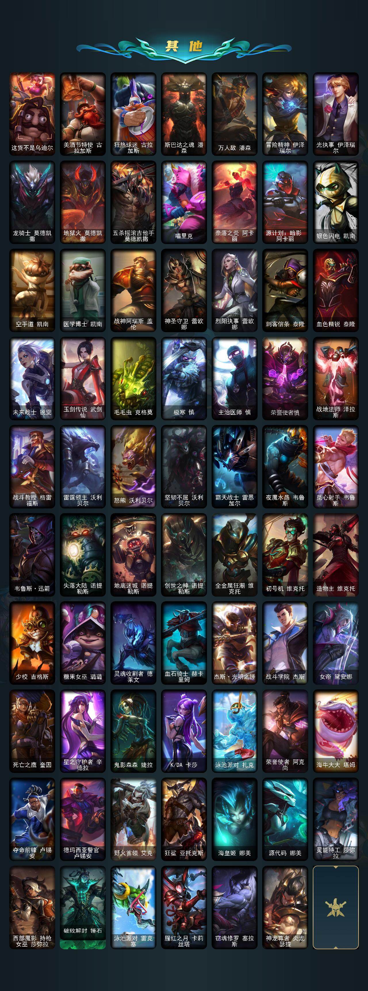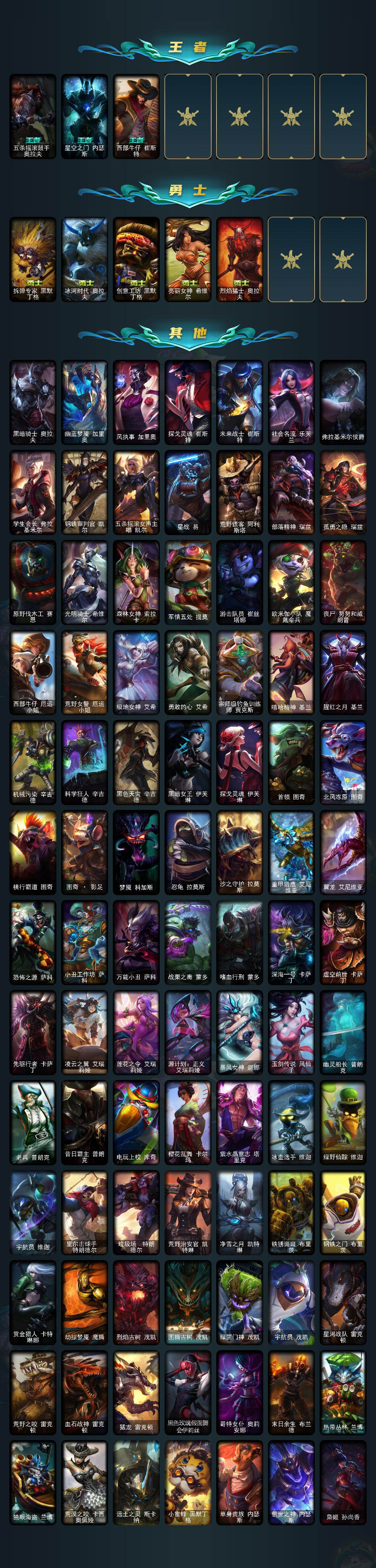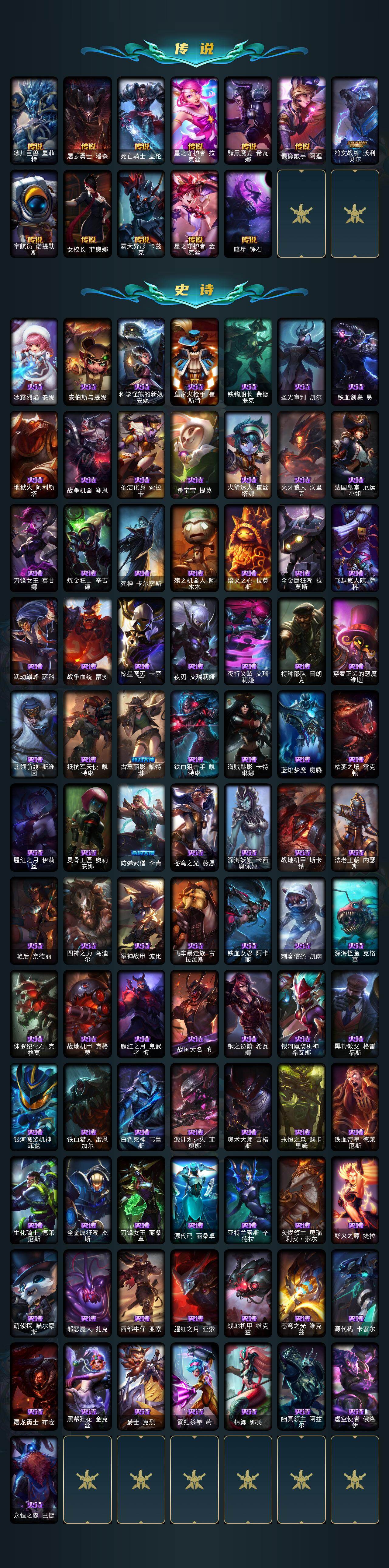 【157】未定级段位-172英雄-339皮肤-24炫彩-1终极-7神话-52限定-26传说-85史诗 【臻彩皮肤】:天龙之子卡莎飞龙乘云,战斗学院卡特琳娜盛典礼服,幻灵战斗队长厄运小姐勇气赞歌,魔女阿卡丽虚荣,净雪之月莫甘娜冬虹 【年限皮肤】:龙的传人李青,银龙裁决泰隆,替父从军花木兰,纳财大帝塔姆,点心宝贝阿木木 【海克斯皮肤】:海克斯科技克格莫,恐惧新星德莱厄斯 【冰雪限定】:圣诞开心鬼提莫,圣诞狂欢努努和威朗普,圣诞糖果棒厄运小姐,圣诞狂欢基兰,邪恶圣诞老人维迦,雪默丁格,圣诞玩偶波比,圣诞驯鹿克格莫,魄罗骑士瑟庄妮,雪球也能爆炸吉格斯 【终极皮肤】:dj娑娜 【神话皮肤】:十周年纪念安妮,源代码乐芙兰,十五周年纪念希维尔,暗星科加斯,神凰行者瑞羽圣凰艾尼维亚,海克斯科技克格莫,恐惧新星德莱厄斯 【限定皮肤】:诺斯费拉图弗拉基米尔,创星之灵璐璐,冠军之刃锐雯,冠军之刃锐雯2016,暗杀星蒙多,暗杀星努努和威朗普,暗杀星慎,sktt1贾克斯,sktt1婕拉,ssw图奇,ssw锤石,暗裔英雄盖伦,胜利女神希维尔,胜利之树茂凯,胜利呛神格雷福斯,胜利女神奥莉安娜,胜利凤凰艾尼维亚,胜利女神娑娜,胜利剑圣易,胜利之运崔斯特,胜利女神菲奥娜,南瓜头费德提克,泳池派对凯特琳,泳池派对李青,机械迷城加里奥,蓝色忧郁崔斯特,蒙多蒙多,密林猎手提莫,外星装甲库奇,波比的巧克力工坊,创战纪希维尔,勇者阿狸,都铎王朝图奇,防暴机器人布里茨,防暴天使凯尔,警用试作体k9内瑟斯 【传说皮肤】:铁哥们儿奥拉夫,魔幻卡牌崔斯特,血石领主弗拉基米尔,大天使长米迦勒凯尔,钢铁之翼凯尔,约德尔国队长提莫,烈焰雄心崔丝塔娜,女皇艾希,恶魔之刃泰达米尔,绅士科加斯,战地巨兽科加斯,双重冰晶艾尼维亚,电玩女神娑娜,红色男爵库奇,冰川巨兽墨菲特,屠龙勇士潘森,死亡骑士盖伦,星之守护者拉克丝,黯黑魔龙希瓦娜,偶像歌手阿狸,符文战熊沃利贝尔,宇航员诺提勒斯,女校长菲奥娜,霸天异形卡兹克,星之守护者金克丝,暗星锤石 【史诗皮肤】:冰霜烈焰安妮,安伯斯与提妮,科学怪熊的新娘安妮,皇家火呛手崔斯特,铁钩船长费德提克,圣光审判凯尔,铁血剑豪易,地狱火阿利斯塔,战争机器赛恩,圣洁化身索拉卡,兔宝宝提莫,火箭达人崔丝塔娜,火牙狼人沃里克,法国皇室厄运小姐,刀锋女王莫甘娜,炼金狂士辛吉德,死神卡尔萨斯,殇之机器人阿木木,熔火之心拉莫斯,全金属狂潮拉莫斯,飞越疯人院萨科,武动巅峰萨科,战争血统蒙多,掠星魔刃卡萨丁,夜刃艾瑞莉娅,夜行义贼艾瑞莉娅,特种部队普朗克,穿着正装的恶魔维迦,北领前线斯维因,抵抗军天使凯特琳,古墓丽影凯特琳,铁血狙击手凯特琳,海贼魅影卡特琳娜,蓝焰梦魔魔腾,枯萎之壤雷克顿,腥红之月伊莉丝,灵骨工匠奥莉安娜,防弹武僧李青,苍穹之光薇恩,深海妖姬卡西奥佩娅,战地机甲斯卡纳,法老王朝内瑟斯,艳后奈德丽,四神之力乌迪尔,军神战甲波比,飞车暴走族古拉加斯,铁血女忍阿卡丽,刺客信条凯南,深海怪鱼克格莫,侏罗纪化石克格莫,战地机甲克格莫,腥红之月鬼武者慎,战国大名慎,钢之逆鳞希瓦娜,银河魔装机神希瓦娜,黑帮教父格雷福斯,银河魔装机神菲兹,铁血猎人雷恩加尔,白色死神韦鲁斯,源计划火菲奥娜,奥术大师吉格斯,永恒之森赫卡里姆,铁血帝皇德莱厄斯,生化骑士德莱厄斯,全金属狂潮杰斯,刀锋女王丽桑卓,源代码丽桑卓,亚特兰蒂斯辛德拉,灰烬领主奥瑞利安索尔,野火之藤婕拉,萌侦探喵尔摩斯,邪恶魔人扎克,西部牛仔亚索,腥红之月亚索,战地机甲维克兹,苍穹之光维克兹,源代码卡蜜尔,屠龙勇士布隆,黑帮狂花金克丝,爵士克烈,霓虹杀拳蔚,锦鲤娜美,幽冥领主阿兹尔,虚空使者俄洛伊,永恒之森巴德 【王者皮肤】:五杀摇滚鼓手奥拉夫,星空之门内瑟斯,西部牛仔崔斯特 【勇士皮肤】:拆弹专家黑默丁格,冰河时代奥拉夫,创意工坊黑默丁格,亮丽女神希维尔,烈焰猛士奥拉夫 【其他皮肤1】:黑暗骑士奥拉夫,幽蓝梦魇加里奥,风执事加里奥,探戈灵魂崔斯特,未来战士崔斯特,社会名流乐芙兰,弗拉基米尔侯爵,学生会长弗拉基米尔,钢铁审判官凯尔,五杀摇滚女声主唱凯尔,星战易,荒野镖客阿利斯塔,部落精神瑞兹,孤勇之隐瑞兹,原野伐木工赛恩,光明骑士希维尔,森林女神索拉卡,军情五处提莫,游击队员崔丝塔娜,欧米伽小队魔鬼伞兵,丧尸努努和威朗普,西部牛仔厄运小姐,荒野女警厄运小姐,极地女神艾希,勇敢的心艾希,宗师级钓鱼训练师贾克斯,嘻哈精神基兰,腥红之月基兰,机械污染辛吉德,科学狂人辛吉德,黑色天灾辛吉德,黑暗女王伊芙琳,探戈灵魂伊芙琳,首领图奇,北风冻原图奇,横行霸道图奇,图奇影足,梦魇科加斯,忍龟拉莫斯,沙之守护拉莫斯,重甲猎鹰艾尼维亚,翼龙艾尼维亚,恐怖之源萨科,小丑工作坊萨科,万能小丑萨科,战栗之毒蒙多,嗜血行刑蒙多,深海一号卡萨丁,虚空前世卡萨丁,先驱行者卡萨丁,凌云之翼艾瑞莉娅,莲花之令艾瑞莉娅,源计划正义艾瑞莉娅,暴风女神迦娜,玉剑传说风仙子,幽灵船长普朗克,老兵普朗克,昔日霸主普朗克,电玩上校库奇,樱花乱舞卡尔玛,紫水晶意志塔里克,冰壶选手维迦,绿野仙踪维迦,宇航员维迦,里尔击球手特朗德尔,垃圾场特朗德尔,荒野治安官凯特琳,净雪之月凯特琳,铁锈斑斑布里茨,钢铁之门布里茨,赏金猎人卡特琳娜,劫掠梦魇魔腾,烈焰古树茂凯,图腾古树茂凯,绿茵门神茂凯,宇航员茂凯,星河