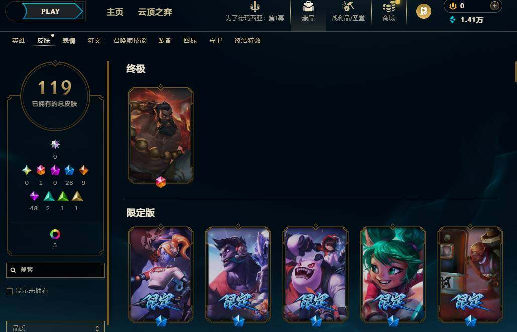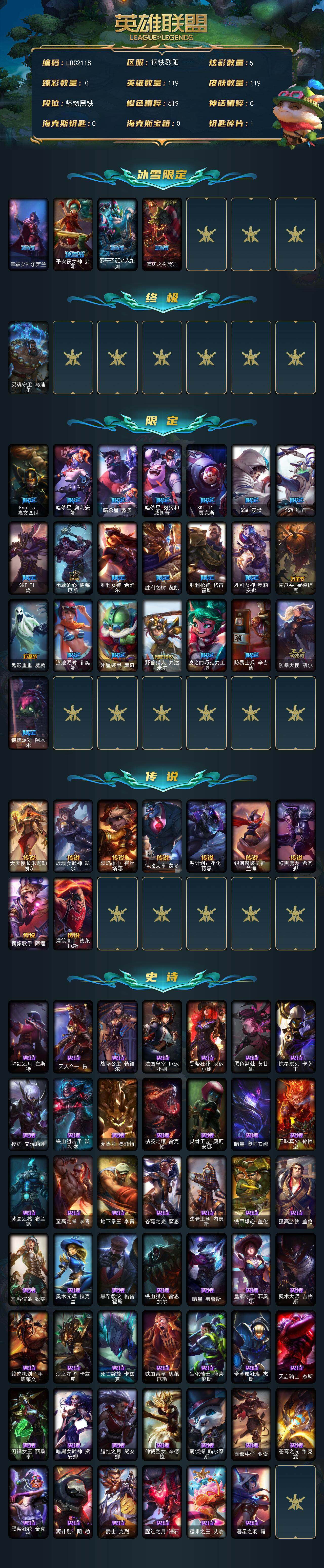 【ldc2118】119英雄/119皮肤/1终极/26限定/5炫彩/9传说/48史诗/未定级账号等级:132/幸福女神乐芙兰/平安夜女神娑娜/邪恶圣诞老人维迦/喜庆之树茂凯/灵魂守卫乌迪尔/fnatic嘉文四世/暗杀星奥莉安娜/暗杀星蒙多/暗杀星努努和威朗普/sktt1贾克斯/ssw泰隆/ssw锤石/sktt1烬/勇敢的心德莱厄斯/胜利女神希维尔/胜利之树茂凯/胜利呛神格雷福斯/胜利女神奥莉安娜/南瓜头费德提克/鬼影重重魔腾/泳池派对菲奥娜/外星装甲库奇/野兽猎人泰达米尔/波比的巧克力工坊/防暴士兵辛吉德/防暴天使凯尔/惊悚派对阿木木/大天使长米迦勒凯尔/战场女武神凯尔/烈焰雄心崔丝塔娜/律政大亨蒙多/源计划净化薇恩/银河魔装机神兰博/黯黑魔龙希瓦娜/偶像歌手阿狸/灌篮高手德莱厄斯/腥红之月崔斯特/天人合一易/战场公主希维尔/法国皇室厄运小姐/黑帮狂花厄运小姐/黑色荆棘莫甘娜/掠星魔刃卡萨丁/夜刃艾瑞莉娅/铁血狙击手凯特琳/无畏号墨菲特/枯萎之壤雷克顿/灵骨工匠奥莉安娜/暗星奥莉安娜/三昧真火孙悟空/冰晶之核布兰德/至高之拳李青/地下拳王李青/苍穹之光薇恩/法老王朝内瑟斯/铁甲雄心盖伦/孤高游侠盖伦/刺客信条锐雯/奥术光辉拉克丝/黑帮教父格雷福斯/铁血猎人雷恩加尔/暗星韦鲁斯/皇家守卫菲奥娜/奥术大师吉格斯/绞肉机刽子手德莱文/沙之守护卡兹克/死亡绽放卡兹克/铁血帝皇德莱厄斯/生化骑士德莱厄斯/全金属狂潮杰斯/天启骑士杰斯/刀锋女王丽桑卓/暗黑女武神黛安娜/腥红之月黛安娜/仲裁圣女辛德拉/萌侦探喵尔摩斯/西部牛仔亚索/苍穹之光维克兹/黑帮狂花金克丝/源计划阴劫/爵士克烈/腥红之月锤石/糖果之王艾翁/暮星之羽霞/星空之门内瑟斯/孤胆英豪嘉文四世/烈焰猛士奥拉夫/法老阿木木/风执事加里奥/赵云子龙/后场堡垒阿利斯塔/勇敢的心艾希/复仇武神贾克斯/腥红之月基兰/机械污染辛吉德/欧米伽小队毒针狙击手/自由女神卡尔萨斯/五杀摇滚主唱卡尔萨斯/日冕女神卡尔玛/垃圾场特朗德尔/海贼参谋斯维因/戴一个表布里茨/劫掠梦魇魔腾/荒野之咬雷克顿/狂热球迷古拉加斯/电玩勇者伊泽瑞尔/五杀摇滚贝斯手约里克/医学博士凯南/极寒慎/战地法师泽拉斯/光明骑士诺提勒斯/死亡骑士瑟庄妮/瑟庄妮逐晓者/少校吉格斯/泳池派对璐璐/幽魂骑士赫卡里姆/鬼影森森婕拉/海牛大大塔姆/腥红之月卡莉丝塔