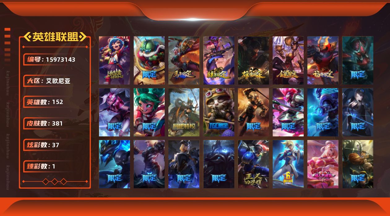 [15973143]可二次【特价出售/店主推荐】未定级段位-152英雄-381皮肤-37炫彩-0终极-1神话-63限定-47传说-100史诗 【臻彩皮肤】:神龙尊者圣龙李青登龙 【年限皮肤】:替父从军花木兰,玉净夜叉凯特琳,虎痴之拳蔚,烈焰美人薇恩,福牛守护者嘉文四世 【情人节限定】:甜心宝贝娑娜,觅心游侠卢锡安 【冰雪限定】:幸福女神乐芙兰,圣诞精灵崔丝塔娜,圣诞狂欢努努和威朗普,圣诞狂欢基兰,阿木木“主人不要我了”,平安夜女神娑娜,邪恶圣诞老人维迦,圣诞老人古拉加斯,圣诞老人布隆,冰雪节辛吉德,冰雪女神辛德拉 【神话皮肤】:十周年纪念安妮 【限定皮肤】:冠军典狱长锤石,冠军之血希瓦娜,冠军之矛卡莉丝塔,冠军之刃锐雯2016,冠军之隐劫,冠军之箭艾希,fnatic古拉加斯,fnatic迦娜,暗杀星努努和威朗普,暗杀星慎,sktt1贾克斯,sktt1劫,sktt1婕拉,sktt1李青,sktt1薇恩,ssw图奇,sktt1瑞兹,sktt1伊莉丝,sktt1奥拉夫,sktt1扎克,ig卡莎,星之守护者伊泽瑞尔,海贼瑞兹,大魔王提莫,伯爵卡萨丁,大魔法锅布里茨,鬼影重重魔腾,无头骑士赫卡里姆,魅惑女巫厄运小姐,魅惑女巫莫甘娜,泳池派对厄运小姐,泳池派对菲奥娜,泳池派对蕾欧娜,泳池派对李青,泳池派对塔里克,密林猎手提莫,外星装甲库奇,野兽猎人瑟庄妮,波比的巧克力工坊,勇者阿狸,勇者奈德丽,电玩战魂赫卡里姆,征服者诺提勒斯,防暴天使凯尔,警用试作体k9内瑟斯 【传说皮肤】:地狱之门卫士加里奥,血石领主弗拉基米尔,大天使长米迦勒凯尔,战场女武神凯尔,钢铁之翼凯尔,约德尔国队长提莫,驯龙炮手崔丝塔娜,合金巨兽努努和威朗普,源计划联合艾希,至尊魔女莫甘娜,魔女伊芙琳,双重冰晶艾尼维亚,黯晶凤凰艾尼维亚,律政大亨蒙多,电玩女神娑娜,女主播迦娜,未来战士凯特琳,战斗学院凯特琳,苹果机器人布里茨,丧尸布兰德,神拳李青,神龙尊者圣龙李青,源计划净化薇恩,银河魔装机神兰博,第三类接触黑默丁格,驯龙学者黑默丁格,炼狱魔犬内瑟斯,屠龙勇士潘森,战斗学院伊泽瑞尔,源计划超体莫德凯撒,钢铁军团盖伦,黎明使者锐雯,耀星女神拉克丝,黯黑魔龙希瓦娜,冰霜亚龙希瓦娜,星之守护者阿狸,苍穹之光韦鲁斯,宇航员诺提勒斯,女校长菲奥娜,泳池派对吉格斯,金牌主播德莱文,灌篮高手德莱厄斯,神王德莱厄斯,黑夜使者亚索,西部魔影卢锡安,暗