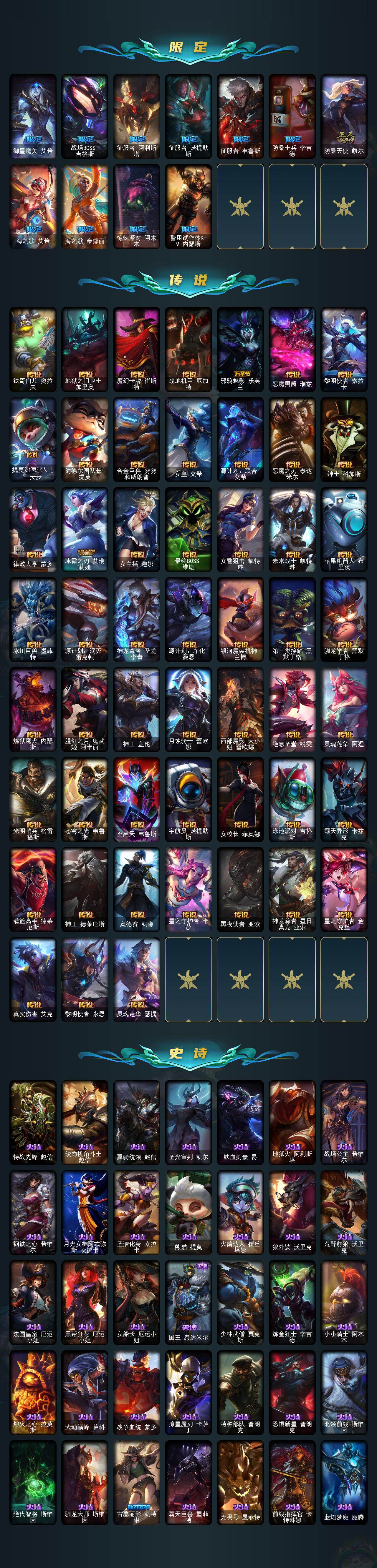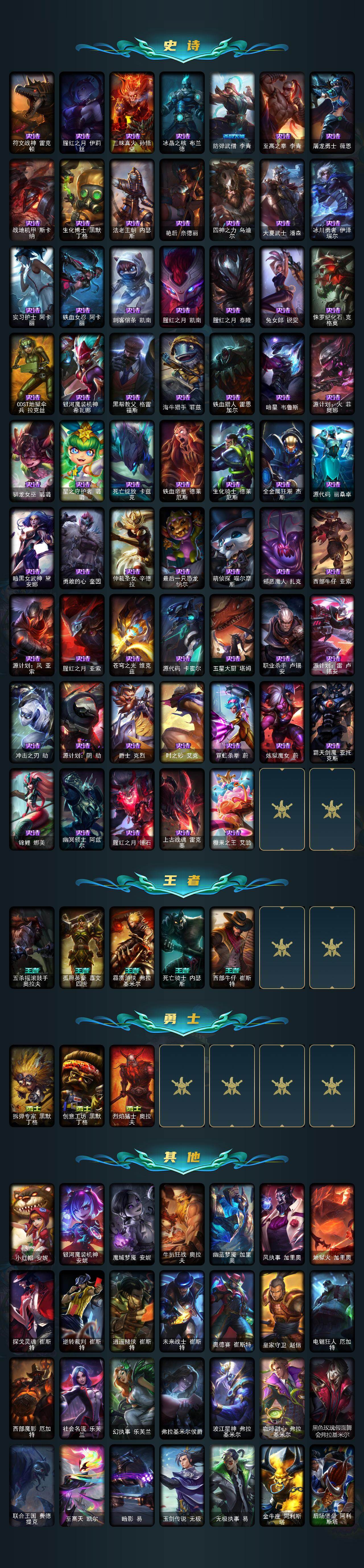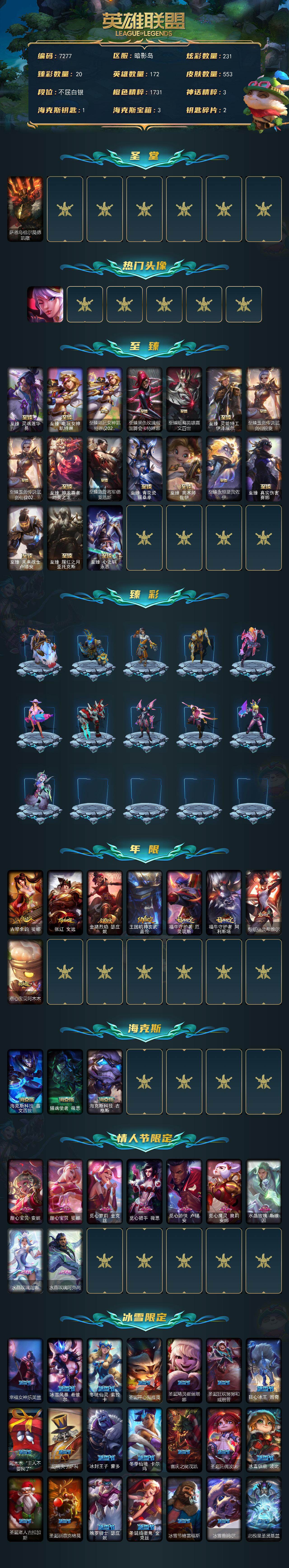 【圣堂铁男】白银段位-172英雄-553皮肤-231炫彩-6终极-26神话-120限定-52传说-96史诗 【圣堂皮肤】:萨恩乌祖尔莫德凯撒 【热门头像】:觅心之翼奎因头像 【至臻皮肤】:至臻灵魂莲华易,至臻电玩女神凯特琳,至臻电玩女神凯特琳2022,至臻黑色玫瑰假面舞会卡特琳娜,至臻暗裔英雄嘉文四世,至臻灵能特工伊泽瑞尔,至臻玉剑传说武剑仙锐雯,至臻玉剑传说武剑仙2022,至臻神龙尊者均衡之龙沃利贝尔,至臻凯旋将军德莱厄斯,至臻青花瓷丽桑卓,至臻奥术师佐伊,至臻永恒星灵佐伊,至臻真实伤害赛娜,至臻未来战士卢锡安,至臻腥红之月亚托克斯,至臻心之钢永恩 【臻彩皮肤】:天龙之子卡莎飞龙乘云,无畏骑士瑟庄妮赤子初心,墨之影武者亚索金墨耀影,冠军典狱长锤石凯旋圣装,心之钢伊泽瑞尔金声玉振,冠军之隐劫凯旋圣装,神龙尊者圣龙李青登龙,泳池派对凯特琳粉红冰川,霸天战士雷恩加尔星啸天火,弹幕天使卡莎炽天使勇敢,玉剑传说无影竞星,战斗学院卡特琳娜盛典礼服,幻灵战斗兔锐雯梦幻强袭,殿堂传奇乐芙兰登神,魔女阿卡丽虚荣,净雪之月莫甘娜冬虹,腥红之月劫鹤雪,心之钢伊泽瑞尔天纵才华 【年限皮肤】:古琴余韵娑娜,张辽文远,金猪烈焰瑟庄妮,王国机神玄武盖伦,福牛守护者厄斐琉斯,福牛守护者阿利斯塔,剪纸仙灵希维尔,点心宝贝阿木木 【海克斯皮肤】:海克斯科技嘉文四世,摄魂使者薇恩,海克斯科技吉格斯 【情人节限定】:甜心宝贝安妮,甜心宝贝娑娜,觅心萝莉金克丝,觅心猎手薇恩,觅心游侠卢锡安,觅心魔灵奥莉安娜,水晶玫瑰斯维因,水晶玫瑰迦娜,水晶玫瑰阿克尚 【冰雪限定】:幸福女神乐芙兰,冰雪风暴希维尔,冬境仙灵索拉卡,圣诞开心鬼提莫,圣诞精灵崔丝塔娜,圣诞狂欢努努和威朗普,狂心冰王图奇,阿木木“主人不要我了”,胡桃夹子萨科,冰封王子蒙多,冬季仙境卡尔玛,喜庆之树茂凯,圣诞玩偶波比,冰雪驯鹿波比,圣诞老人古拉加斯,圣诞驯鹿克格莫,魄罗骑士瑟庄妮,圣诞捣蛋鬼金克丝,冰雪节格雷福斯,冰雪兽纳尔,北极星圣贤基兰 【终极皮肤】:大元素使拉克丝,kdaallout萨勒芬妮独立音乐人,灵魂守卫乌迪尔,未来战士伊泽瑞尔 【神话皮肤】:十周年纪念安妮,源代码乐芙兰,殿堂传奇乐芙兰,水晶巫灵泽拉斯,水晶掠夺者卡兹克,灰烬骑士派克,海克斯科技嘉文四世,海克斯科技吉格斯,摄魂使者薇恩,至臻真实伤害赛娜,至臻奥术师佐伊,至臻电玩女神凯特琳,至臻电玩女神凯特琳2022,至臻灵魂莲华易,至臻灵能特工伊泽瑞尔,至臻青花瓷丽桑卓,至臻神龙尊者均衡之龙沃利贝尔,至臻未来战士卢锡安,至臻腥红之月亚托克斯,至臻心之钢永恩,至臻玉剑传说武剑仙,至臻玉剑传说武剑仙2022 【限定皮肤】:战熊骑士瑟庄妮,创星之灵璐璐,地底世界崔斯特,冠军之刃锐雯,冠军典狱长锤石,冠军之矛卡莉丝塔,冠军之刃锐雯2016,冠军之隐劫,2021全球总决赛嘉文四世,2022全球总决赛阿兹尔,fnatic迦娜,fnatic嘉文四世,暗杀星蒙多,暗杀星努努和威朗普,sktt1劫,sktt1婕拉,ssw辛吉德,ssw图奇,ssw泰隆,ssw雷恩加尔,ssw锤石,sktt1阿兹尔,sktt1卡莉丝塔,sktt1瑞兹,sktt1艾克,sktt1烬,sktt1辛德拉,sktt1扎克,ssg伊泽瑞尔,ig乐芙兰,ig洛,f薇恩,f锤石,dwg凯南,dwg奈德丽,dwg烬,edg佛耶戈,edg厄斐琉斯,drx阿卡丽,暗裔英雄泰达米尔,暗裔英雄盖伦,胜利女神奥莉安娜,胜利之剑亚托克斯,胜利剑圣易,胜利之运崔斯特,胜利女神菲奥娜,南瓜头费德提克,鬼影森森茂凯,小恶魔菲兹,死亡誓约维克托,不给糖就捣蛋艾克,魅惑女巫崔丝塔娜,魅惑女巫莫甘娜,魅惑女巫奈德丽,魅惑女巫波比,魅惑女巫辛德拉,糖果使徒费德提克,泳池派对厄运小姐,泳池派对格雷福斯,泳池派对凯特琳,泳池派对辛德拉,泳池派对佐伊,怦然心动凯特琳,破空呛骑孙悟空,暗影沃里克,奥德赛吉格斯,野兽猎人德莱文,野兽猎人瑟庄妮,野兽猎人泰达米尔,波比的巧克力工坊,御星魔矢艾希,战场boss吉格斯,征服者阿利斯塔,征服者诺提勒斯,征服者韦鲁斯,防暴士兵辛吉德,防暴天使凯尔,海之歌艾希,海之歌奈德丽,惊悚派对阿木木,警用试作体k9内瑟斯,双城之战2微光实验室辛吉德 【传说皮肤】:铁哥们儿奥拉夫,地狱之门卫士加里奥,魔幻卡牌崔斯特,战地机甲厄加特,邪鸦魅影乐芙兰,恶魔男爵瑞兹,黎明使者索拉卡,提莫约德尔人的一大步,约德尔国队长提莫,合金巨兽努努和威朗普,女皇艾希,源计划联合艾希,恶魔之刃泰达米尔,绅士科加斯,律政大亨蒙多,冰霜之刃艾瑞莉娅,女主播迦娜,最终boss维迦,女警狙击凯特琳,未来战士凯特琳,苹果机器人布里茨,冰川巨兽墨菲特,源计划泯灭雷克顿,神龙尊者圣龙李青,源计划净化薇恩,银河魔装机神兰博,第三类接触黑默丁格,驯龙学者黑默丁格,炼狱魔犬内瑟斯,腥红之月鬼武姬阿卡丽,神王盖伦,月蚀骑士蕾欧娜,西部魔影大小姐蕾欧娜,绝息圣堂锐雯,灵魂莲华阿狸,光明哨兵格雷福斯,苍穹之光韦鲁斯,至高天韦鲁斯,宇航员诺提勒斯,女校长菲奥娜,泳池派对吉格斯,霸天异形卡兹克,灌篮高手德莱厄斯,神王德莱厄斯,奥德赛凯隐,星之守护者卡莎,黑夜使者亚索,神龙尊者昼日真龙亚索,星之守护者金克丝,真实伤害艾克,黎明使者永恩,灵魂莲华瑟提 【史诗皮肤】:特战先锋赵信,绞肉机角斗士赵信,翼骑统领赵信,圣光审判凯尔,铁血剑豪易,地狱火阿利斯塔,战场公主希维尔,钢铁之心希维尔,月光女神阿忒弥斯索拉卡,圣洁化身索拉卡,熊猫提莫,