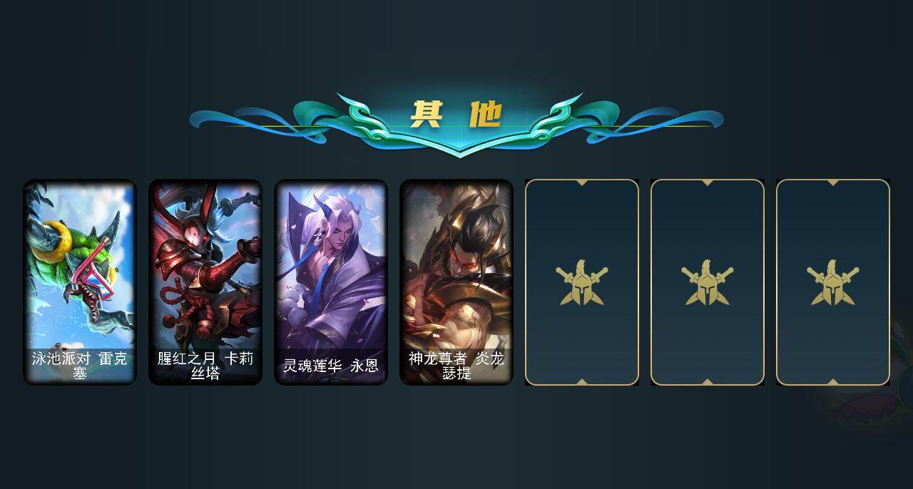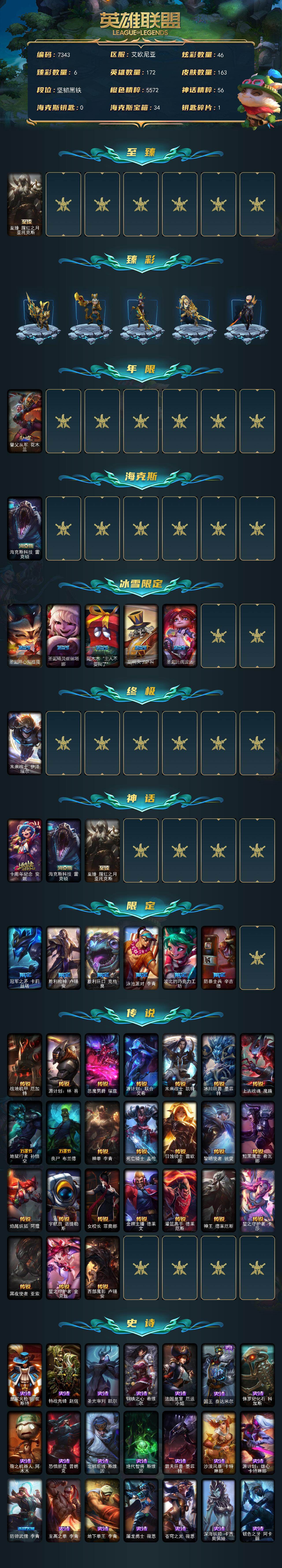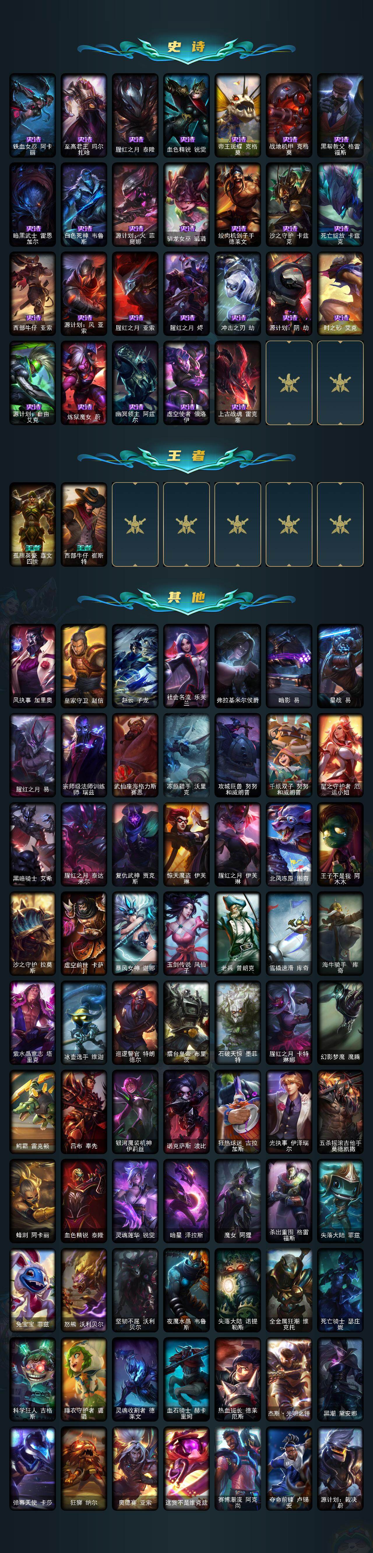 未定级段位-172英雄-163皮肤-46炫彩-1终极-3神话-12限定-24传说-47史诗 【至臻皮肤】:至臻腥红之月亚托克斯 【臻彩皮肤】:吕布奉先炫金战神,替父从军花木兰炫金龙刃,玉净夜叉凯特琳炫金神机,赵云子龙炫金将军,源计划火菲奥娜惩戒,霸天异形卡兹克丛林灾厄 【年限皮肤】:替父从军花木兰 【海克斯皮肤】:海克斯科技雷克顿 【冰雪限定】:圣诞开心鬼提莫,圣诞精灵崔丝塔娜,阿木木“主人不要我了”,胡桃夹子萨科,圣诞玩偶波比 【终极皮肤】:未来战士伊泽瑞尔 【神话皮肤】:十周年纪念安妮,海克斯科技雷克顿,至臻腥红之月亚托克斯 【限定皮肤】:冠军之矛卡莉丝塔,胜利呛神卢锡安,胜利巨口克格莫,泳池派对李青,波比的巧克力工坊,防暴士兵辛吉德 【传说皮肤】:战地机甲厄加特,源计划林易,恶魔男爵瑞兹,源计划联合艾希,未来战士凯特琳,冰川巨兽墨菲特,上古战魂魔腾,地狱行者孙悟空,丧尸布兰德,神拳李青,死亡骑士盖伦,日蚀骑士蕾欧娜,黎明使者锐雯,黯黑魔龙希瓦娜,焰尾妖狐阿狸,宇航员诺提勒斯,女校长菲奥娜,金牌主播德莱文,灌篮高手德莱厄斯,神王德莱厄斯,星之守护者卡莎,黑夜使者亚索,星之守护者金克丝,西部魔影卢锡安 【史诗皮肤】:皇家火呛手崔斯特,特战先锋赵信,圣光审判凯尔,钢铁之心希维尔,法国皇室厄运小姐,国王泰达米尔,侏罗纪化石科加斯,殇之机器人阿木木,恐惧新星普朗克,北领前线斯维因,绝代智将斯维因,霸天巨兽墨菲特,沙漠风暴卡特琳娜,源计划雄心卡特琳娜,防弹武僧李青,至高之拳李青,地下拳王李青,屠龙勇士薇恩,苍穹之光薇恩,深海妖姬卡西奥佩娅,银色之牙阿卡丽,铁血女忍阿卡丽,至高君王玛尔扎哈,腥红之月泰隆,血色精锐锐雯,帝王斑蝶克格莫,战地机甲克格莫,黑帮教父格雷福斯,暗黑武士雷恩加尔,白色死神韦鲁斯,源计划火菲奥娜,驯龙女巫璐璐,绞肉机刽子手德莱文,沙之守护卡兹克,死亡绽放卡兹克,西部牛仔亚索,源计划风亚索,腥红之月亚索,腥红之月烬,冲击之刃劫,源计划阴劫,时之砂艾克,源计划自由艾克,炼狱魔女蔚,幽冥领主阿兹尔,虚空使者俄洛伊,上古战魂雷克塞 【王者皮肤】:孤胆英豪嘉文四世,西部牛仔崔斯特 【其他皮肤1】:风执事加里奥,皇家守卫赵信,赵云子龙,社会名流乐芙兰,弗拉基米尔侯爵,暗影易,星战易,腥红之月易,宗师级法师训练师瑞兹,武仙座海格力斯赛恩,冻原猎手沃里克,攻城巨兽努努和威朗普,千纸双子努努和威朗普,星之守护者厄运小姐,黑暗骑士艾希,腥红之月泰达米尔,复仇武神贾克斯,惊天魔盗伊芙琳,腥红之月伊芙琳,北风冻原图奇,王子不是我阿木木,沙之守护拉莫斯,虚空前世卡萨丁,暴风女神迦娜,玉剑传说风仙子,老兵普朗克,雪橇速滑库奇,海牛骑手库奇,紫水晶意志塔里克,冰壶选手维迦,巡逻警官特朗德尔,擂台皇帝布里茨,石破天惊墨菲特,腥红之月卡特琳娜,幻影梦魔魔腾,鳄霸雷克顿,吕布奉先,银河魔装机神伊莉丝,诺克萨斯波比,狂热球迷古拉加斯,光执事伊泽瑞尔,五杀摇滚吉他手莫德凯撒,蜂刺阿卡丽,血色精锐泰隆,灵魂莲华锐雯,暗星泽拉斯,魔女阿狸,杀出重围格雷福斯,失落大陆菲兹,兔宝宝菲兹,怒熊沃利贝尔,坚韧不屈沃利贝尔,夜魔水晶韦鲁斯,失落大陆诺提勒斯,全金属狂潮维克托,死亡骑士瑟庄妮,科学狂人吉格斯,睡衣守护者璐璐,灵魂收割者德莱文,血石骑士赫卡里姆,热血班长德莱厄斯,杰斯光明之锤,黑潮黛安娜,弹幕天使卡莎,狂狮纳尔,奥德赛亚索,这货不是维克兹,赛博潮流阿克尚,夺命前锋卢锡安,源计划裁决蔚,泳池派对雷克塞,腥红之月卡莉丝塔,灵魂莲华永恩,神龙尊者炎龙瑟提