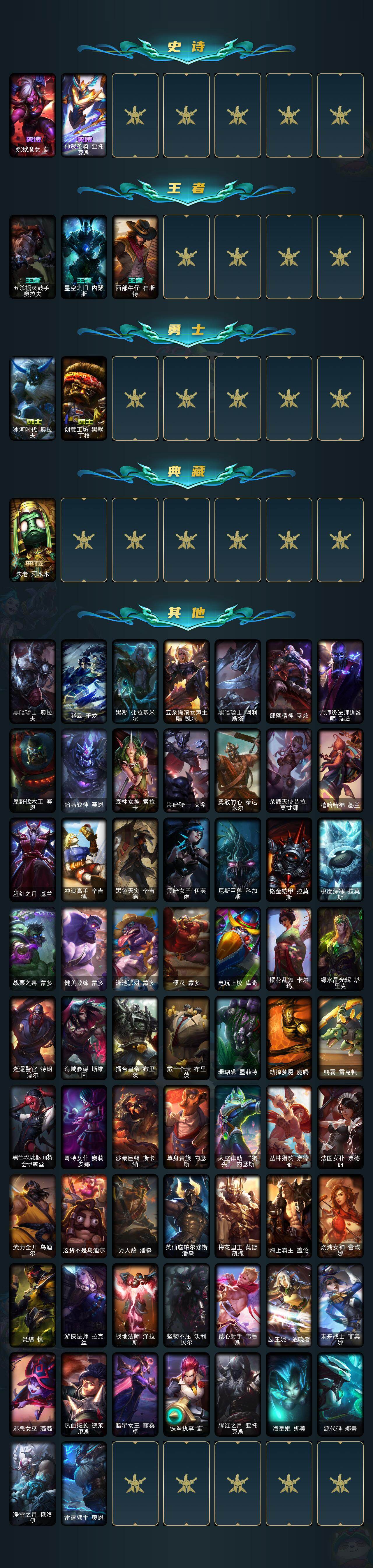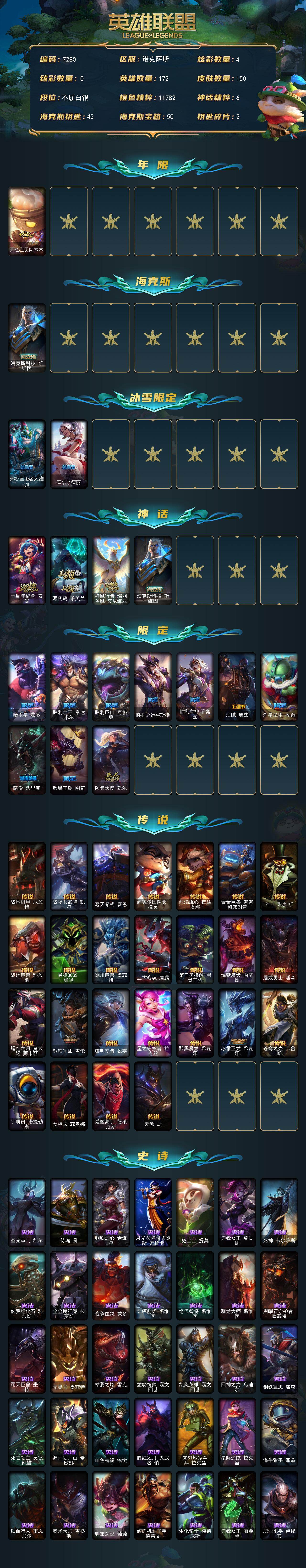 白银段位-172英雄-150皮肤-4炫彩-0终极-4神话-13限定-25传说-37史诗 【年限皮肤】:点心宝贝阿木木 【海克斯皮肤】:海克斯科技斯维因 【冰雪限定】:邪恶圣诞老人维迦,雪装奈德丽 【神话皮肤】:十周年纪念安妮,源代码乐芙兰,神凰行者瑞羽圣凰艾尼维亚,海克斯科技斯维因 【限定皮肤】:暗杀星蒙多,胜利之王泰达米尔,胜利巨口克格莫,胜利之运崔斯特,胜利女神菲奥娜,海贼瑞兹,外星装甲库奇,暗影沃里克,都铎王朝图奇,防暴天使凯尔 【传说皮肤】:战地机甲厄加特,战场女武神凯尔,霸天零式赛恩,约德尔国队长提莫,烈焰雄心崔丝塔娜,合金巨兽努努和威朗普,绅士科加斯,战地巨兽科加斯,最终boss维迦,冰川巨兽墨菲特,上古战魂魔腾,第三类接触黑默丁格,炼狱魔犬内瑟斯,屠龙勇士潘森,腥红之月鬼武姬阿卡丽,钢铁军团盖伦,黎明使者锐雯,星之守护者拉克丝,黯黑魔龙希瓦娜,冰霜亚龙希瓦娜,苍穹之光韦鲁斯,宇航员诺提勒斯,女校长菲奥娜,灌篮高手德莱厄斯,天煞劫 【史诗皮肤】:圣光审判凯尔,侍魂易,钢铁之心希维尔,月光女神阿忒弥斯索拉卡,兔宝宝提莫,刀锋女王莫甘娜,死神卡尔萨斯,侏罗纪化石科加斯,全金属狂潮拉莫斯,战争血统蒙多,北领前线斯维因,绝代智将斯维因,驯龙大师斯维因,黑曜石守护者墨菲特,霸天巨兽墨菲特,无畏号墨菲特,枯萎之壤雷克顿,龙骑统帅嘉文四世,凯旋英雄嘉文四世,四神之力乌迪尔,钢铁意志潘森,死亡领主莫德凯撒,源计划山蕾欧娜,血色精锐锐雯,腥红之月鬼武者慎,odst地狱伞兵拉克丝,星际迷航拉克丝,海牛猎手菲兹,铁血猎人雷恩加尔,奥术大师吉格斯,驯龙女巫璐璐,绞肉机刽子手德莱文,生化骑士德莱厄斯,刀锋女王丽桑卓,职业杀手卢锡安,炼狱魔女蔚,仲裁圣骑亚托克斯 【王者皮肤】:五杀摇滚鼓手奥拉夫,星空之门内瑟斯,西部牛仔崔斯特 【勇士皮肤】:冰河时代奥拉夫,创意工坊黑默丁格 【典藏皮肤】:法老阿木木 【其他皮肤1】:黑暗骑士奥拉夫,赵云子龙,黑潮弗拉基米尔,五杀摇滚女声主唱凯尔,黑暗骑士阿利斯塔,部落精神瑞兹,宗师级法师训练师瑞兹,原野伐木工赛恩,黯晶战神赛恩,森林女神索拉卡,黑暗骑士艾希,勇敢的心泰达米尔,杀戮天使昔拉莫甘娜,嘻哈精神基兰,腥红之月基兰,冲浪高手辛吉德,黑色天灾辛吉德,黑暗女王伊芙琳,尼斯巨兽科加斯,铬金铠甲拉莫斯,极度深寒拉莫斯,战栗之毒蒙多,健美教练蒙多,泳池派对蒙多,硬汉蒙多,电玩上校库奇,樱花乱舞卡尔玛,绿水晶光辉塔里克,巡逻警官特朗德尔,海贼参谋斯维因,擂台皇帝布里茨,戴一个表布里茨,珊瑚礁墨菲特,劫掠梦魇魔腾,鳄霸雷克顿,黑色玫瑰假面舞会伊莉丝,哥特女仆奥莉安娜,沙暴巨蝎斯卡纳,单身贵族内瑟斯,太空律动狗头内瑟斯,丛林猎豹奈德丽,法国女仆奈德丽,武力全开乌迪尔,这货不是乌迪尔,万人敌潘森,英仙座珀尔修斯潘森,梅花国王莫德凯撒,海上霸主盖伦,烧烤女神蕾欧娜,炎爆慎,游侠法师拉克丝,战地法师泽拉斯,坚韧不屈沃利贝尔,觅心射手韦鲁斯,瑟庄妮逐晓者,未来战士菲奥娜,邪恶女巫璐璐,热血班长德莱厄斯,暗星女王丽桑卓,铁拳执事蔚,腥红之月亚托克斯,海皇姬娜美,源代码娜美,净雪之月俄洛伊,雷霆领主奥恩