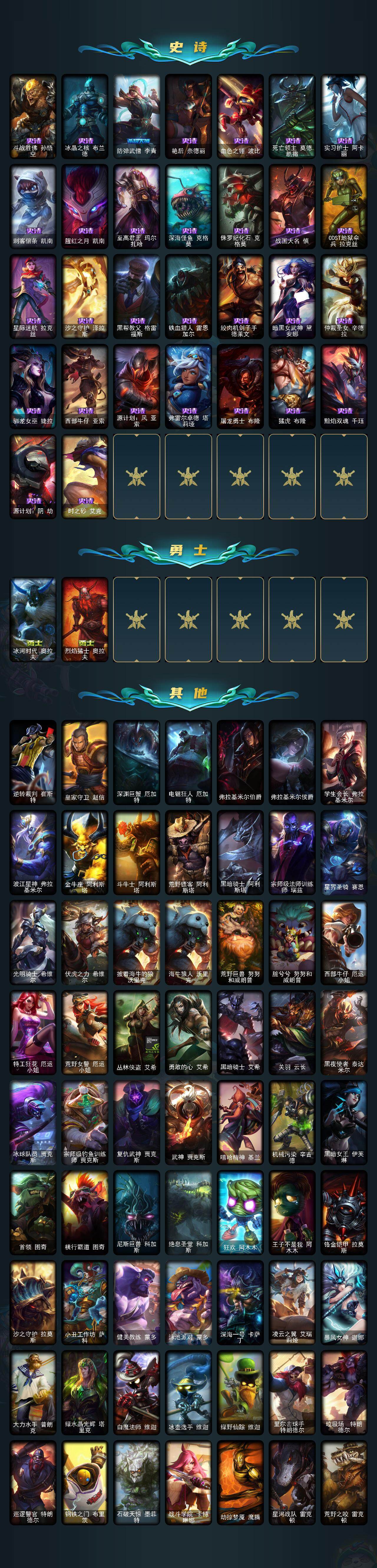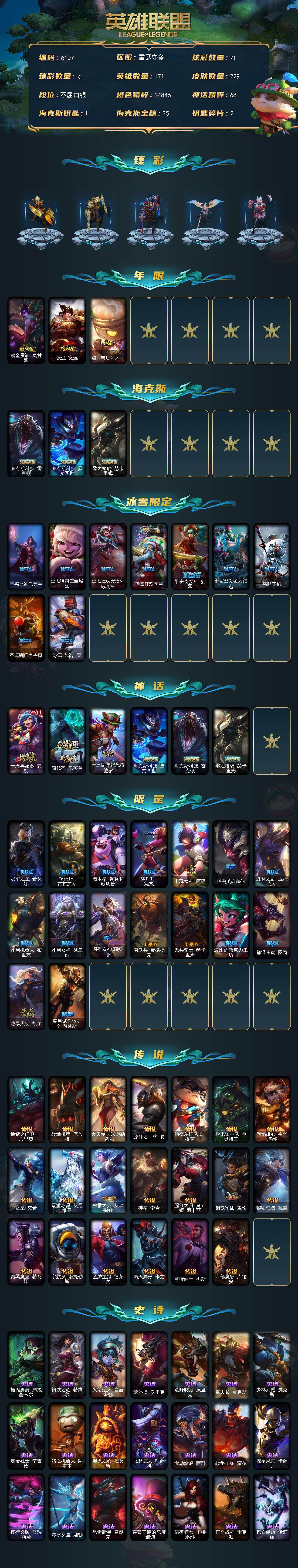 单双白银段位-171英雄-229皮肤-71炫彩-0终极-6神话-28限定-20传说-51史诗 【臻彩皮肤】:征服者韦鲁斯炫金,冠军之隐劫凯旋圣装,玉剑传说无劫胭脂,玉剑传说翼剑仙珠光,星之守护者卡莎热情之光,魔女阿狸饕餮 【年限皮肤】:紫金罗刹莫甘娜,张辽文远,点心宝贝阿木木 【海克斯皮肤】:海克斯科技雷克顿,海克斯科技嘉文四世,零之呛骑赫卡里姆 【冰雪限定】:幸福女神乐芙兰,圣诞精灵崔丝塔娜,圣诞狂欢努努和威朗普,圣诞狂欢基兰,平安夜女神娑娜,邪恶圣诞老人维迦,雪默丁格,圣诞驯鹿克格莫,冰雪节辛吉德 【神话皮肤】:十周年纪念安妮,源代码乐芙兰,十五周年纪念希维尔,海克斯科技嘉文四世,海克斯科技雷克顿,零之呛骑赫卡里姆 【限定皮肤】:冠军之血希瓦娜,fnatic古拉加斯,暗杀星努努和威朗普,sktt1婕拉,电玩女神阿狸,暗裔英雄盖伦,胜利之剑亚托克斯,胜利机器人布里茨,胜利女神瑟庄妮,胜利女神菲奥娜,南瓜头费德提克,无头骑士赫卡里姆,波比的巧克力工坊,都铎王朝图奇,防暴天使凯尔,警用试作体k9内瑟斯 【传说皮肤】:地狱之门卫士加里奥,战地机甲厄加特,大天使长米迦勒凯尔,源计划林易,约德尔国队长提莫,欧米伽小队幽灵特工,烈焰雄心崔丝塔娜,女皇艾希,双重冰晶艾尼维亚,冰霜之刃艾瑞莉娅,神拳李青,腥红之月鬼武姬阿卡丽,钢铁军团盖伦,黎明使者锐雯,黯黑魔龙希瓦娜,宇航员诺提勒斯,金牌主播德莱文,霸天异形卡兹克,蔷薇绅士杰斯,西部魔影卢锡安 【史诗皮肤】:摄魂男爵弗拉基米尔,钢铁之心希维尔,火箭达人崔丝塔娜,狼外婆沃里克,荒野豺狼沃里克,百夫长贾克斯,少林武僧贾克斯,炼金狂士辛吉德,殇之机器人阿木木,熔火之心拉莫斯,飞越疯人院萨科,武动巅峰萨科,战争血统蒙多,掠星魔刃卡萨丁,夜行义贼艾瑞莉娅,寒冰女皇迦娜,恐惧新星普朗克,穿着正装的恶魔维迦,暗夜猫女卡特琳娜,符文战神雷克顿,死亡绽放伊莉丝,斗战胜佛孙悟空,冰晶之核布兰德,防弹武僧李青,艳后奈德丽,血色之锤波比,死亡领主莫德凯撒,实习护士阿卡丽,刺客信条凯南,腥红之月凯南,至高君王玛尔扎哈,深海怪鱼克格莫,侏罗纪化石克格莫,战国大名慎,odst地狱伞兵拉克丝,星际迷航拉克丝,沙之守护泽拉斯,黑帮教父格雷福斯,铁血猎人雷恩加尔,绞肉机刽子手德莱文,暗黑女武神黛安娜,仲裁圣女辛德拉,驯龙女巫婕拉,西部牛仔亚索,源计划风亚索,弗雷尔卓德塔莉垭,屠龙勇士布隆,猛虎布隆,黯焰双魂千珏,源计划阴劫,时之砂艾克 【勇士皮肤】:冰河时代奥拉夫,烈焰猛士奥拉夫 【其他皮肤1】:逆转裁判崔斯特,皇家守卫赵信,深渊巨蟹厄加特,电锯狂人厄加特,弗拉基米尔伯爵,弗拉基米尔侯爵,学生会长弗拉基米尔,波江星神弗拉基米尔,金牛座阿利斯塔,斗牛士阿利斯塔,荒野镖客阿利斯塔,黑暗骑士阿利斯塔,宗师级法师训练师瑞兹,星界圣骑赛恩,光明骑士希维尔,伏虎之力希维尔,披着海牛的狼沃里克,海牛狼人沃里克,荒野巨兽努努和威朗普,脏兮兮努努和威朗普,西部牛仔厄运小姐,特工狂花厄运小姐,荒野女警厄运小姐,丛林侠盗艾希,勇敢的心艾希,黑暗骑士艾希,关羽云长,黑夜使者泰达米尔,冰球队员贾克斯,宗师级钓鱼训练师贾克斯,复仇武神贾克斯,武神贾克斯,嘻哈精神基兰,机械污染辛吉德,黑暗女王伊芙琳,首领图奇,横行霸道图奇,尼斯巨兽科加斯,绝息圣堂科加斯,狂欢阿木木,王子不是我阿木木,铬金铠甲拉莫斯,沙之守护拉莫斯,小丑工作坊萨科,健美教练蒙多,泳池派对蒙多,深海一号卡萨丁,凌云之翼艾瑞莉娅,暴风女神迦娜,大力水手普朗克,绿水晶光辉塔里克,白魔法师维迦,冰壶选手维迦,绿野仙踪维迦,里尔击球手特朗德尔,垃圾场特朗德尔,巡逻警官特朗德尔,钢铁之门布里茨,石破天惊墨菲特,战斗学院卡特琳娜,劫掠梦魇魔腾,星河战队雷克顿,荒野之咬雷克顿,猛龙雷克顿,银河魔装机神伊莉丝,末日余生布兰德,传统僧侣李青,荒漠之咬卡西奥佩娅,蛇发女妖卡西奥佩娅,沙之守护斯卡纳,单身贵族内瑟斯,法国女仆奈德丽,武力全开乌迪尔,墨影行者乌迪尔,诺克萨斯波比,乡村农夫古拉加斯,品酒大师古拉加斯,美酒节特使古拉加斯,狂热球迷古拉加斯,英仙座珀尔修斯潘森,冒险精神伊泽瑞尔,光执事伊泽瑞尔,黑桃皇牌伊泽瑞尔,五杀摇滚贝斯手约里克,红色彗星凯南,战神阿瑞斯盖伦,烧烤女神蕾欧娜,暗影王子玛尔扎哈,虚空执事玛尔扎哈,刺客信条泰隆,泰隆黑木,毛毛虫克格莫,极寒慎,游侠法师拉克丝,太空律动闪耀灯球拉克丝,怒之火炮格雷福斯,杀出重围格雷福斯,失落大陆菲兹,神龙尊者均衡之龙沃利贝尔,霸天战士雷恩加尔,雷喵喵尔,失落大陆诺提勒斯,地底迷城诺提勒斯,光明骑士诺提勒斯,全金属狂潮维克托,死亡骑士瑟庄妮,源计划统帅瑟庄妮,玉剑传说无双,灵魂收割者德莱文,泳池派对德莱文,热血班长德莱厄斯,银河魔装机神纳尔,宇航员纳尔,永恒之森纳尔,泳池派对扎克,奥德赛亚索,源代码娜美,永恒之森阿兹尔,深渊恐惧锤石,山海绘卷妮蔻,女帝芮尔,怨之砂派克