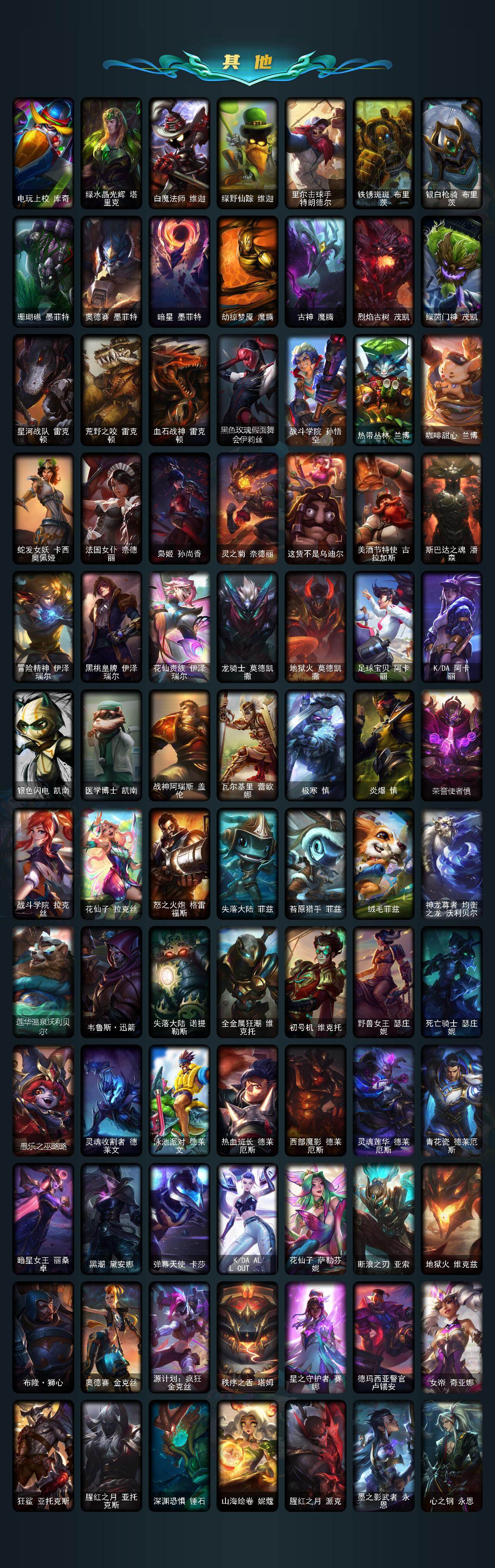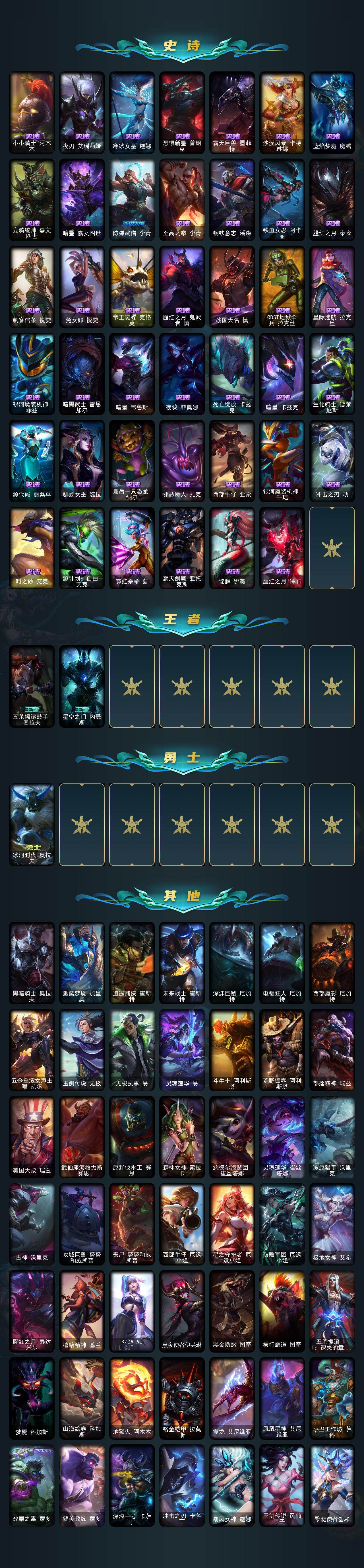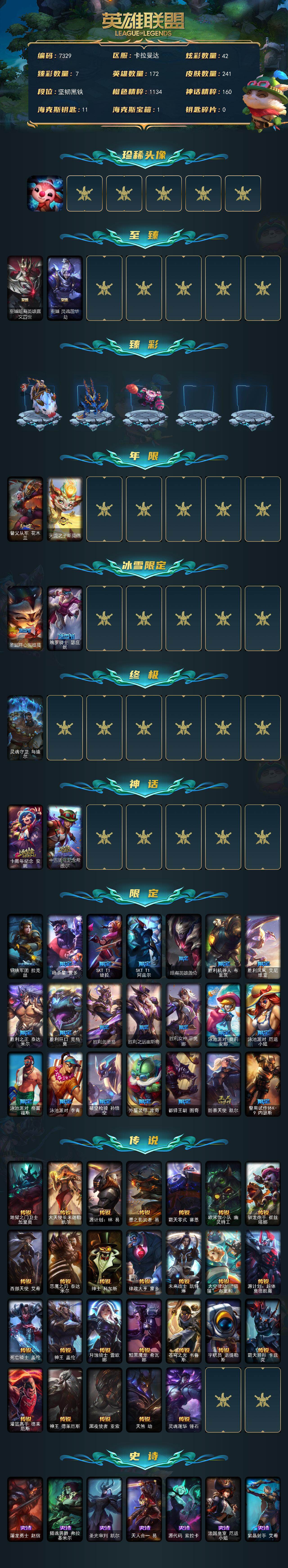 未定级段位-172英雄-241皮肤-42炫彩-1终极-4神话-25限定-26传说-48史诗 【珍稀头像】:至爱的鹿头像 【至臻皮肤】:至臻暗裔英雄嘉文四世,至臻灵魂莲华劫 【臻彩皮肤】:无畏骑士瑟庄妮赤子初心,霸天异形卡兹克掠空魅影,星之守护者娑娜未来之光,可爱可爱粉红红布里茨,咖啡甜心格温酒醉樱桃,魔女阿卡丽虚荣,魔女阿狸饕餮 【年限皮肤】:替父从军花木兰,天龙之子斯莫德 【冰雪限定】:圣诞开心鬼提莫,魄罗骑士瑟庄妮 【终极皮肤】:灵魂守卫乌迪尔 【神话皮肤】:十周年纪念安妮,十五周年纪念希维尔 【限定皮肤】:钢铁军团拉克丝,暗杀星蒙多,sktt1婕拉,sktt1阿兹尔,暗裔英雄盖伦,胜利机器人布里茨,胜利凤凰艾尼维亚,胜利之王泰达米尔,胜利巨口克格莫,胜利剑圣易,胜利之运崔斯特,胜利女神菲奥娜,泳池派对奥莉安娜,泳池派对厄运小姐,泳池派对格雷福斯,泳池派对李青,破空呛骑孙悟空,外星装甲库奇,都铎王朝图奇,防暴天使凯尔,警用试作体k9内瑟斯 【传说皮肤】:地狱之门卫士加里奥,大天使长米迦勒凯尔,源计划林易,墨之影武者易,霸天零式赛恩,欧米伽小队幽灵特工,驯龙炮手崔丝塔娜,西部天使艾希,恶魔之刃泰达米尔,绅士科加斯,律政大亨蒙多,未来战士凯特琳,太空律动猫猫布里和里茨,源计划超体莫德凯撒,死亡骑士盖伦,神王盖伦,月蚀骑士蕾欧娜,黯黑魔龙希瓦娜,苍穹之光韦鲁斯,宇航员诺提勒斯,霸天异形卡兹克,灌篮高手德莱厄斯,神王德莱厄斯,黑夜使者亚索,天煞劫,灵魂莲华锤石 【史诗皮肤】:屠龙勇士赵信,摄魂男爵弗拉基米尔,圣光审判凯尔,天人合一易,源代码索拉卡,法国皇室厄运小姐,紫晶射手艾希,小小骑士阿木木,夜刃艾瑞莉娅,寒冰女皇迦娜,恐惧新星普朗克,霸天巨兽墨菲特,沙漠风暴卡特琳娜,蓝焰梦魔魔腾,龙骑统帅嘉文四世,暗星嘉文四世,防弹武僧李青,至高之拳李青,钢铁意志潘森,铁血女忍阿卡丽,腥红之月泰隆,刺客信条锐雯,兔女郎锐雯,帝王斑蝶克格莫,腥红之月鬼武者慎,战国大名慎,odst地狱伞兵拉克丝,星际迷航拉克丝,银河魔装机神菲兹,暗黑武士雷恩加尔,暗星韦鲁斯,夜鸦菲奥娜,死亡绽放卡兹克,暗星卡兹克,生化骑士德莱厄斯,源代码丽桑卓,驯龙女巫婕拉,最后一只恐龙纳尔,邪恶魔人扎克,西部牛仔亚索,银河魔装机神千珏,冲击之刃劫,时之砂艾克,源计划自由艾克,霓虹杀拳蔚,霸天剑魔亚托克斯,锦鲤娜美,腥红之月锤石 【王者皮肤】:五杀摇滚鼓手奥拉夫,星空之门内瑟斯 【勇士皮肤】:冰河时代奥拉夫 【其他皮肤1】:黑暗骑士奥拉夫,幽蓝梦魇加里奥,赌侠崔斯特,未来战士崔斯特,深渊巨蟹厄加特,电锯狂人厄加特,西部魔影厄加特,五杀摇滚女声主唱凯尔,玉剑传说无极,无极执事易,灵魂莲华易,斗牛士阿利斯塔,荒野镖客阿利斯塔,部落精神瑞兹,美国大叔瑞兹,武仙座海格力斯赛恩,原野伐木工赛恩,森林女神索拉卡,约德尔海贼团崔丝塔娜,灵魂莲华崔丝塔娜,冻原猎手沃里克,古神沃里克,攻城巨兽努努和威朗普,丧尸努努和威朗普,西部牛仔厄运小姐,星之守护者厄运小姐,破败军团厄运小姐,极地女神艾希,腥红之月泰达米尔,嘻哈精神基兰,kdaallout伊芙琳,黑夜使者伊芙琳,黑金诱惑图奇,横行霸道图奇,五杀摇滚iii遗失的章节卡尔萨斯,梦魇科加斯,山海绘卷科加斯,地狱火阿木木,铬金铠甲拉莫斯,翼龙艾尼维亚,凤凰星神艾尼维亚,小丑工作坊萨科,战栗之毒蒙多,健美教练蒙多,深海一号卡萨丁,冲击之刃卡萨丁,暴风女神迦娜,玉剑传说风仙子,黎明使者迦娜,电玩上校库奇,绿水晶光辉塔里克,白魔法师维迦,绿野仙踪维迦,里尔击球手特朗德尔,铁锈斑斑布里茨,银白呛骑布里茨,珊瑚礁墨菲特,奥德赛墨菲特,暗星墨菲特,劫掠梦魇魔腾,古神魔腾,烈焰古树茂凯,绿茵门神茂凯,星河战队雷克顿,荒野之咬雷克顿,血石战神雷克顿,黑色玫瑰假面舞会伊莉丝,战斗学院孙悟空,热带丛林兰博,咖啡甜心兰博,蛇发女妖卡西奥佩娅,法国女仆奈德丽,枭姬孙尚香,灵之菊奈德丽,这货不是乌迪尔,美酒节特使古拉加斯,斯巴达之魂潘森,冒险精神伊泽瑞尔,黑桃皇牌伊泽瑞尔,花仙贵族伊泽瑞尔,龙骑士莫德凯撒,地狱火莫德凯撒,足球宝贝阿卡丽,kda阿卡丽,银色闪电凯南,医学博士凯南,战神阿瑞斯盖伦,瓦尔基里蕾欧娜,极寒慎,炎爆慎,荣誉使者慎,战斗学院拉克丝,花仙子拉克丝,怒之火炮格雷福斯,失落大陆菲兹,苔原猎手菲兹,绒毛菲兹,神龙尊者均衡之龙沃利贝尔,莲华温泉沃利贝尔,韦鲁斯迅箭,失落大陆诺提勒斯,全金属狂潮维克托,初号机维克托,野兽女王瑟庄妮,死亡骑士瑟庄妮,愚乐之巫璐璐,灵魂收割者德莱文,泳池派对德莱文,热血班长德莱厄斯,西部魔影德莱厄斯,灵魂莲华德莱厄斯,青花瓷德莱厄斯,暗星女王丽桑卓,黑潮黛安娜,弹幕天使卡莎,kdaallout卡莎,花仙子萨勒芬妮,断浪之刃亚索,地狱火维克兹,布隆狮心,奥德赛金克丝,源计划疯狂金克丝,秩序之舌塔姆,星之守护者赛娜,德玛西亚警官卢锡安,女帝奇亚娜,狂鲨亚托克斯,腥红之月亚托克斯,深渊恐惧锤石,山海绘卷妮蔻,腥红之月派克,墨之影武者永恩,心之钢永恩